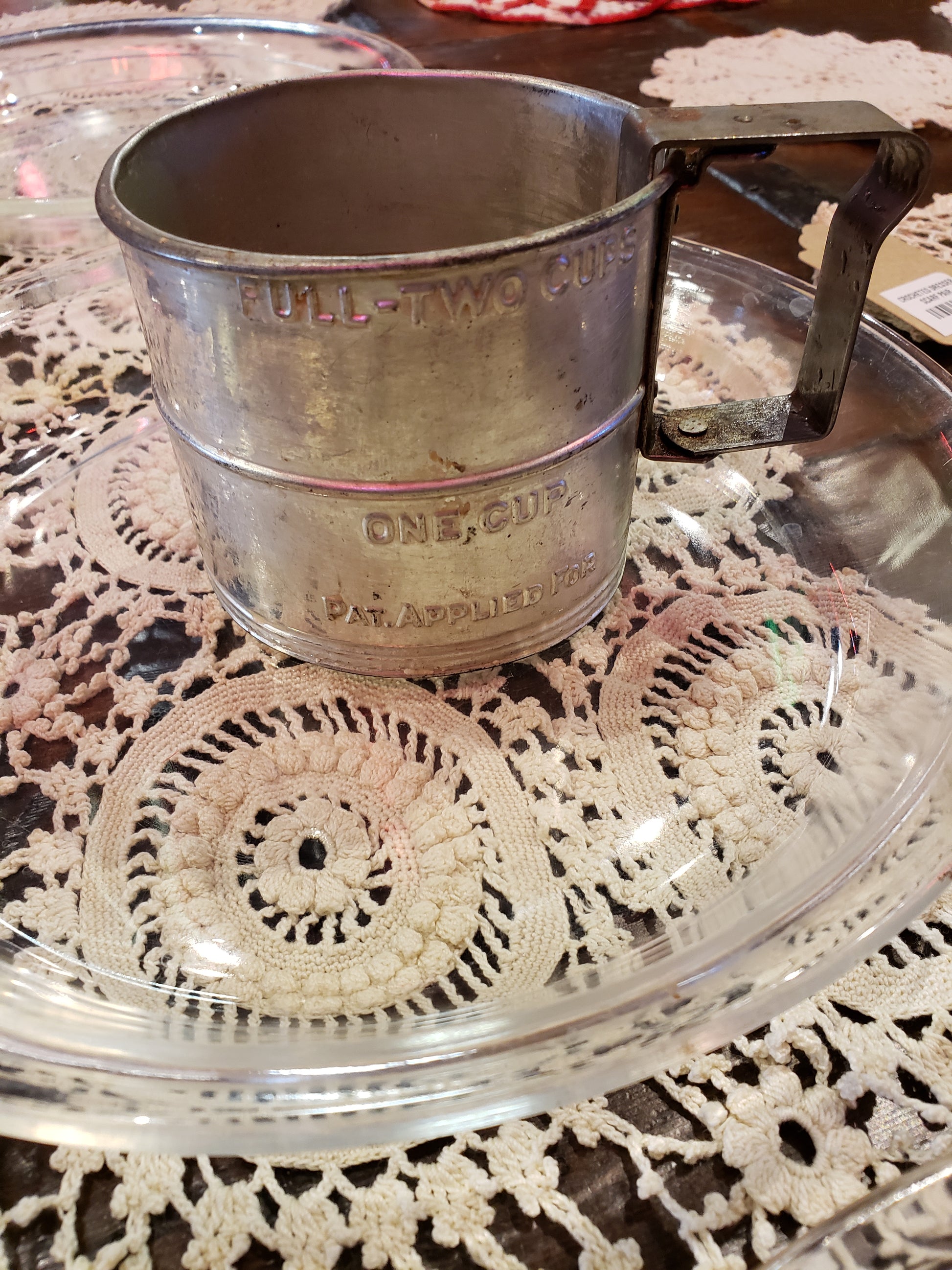 Vintage Flour Sifter uses a side to side sweeping motion to sift flour. 2 cup measure, embossed with "Patent applied for". Measures up to two cups. It has some rusty spots, more for decor than for home use. This is a unique item that would be an nice addition to your farmhouse decor. RED TAG SALE!
