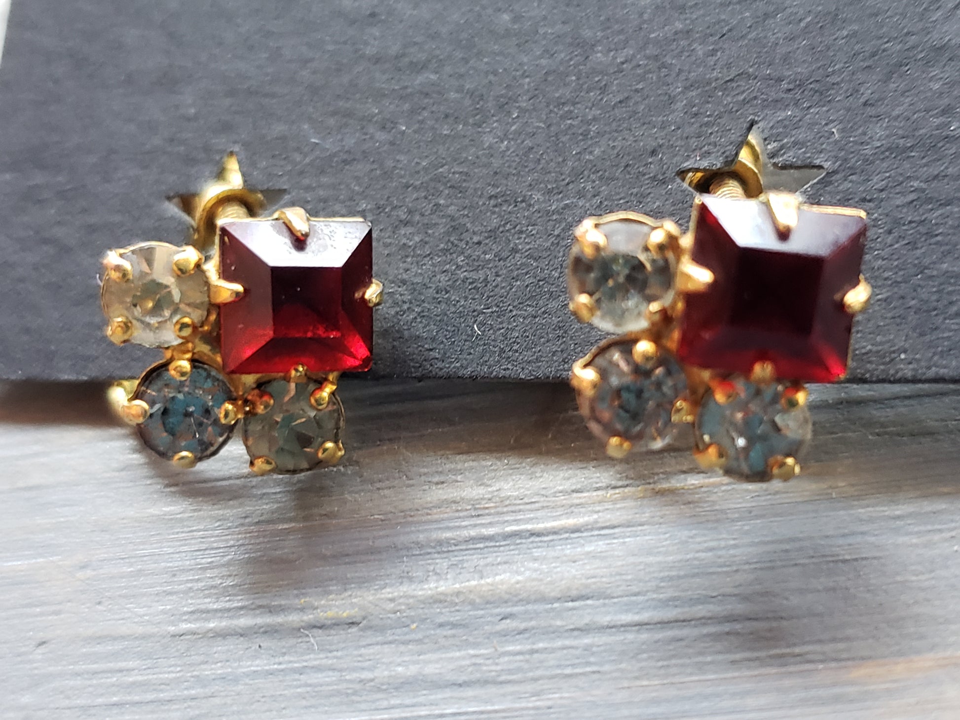 Add a touch of vintage elegance with these red square screw-on earrings, accented by three sparkling clear rhinestones. Their classic design and secure fit make them both beautiful and comfortable, perfect for enhancing any outfit with a subtle yet striking sparkle. Fair vintage condition, no maker's marks. They are very pretty, the pictures do not do them justice. RECENTLY REDUCED PRICE!