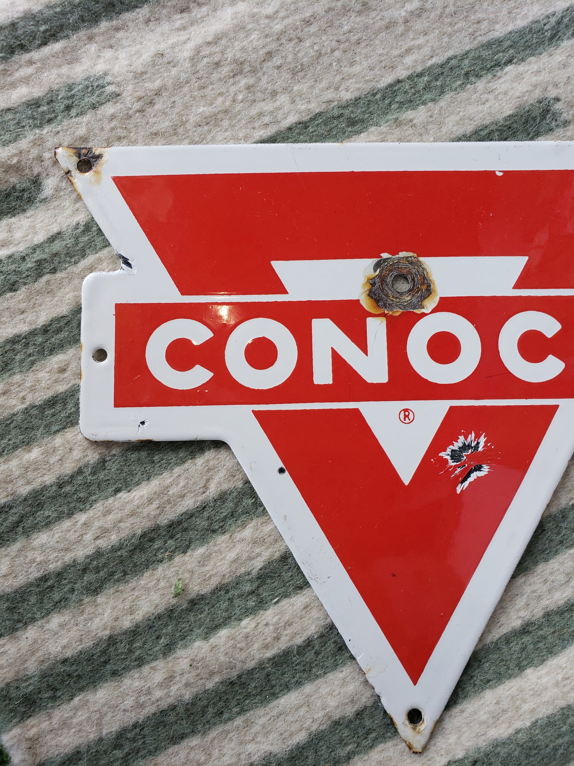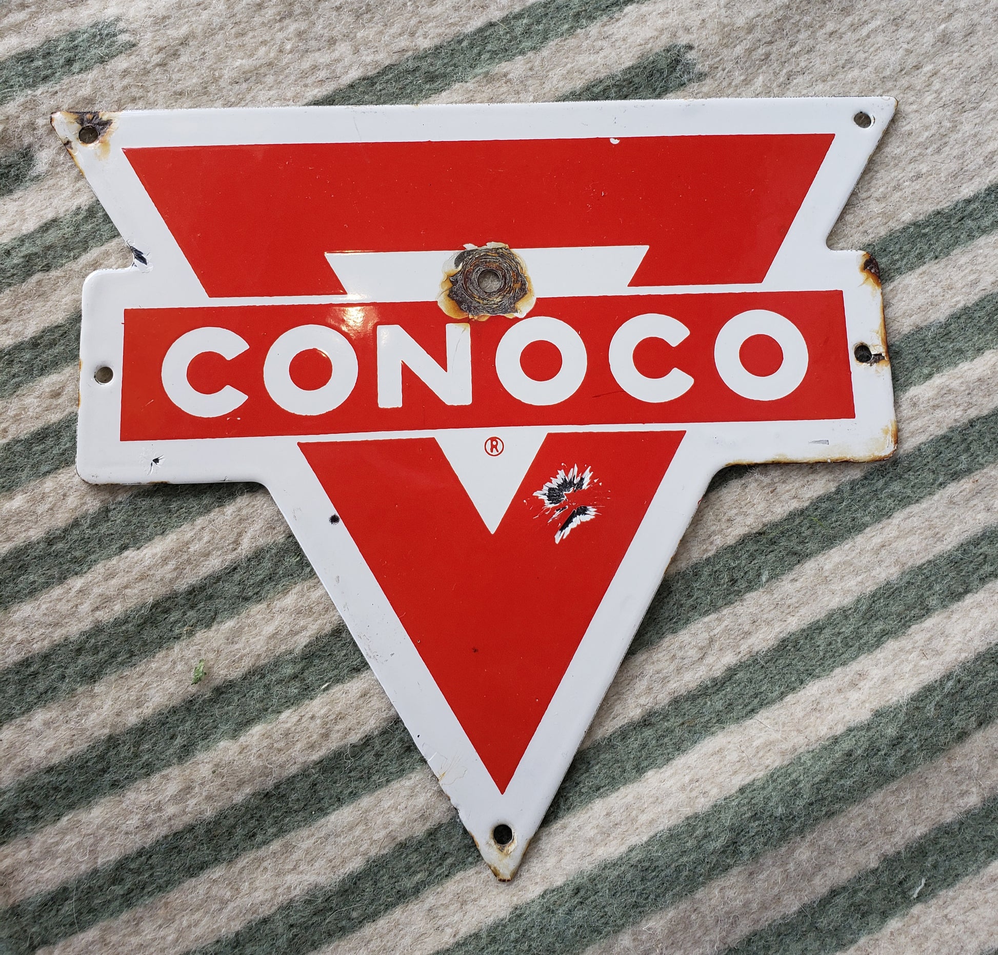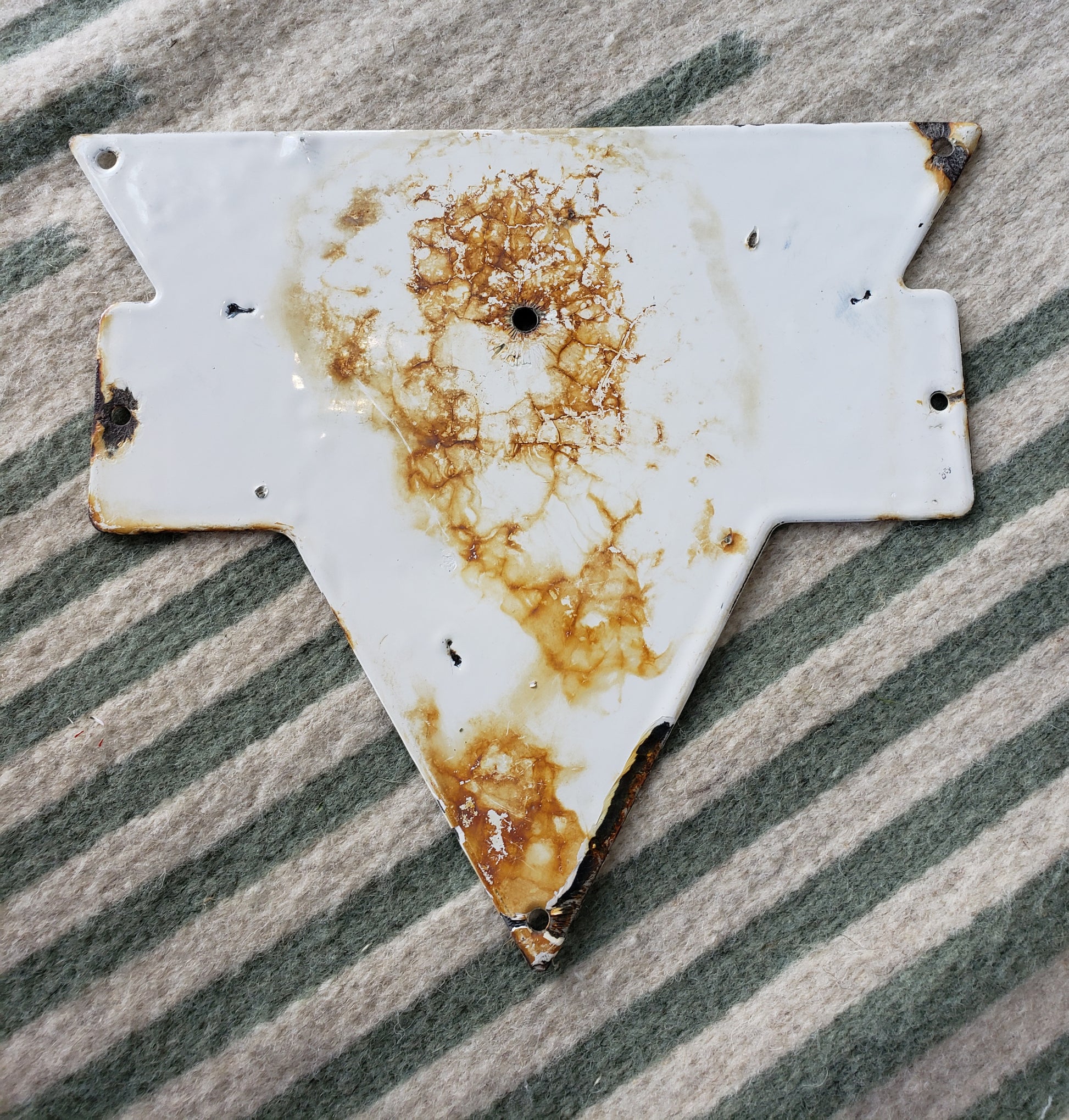 Die Cut Porcelain pump plate from the 1950's. Own a piece of history! This plate is 7.5 x 8.75 inches. Has some scuffs in the porcelain finish, please see photos for details. This pump plate is in fair used condition, and would be a nice colorful addition to your garage or recreation room.