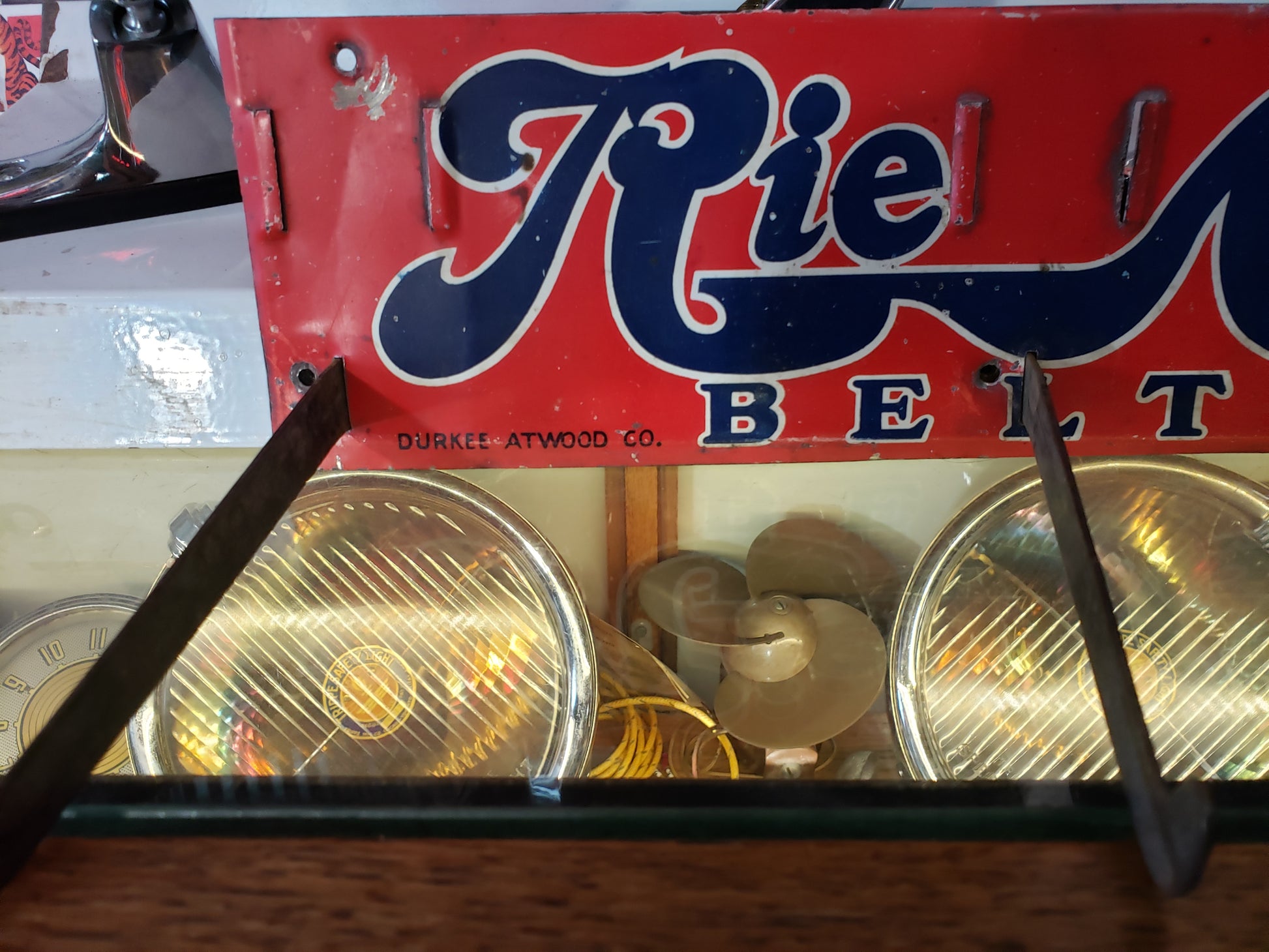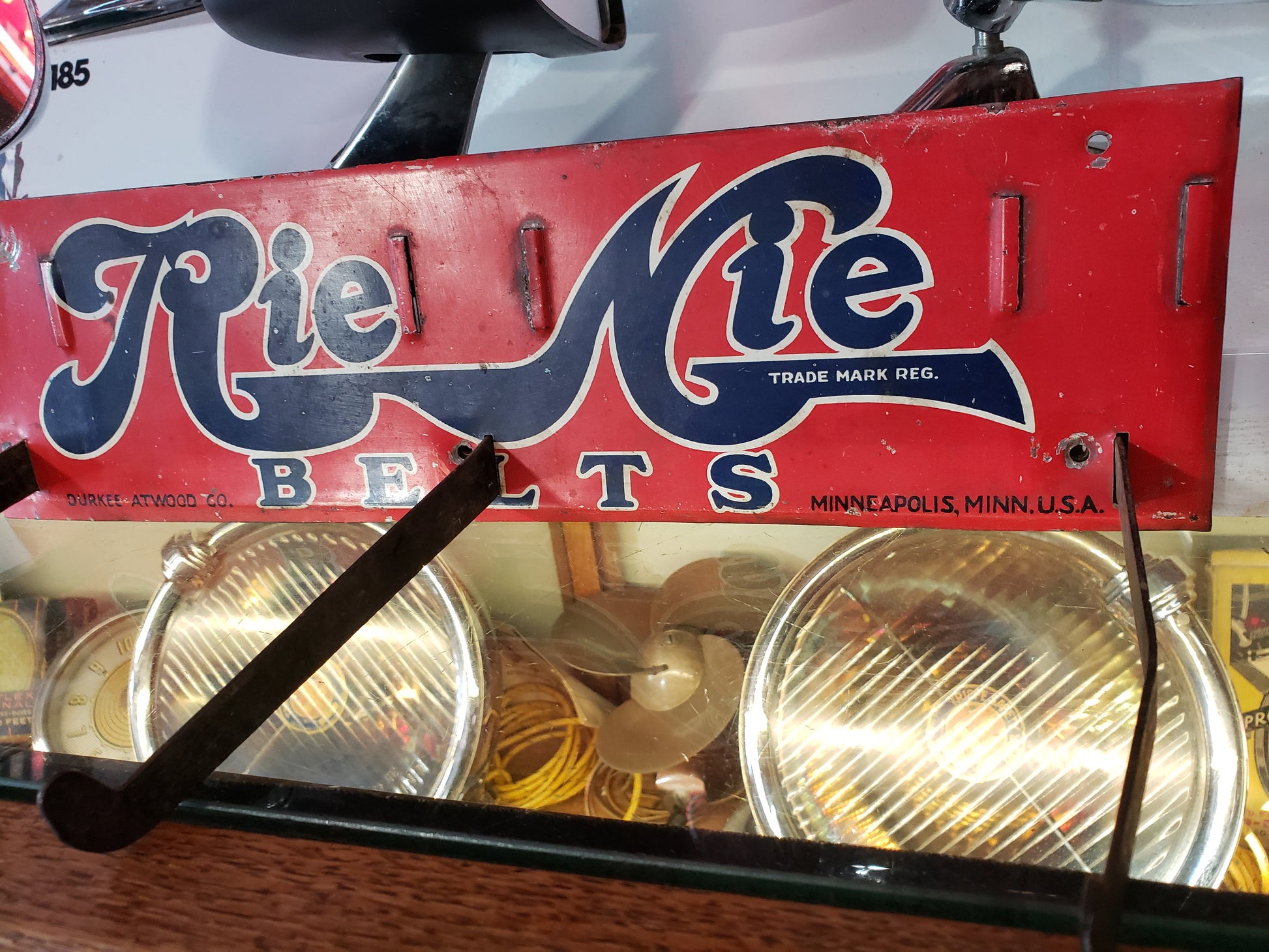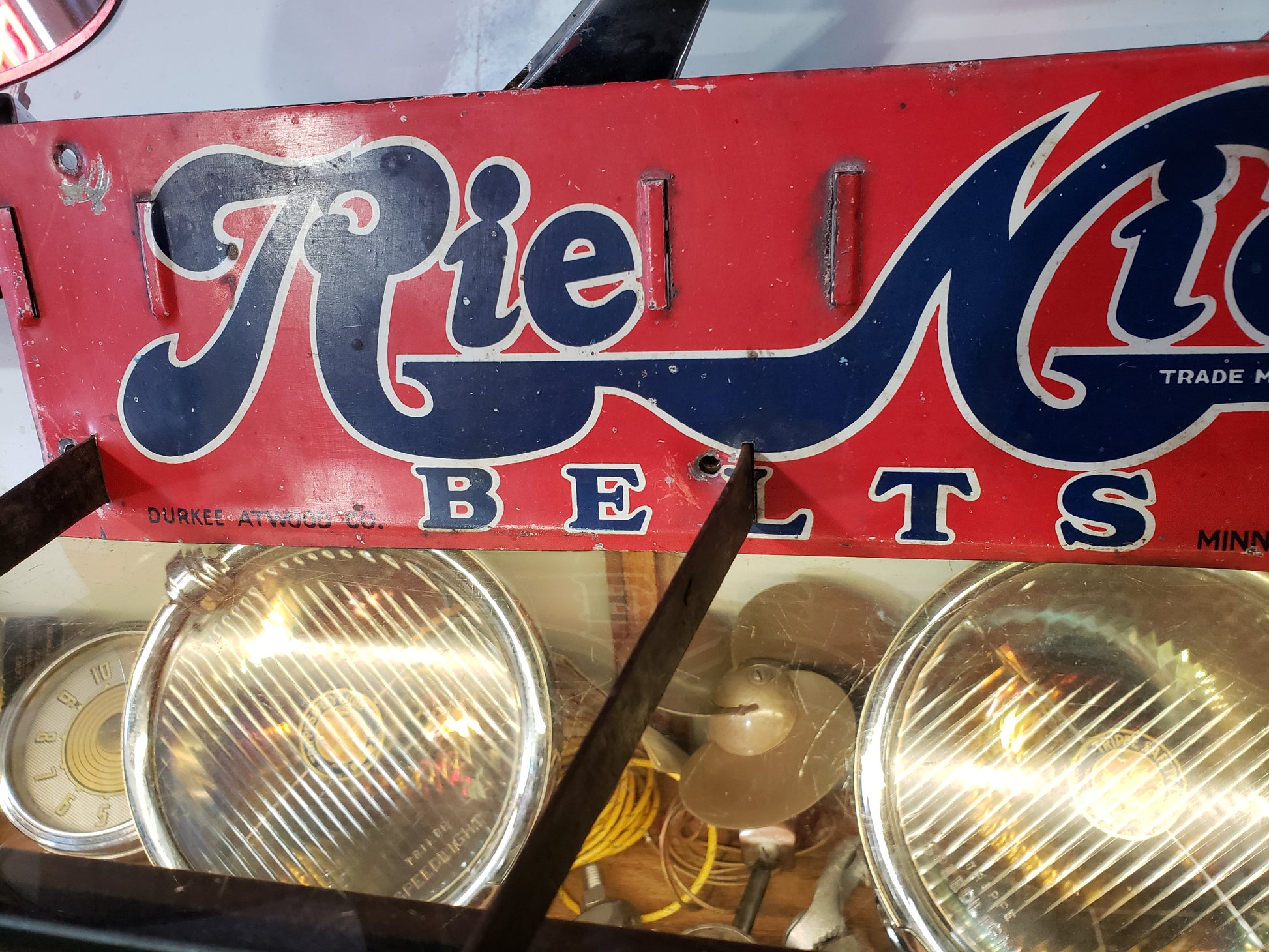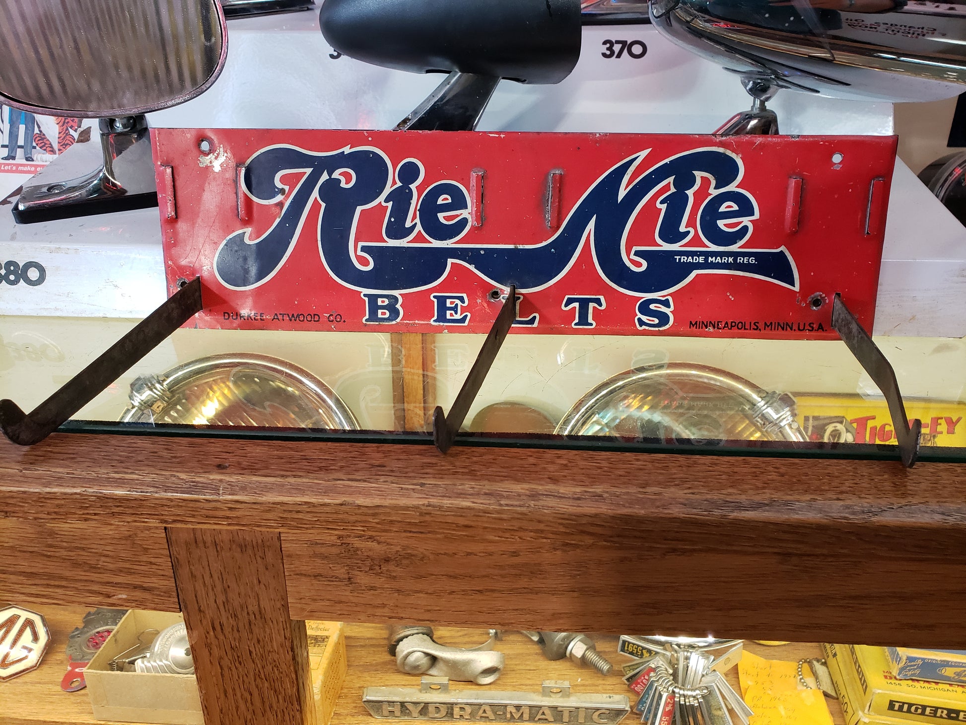 1930's / 1940's era Rie Nie Automotive Belts rack made by Durkee Atwood Co., of Minneapolis Minnesota. Measures Just a tad shy of 14 x 4 inches with three bars for holding fan belts. Could be used in your garage or repurposed in your house. Red with blue and white lettering, has some rust spots around the mounting holes. Fair used condition.