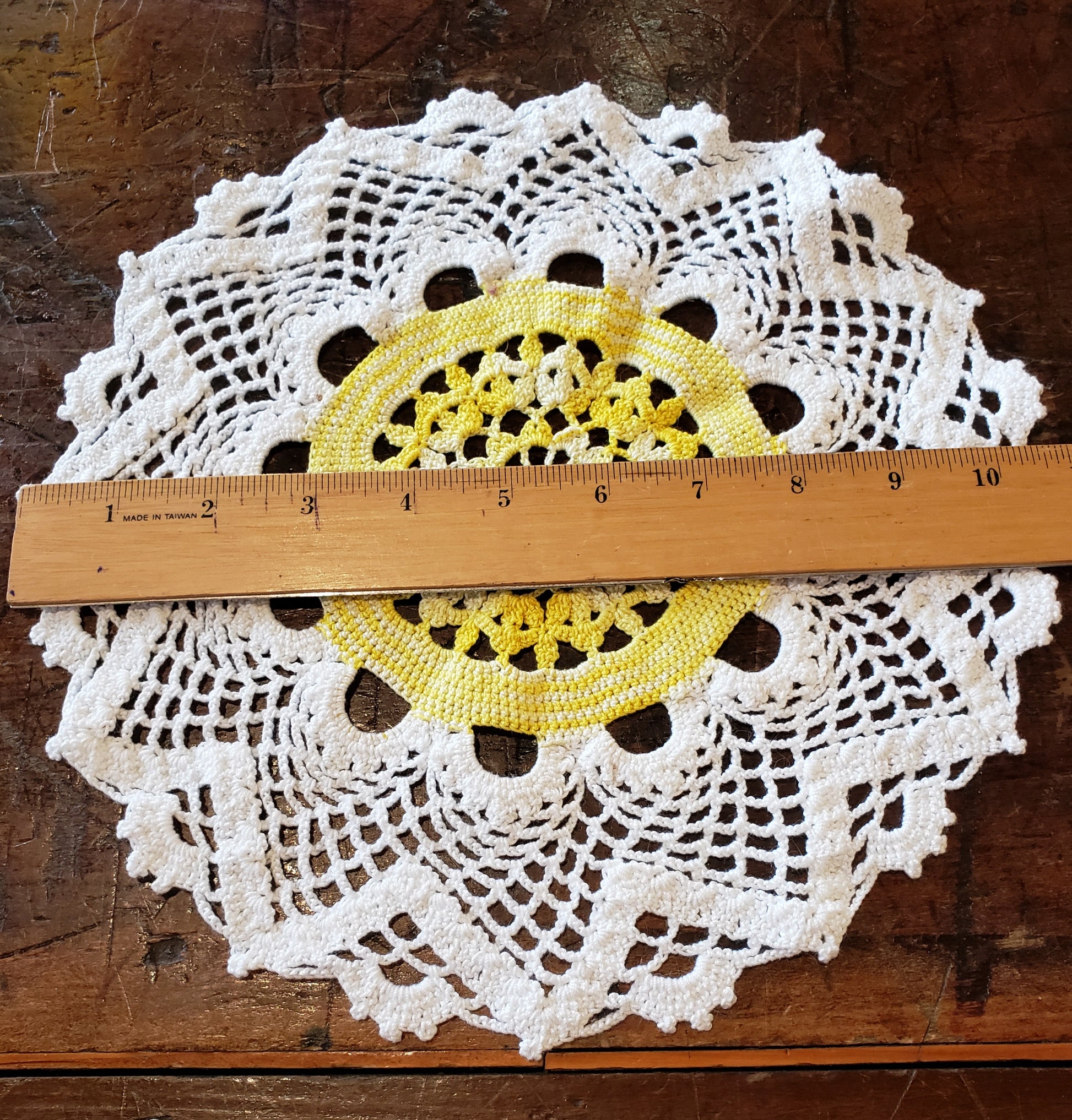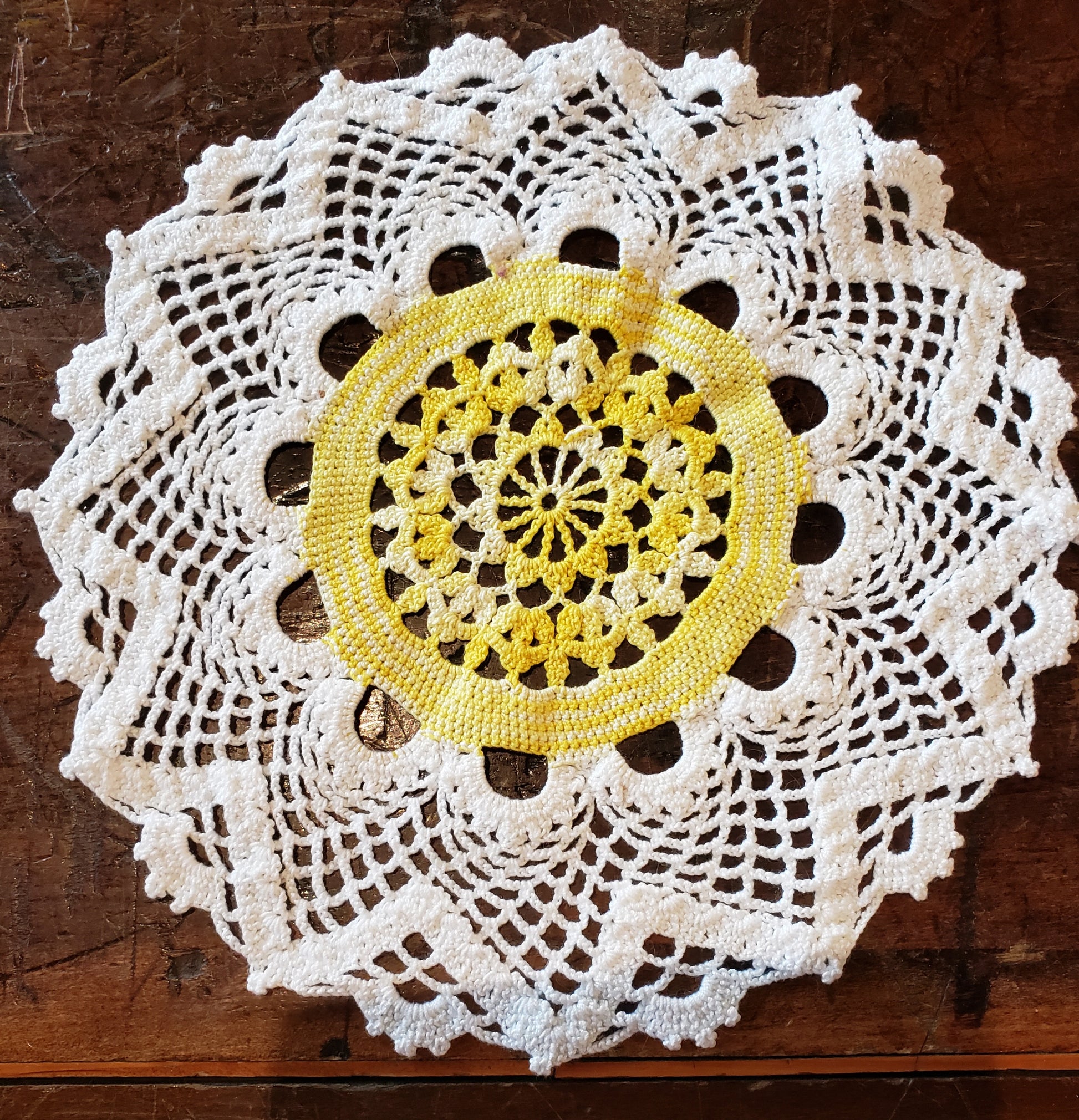 Round white and yellow doily