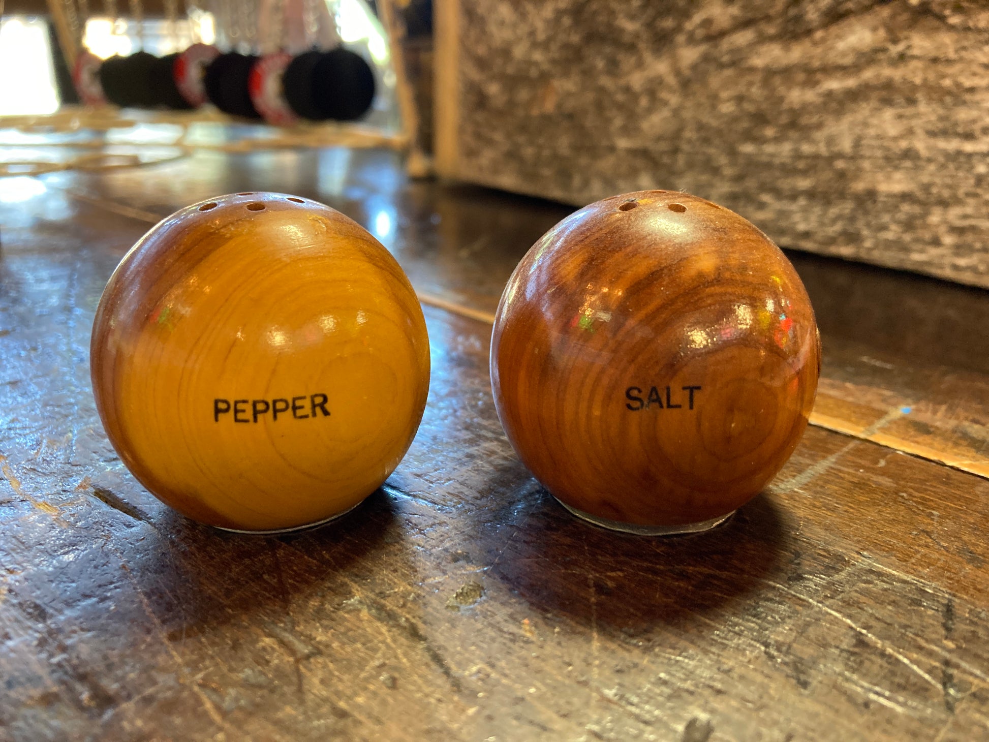 Round Wood Salt/Pepper Shaker Set is 2 inches in diameter with a pretty woodgrain. Metal stoppers. Fair vintage condition.