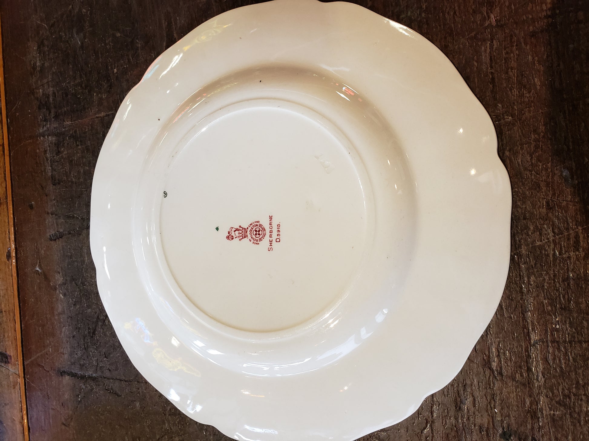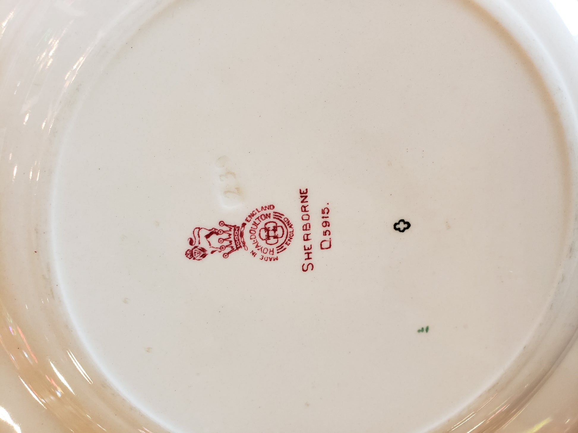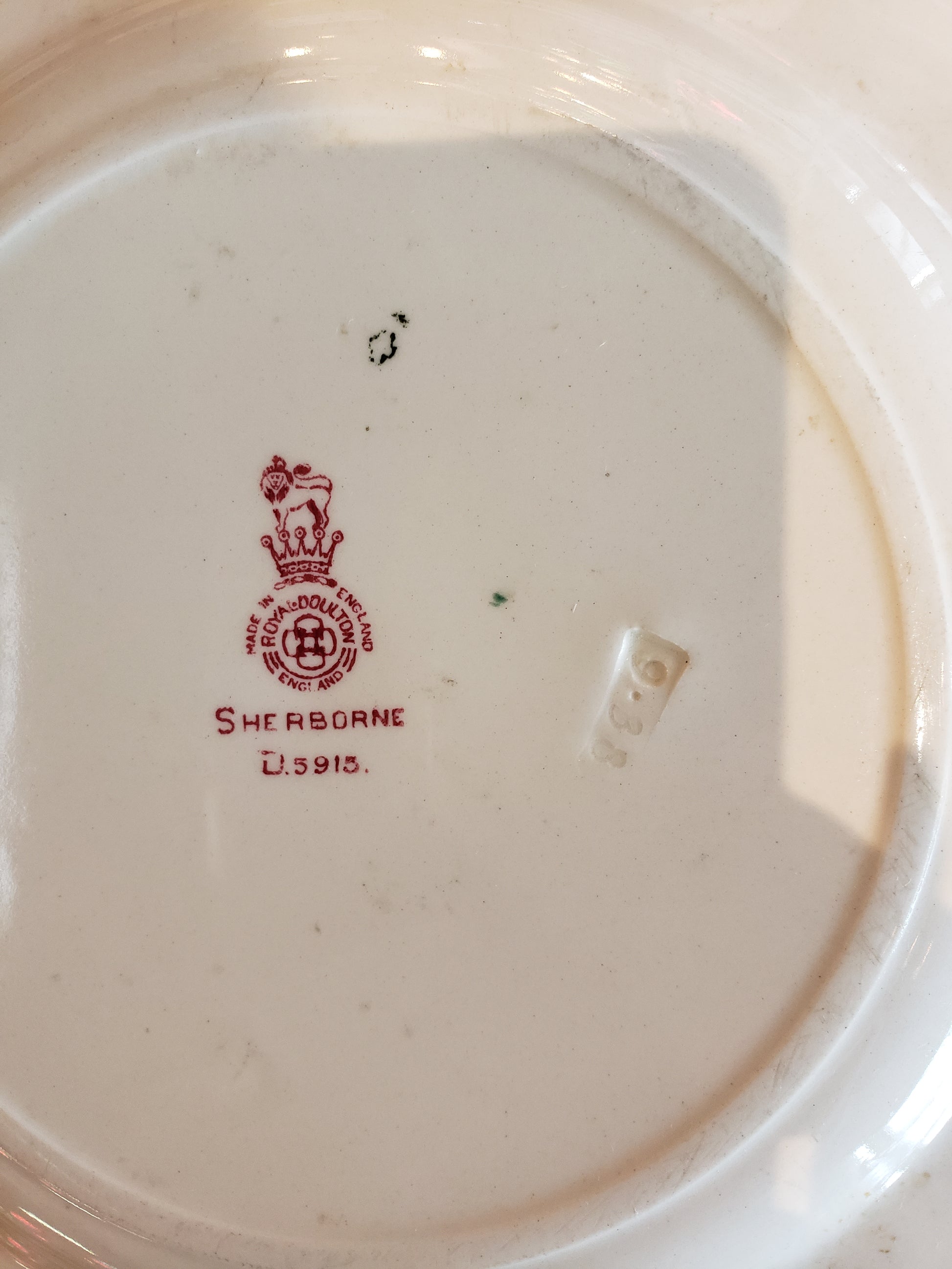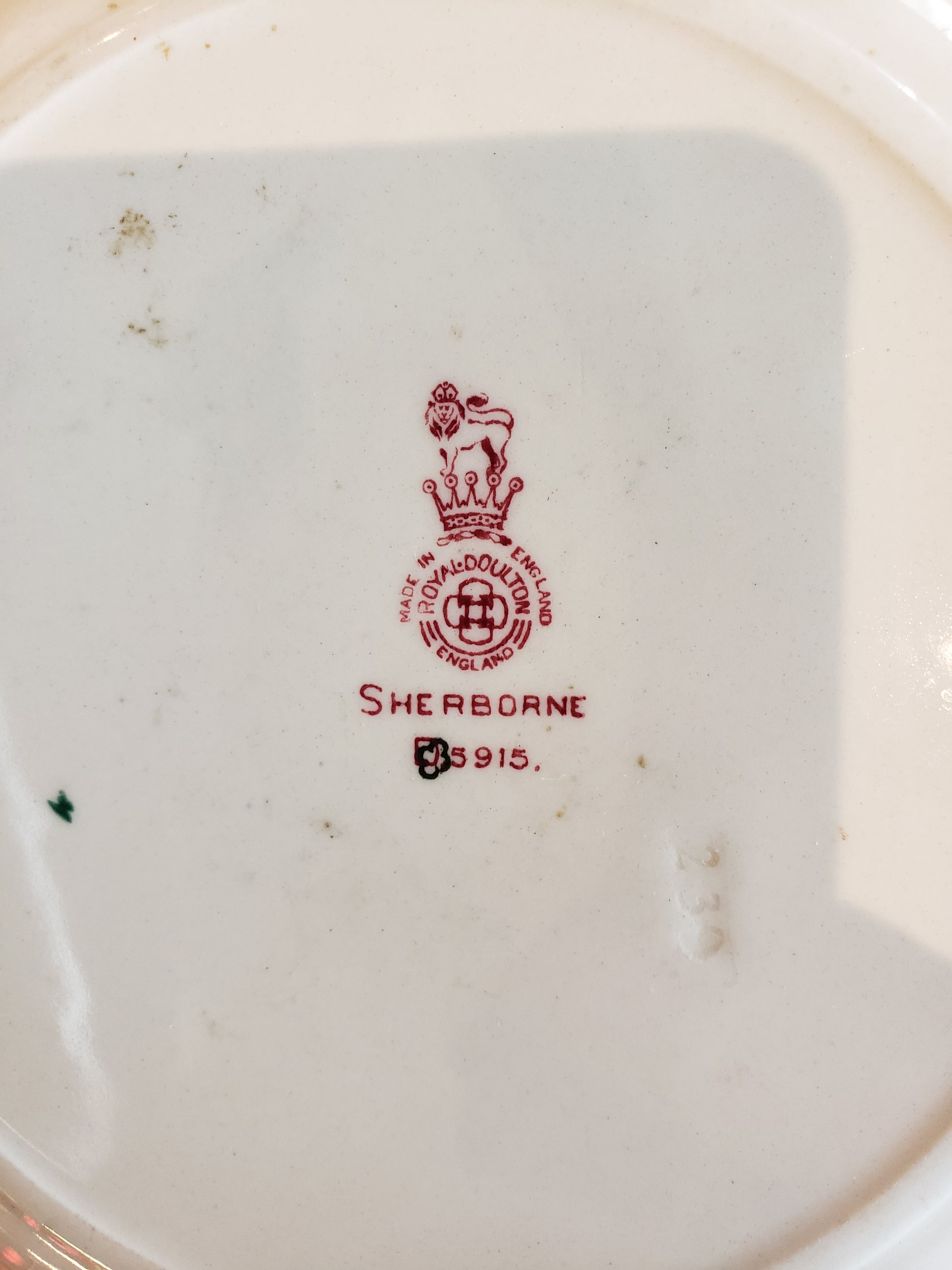 Lovely floral plates, teacups and saucers made by Royal Doulton of England in the Sherbourne pattern. They each have the Royal Doulton logo on the back and D5915. There are 4 9.25 inch diameter salad plates and 4 10 inch diameter dinner plates. 2 saucers and four tea cups. They have been used, there is light wear on the eating surface. These are beautiful plates with a purple, pink and yellow floral pattern. This set is in fair vintage condition. RED TAG SALE!
