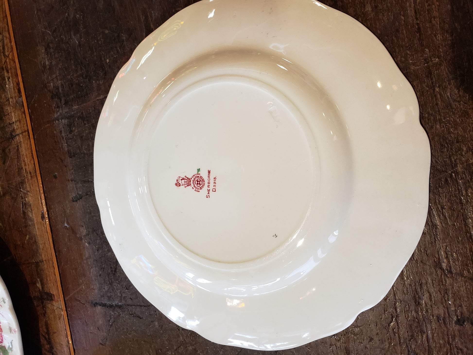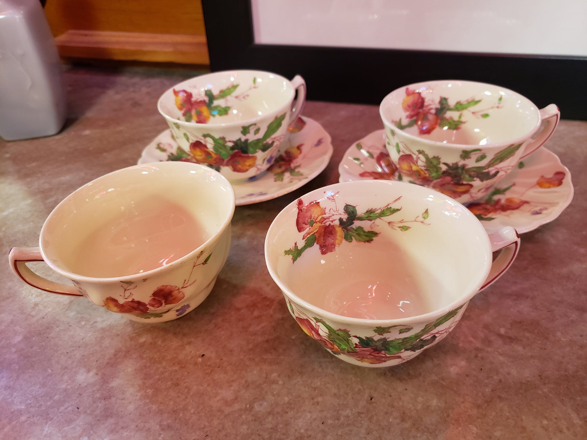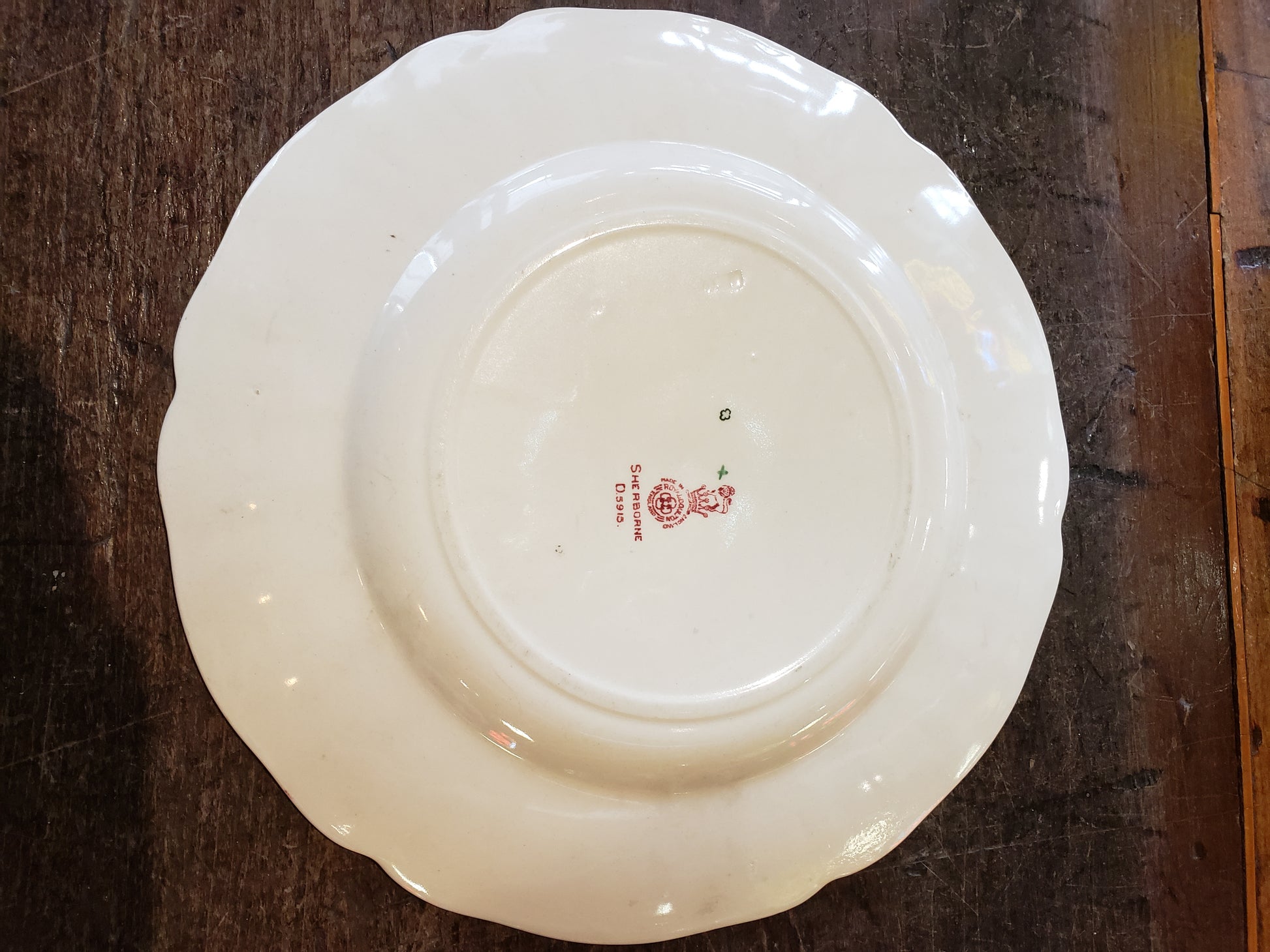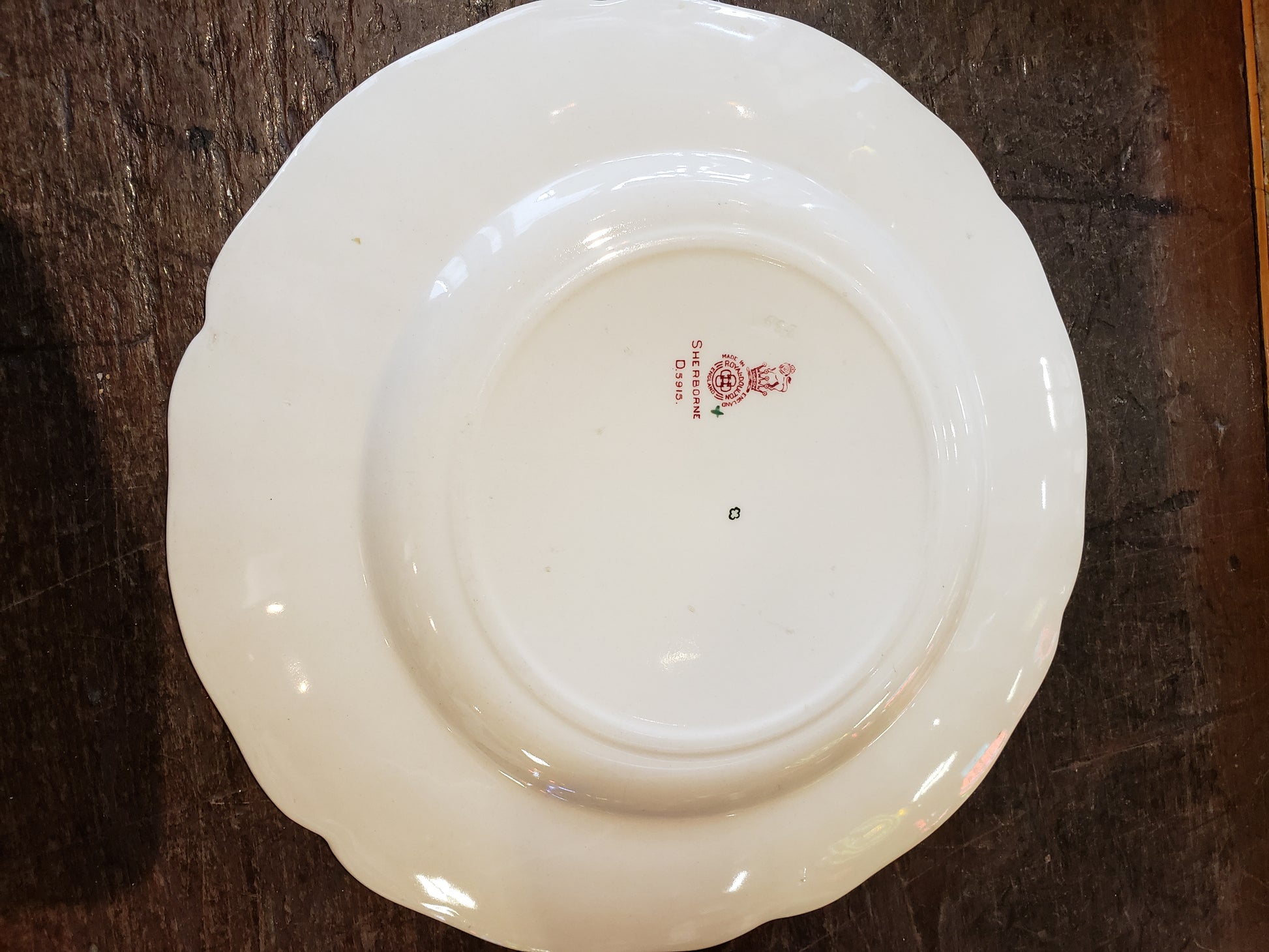 Lovely floral plates, teacups and saucers made by Royal Doulton of England in the Sherbourne pattern. They each have the Royal Doulton logo on the back and D5915. There are 4 9.25 inch diameter salad plates and 4 10 inch diameter dinner plates. 2 saucers and four tea cups. They have been used, there is light wear on the eating surface. These are beautiful plates with a purple, pink and yellow floral pattern. This set is in fair vintage condition. RED TAG SALE!