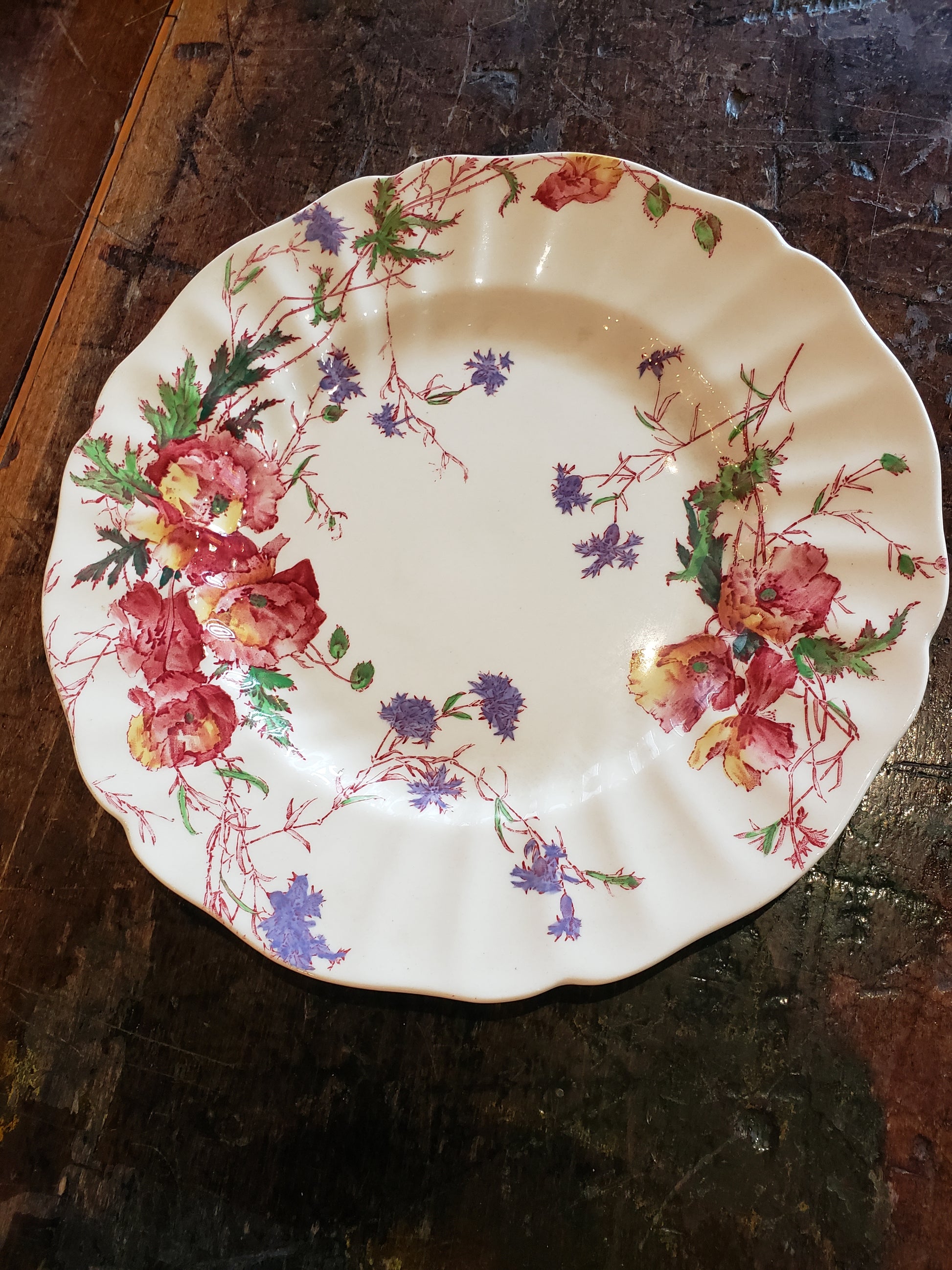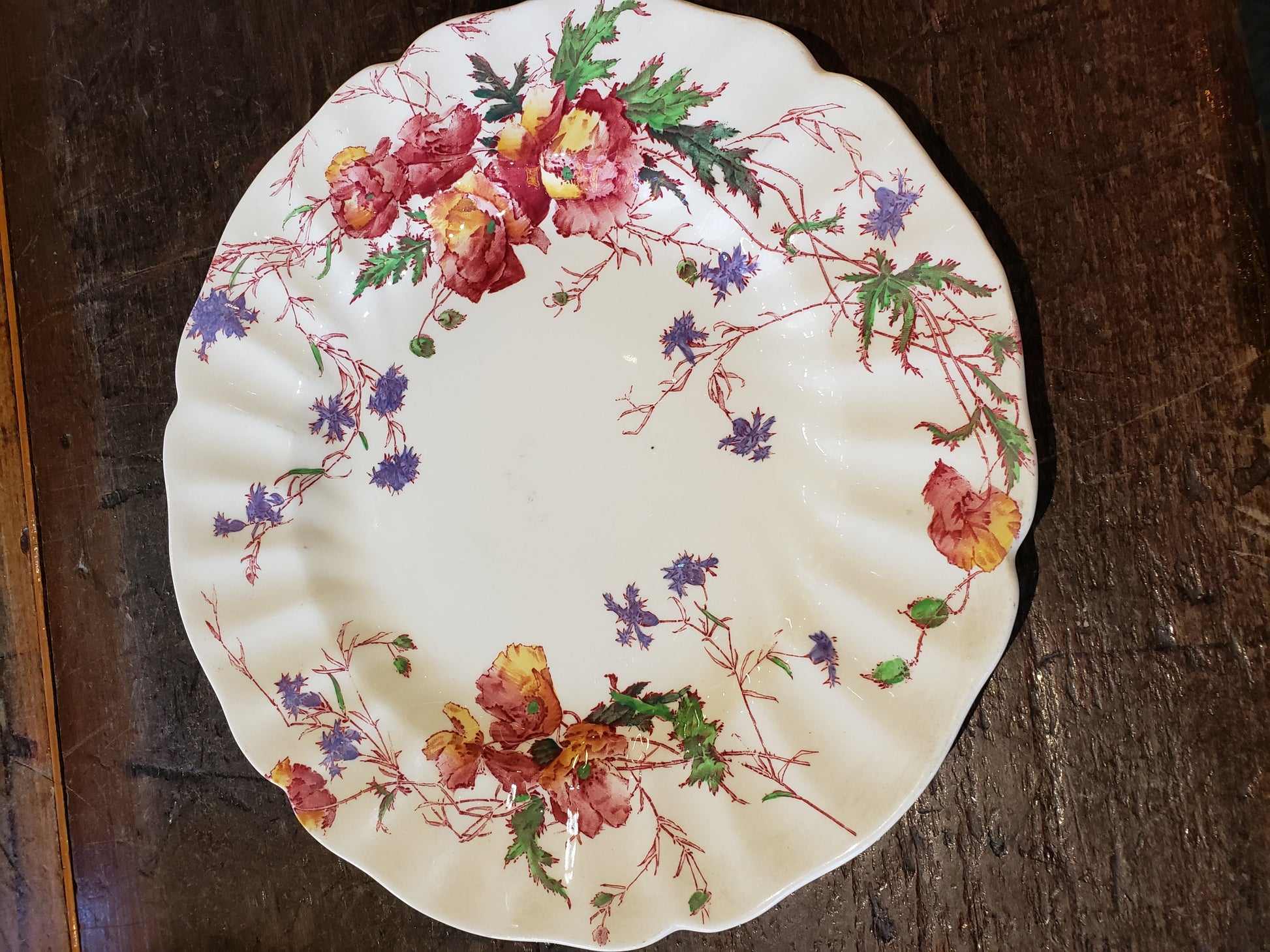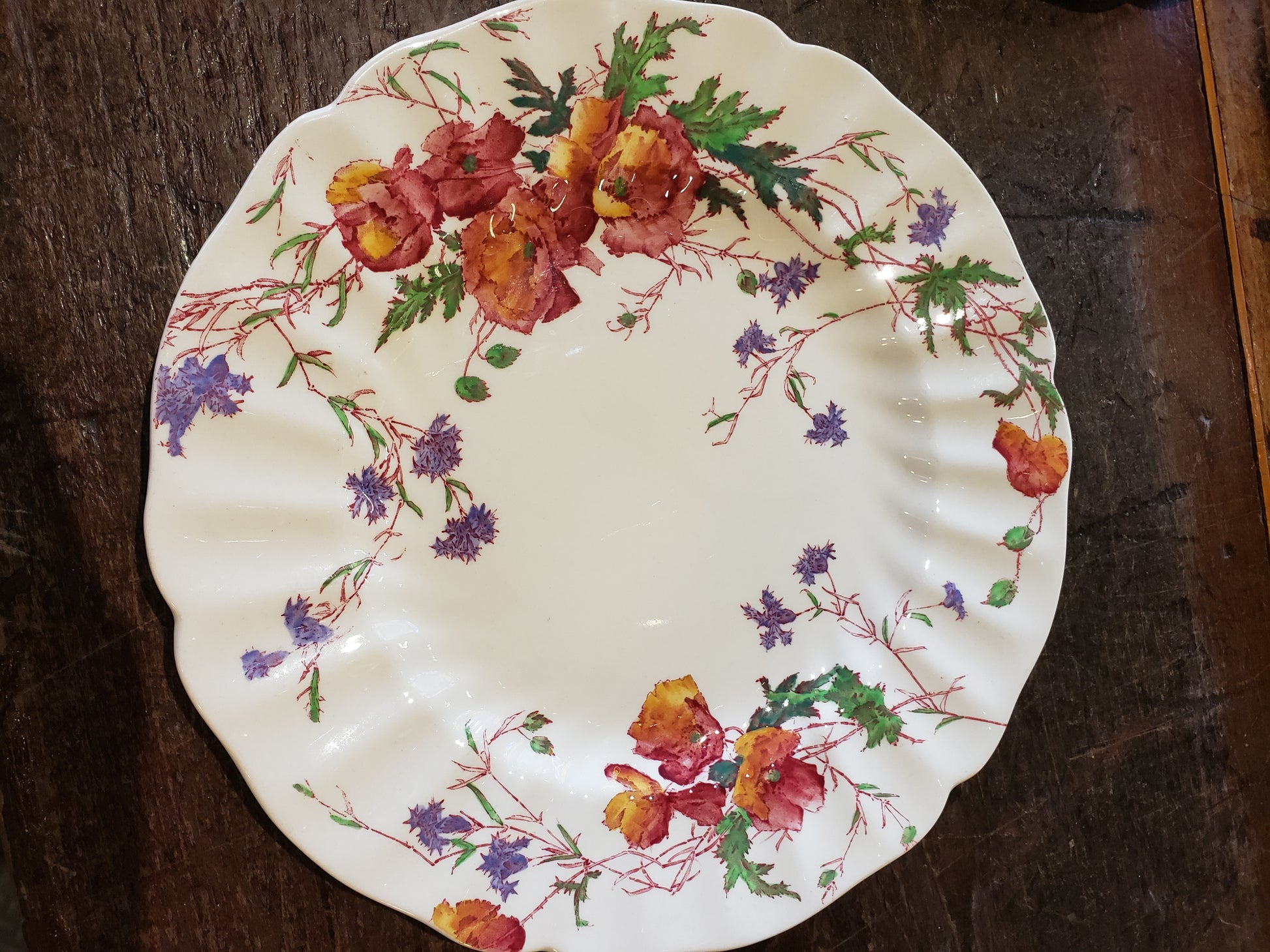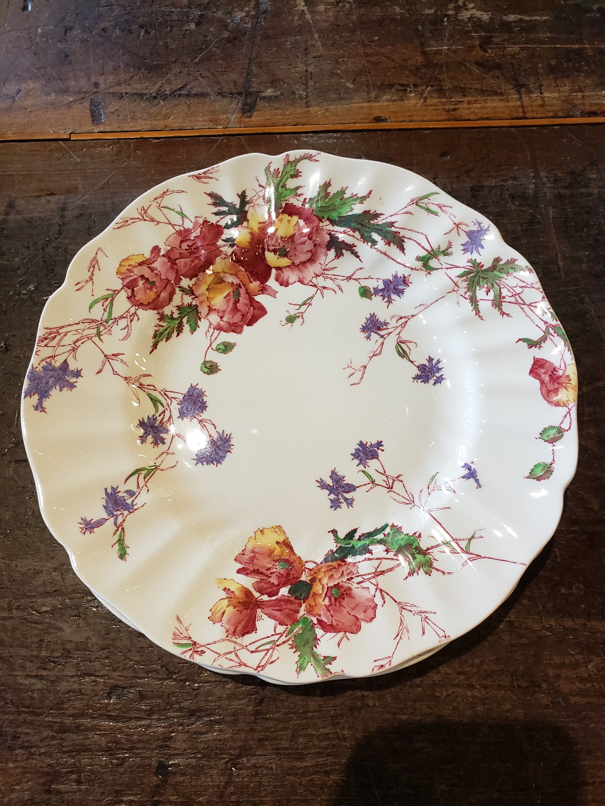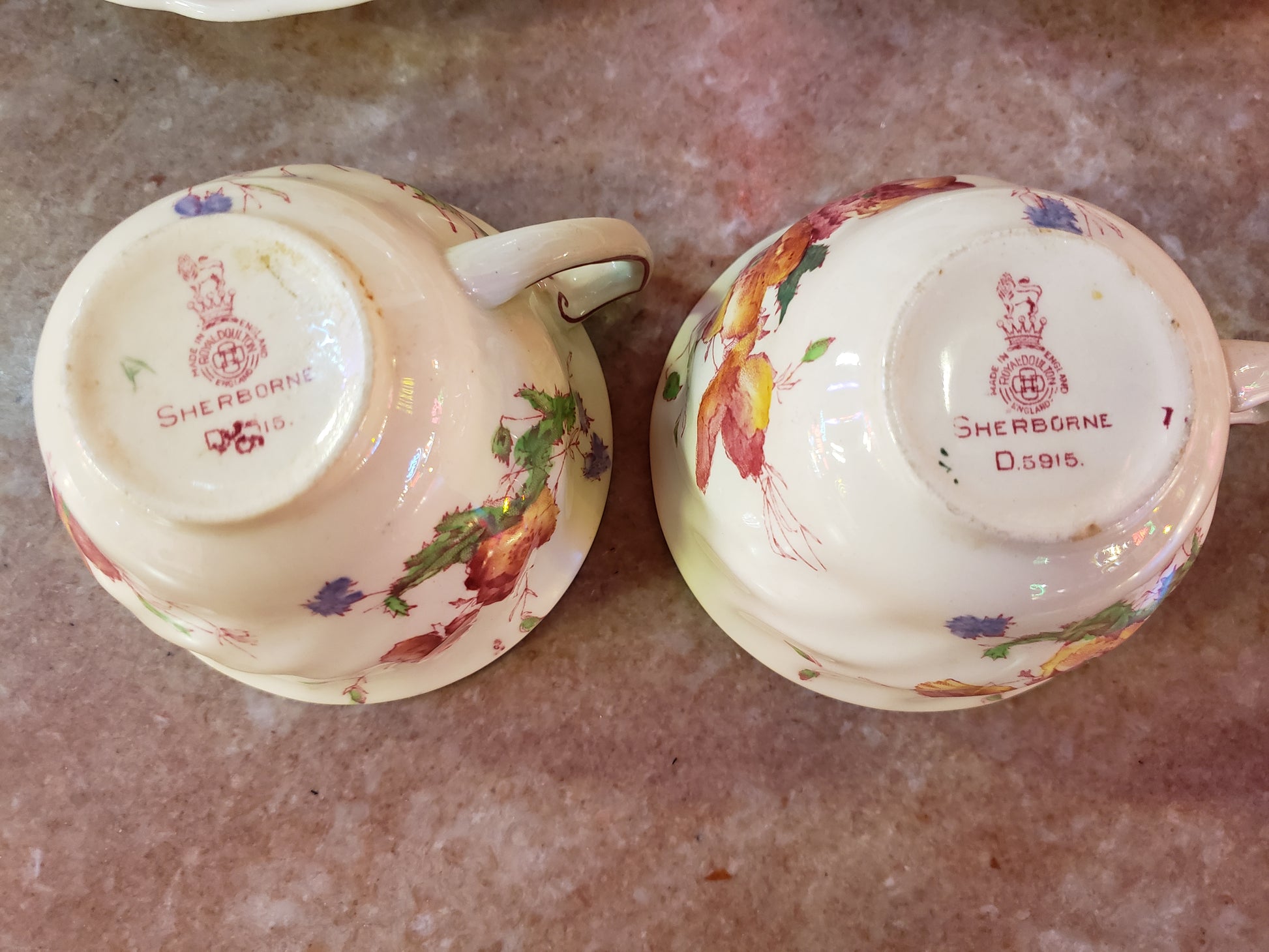 Lovely floral plates, teacups and saucers made by Royal Doulton of England in the Sherbourne pattern. They each have the Royal Doulton logo on the back and D5915. There are 4 9.25 inch diameter salad plates and 4 10 inch diameter dinner plates. 2 saucers and four tea cups. They have been used, there is light wear on the eating surface. These are beautiful plates with a purple, pink and yellow floral pattern. This set is in fair vintage condition. RED TAG SALE!
