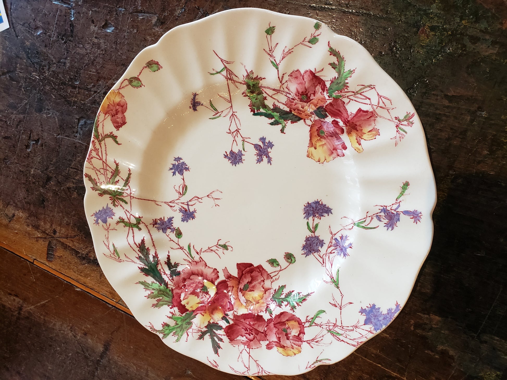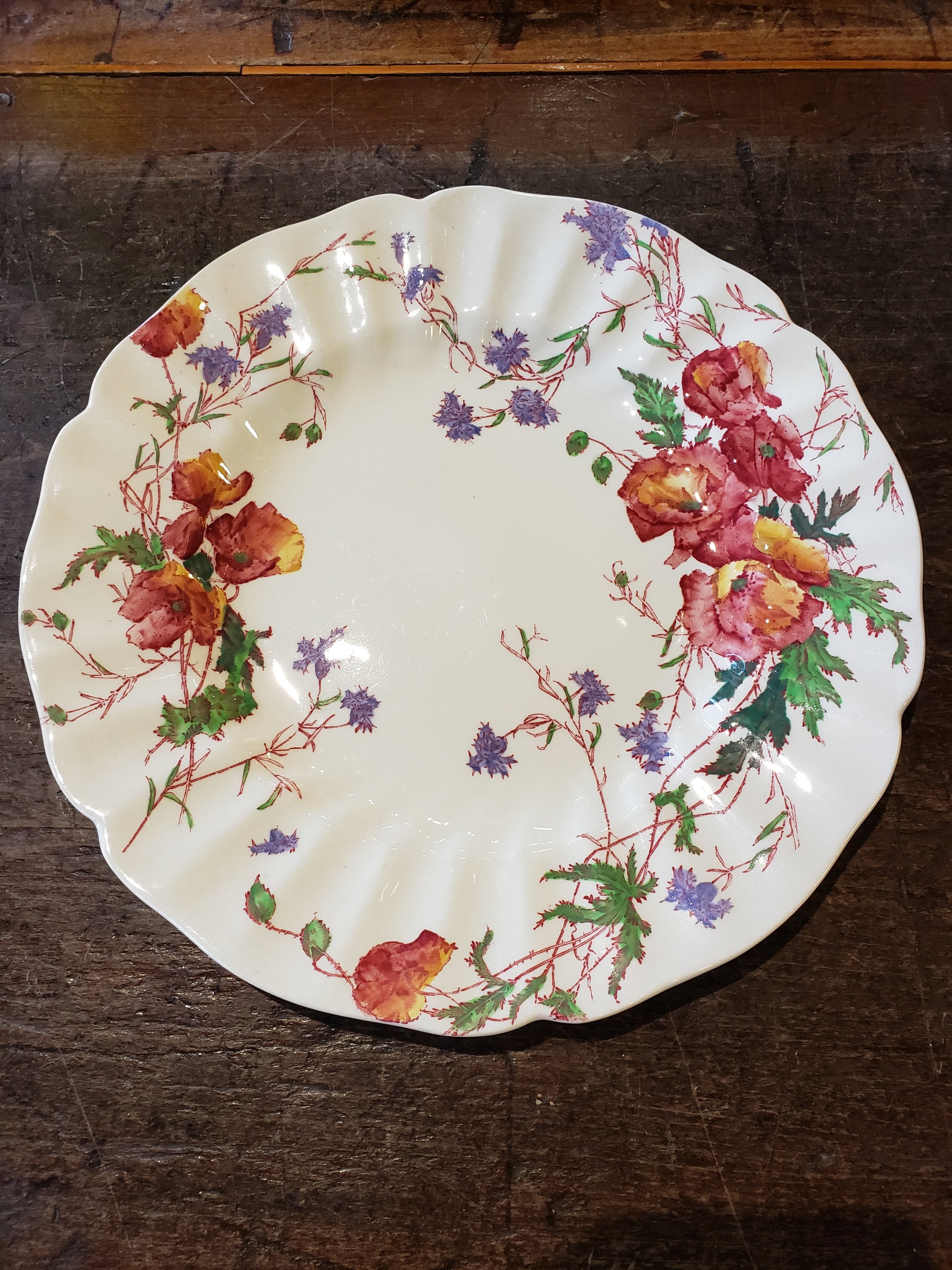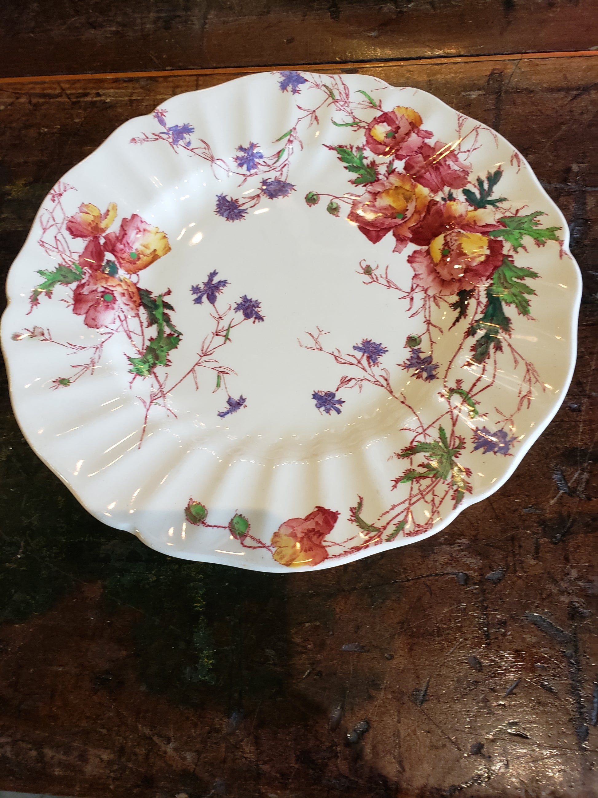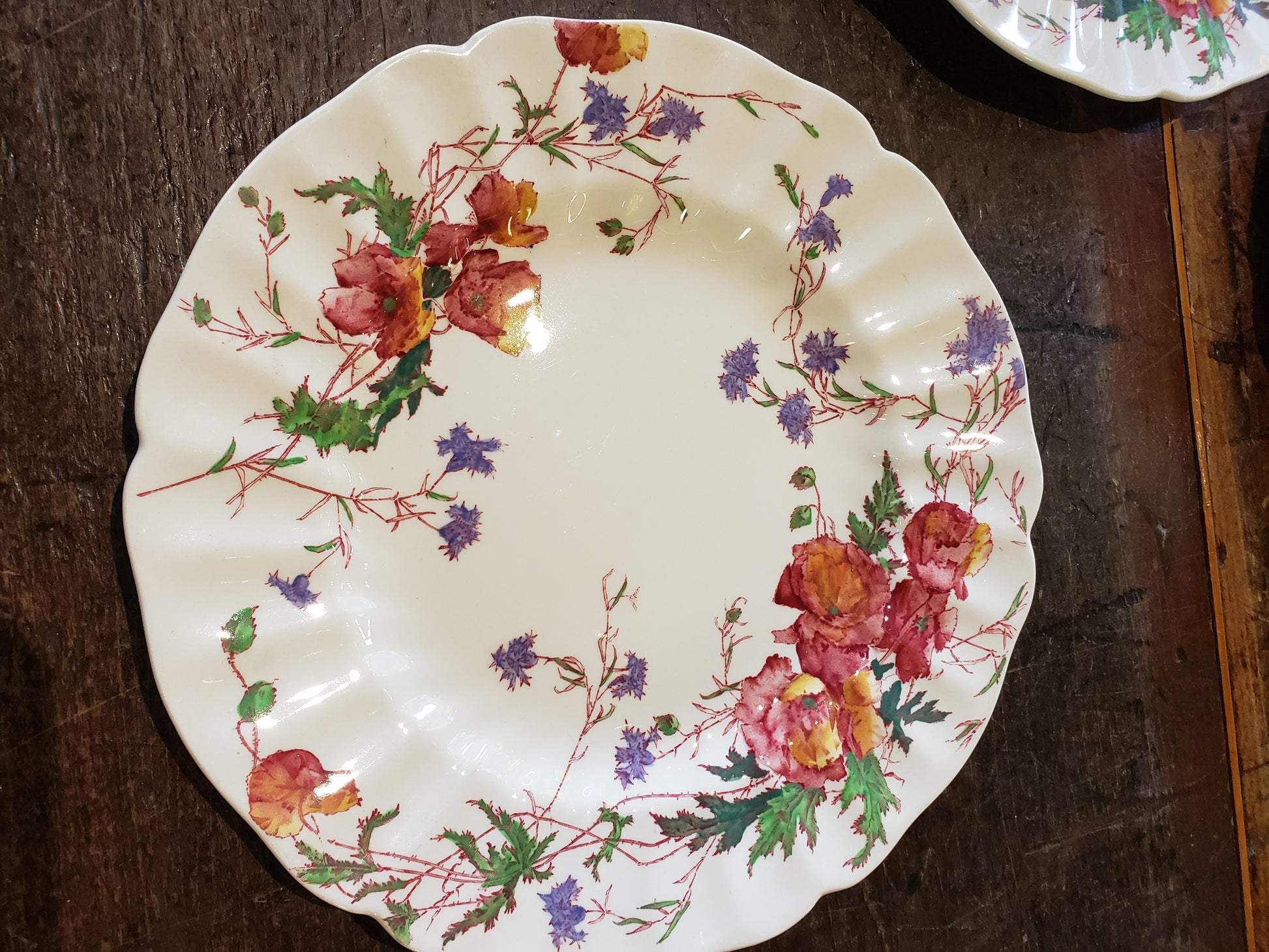 Lovely floral plates, teacups and saucers made by Royal Doulton of England in the Sherbourne pattern. They each have the Royal Doulton logo on the back and D5915. There are 4 9.25 inch diameter salad plates and 4 10 inch diameter dinner plates. 2 saucers and four tea cups. They have been used, there is light wear on the eating surface. These are beautiful plates with a purple, pink and yellow floral pattern. This set is in fair vintage condition. RED TAG SALE!