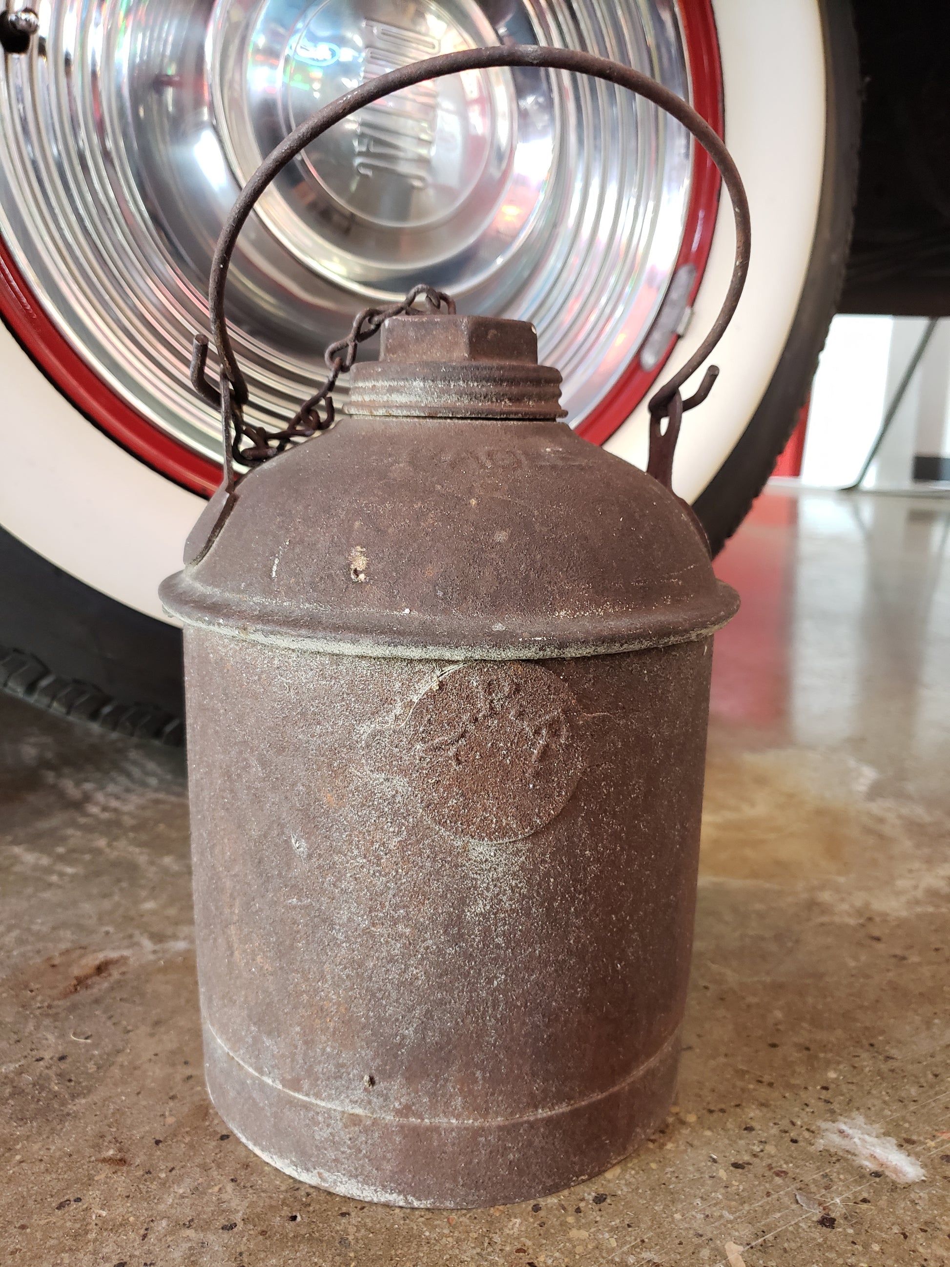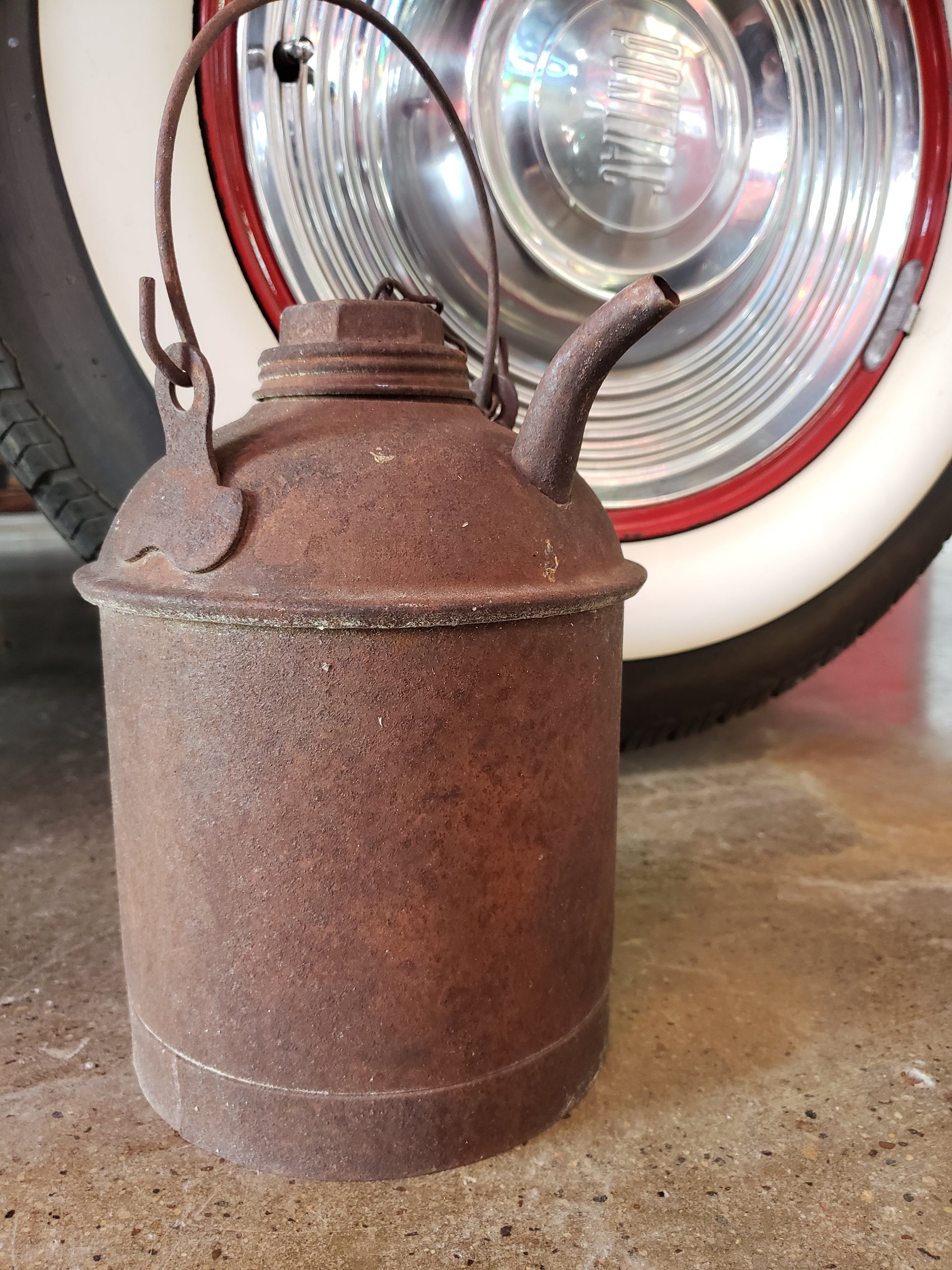 Vintage rusty Eagle Gas Can used by the railroad. Bottom is rusted through and lid is stuck, for decoration only. Fair vintage condition. It stands 13 inches tall including the handle.