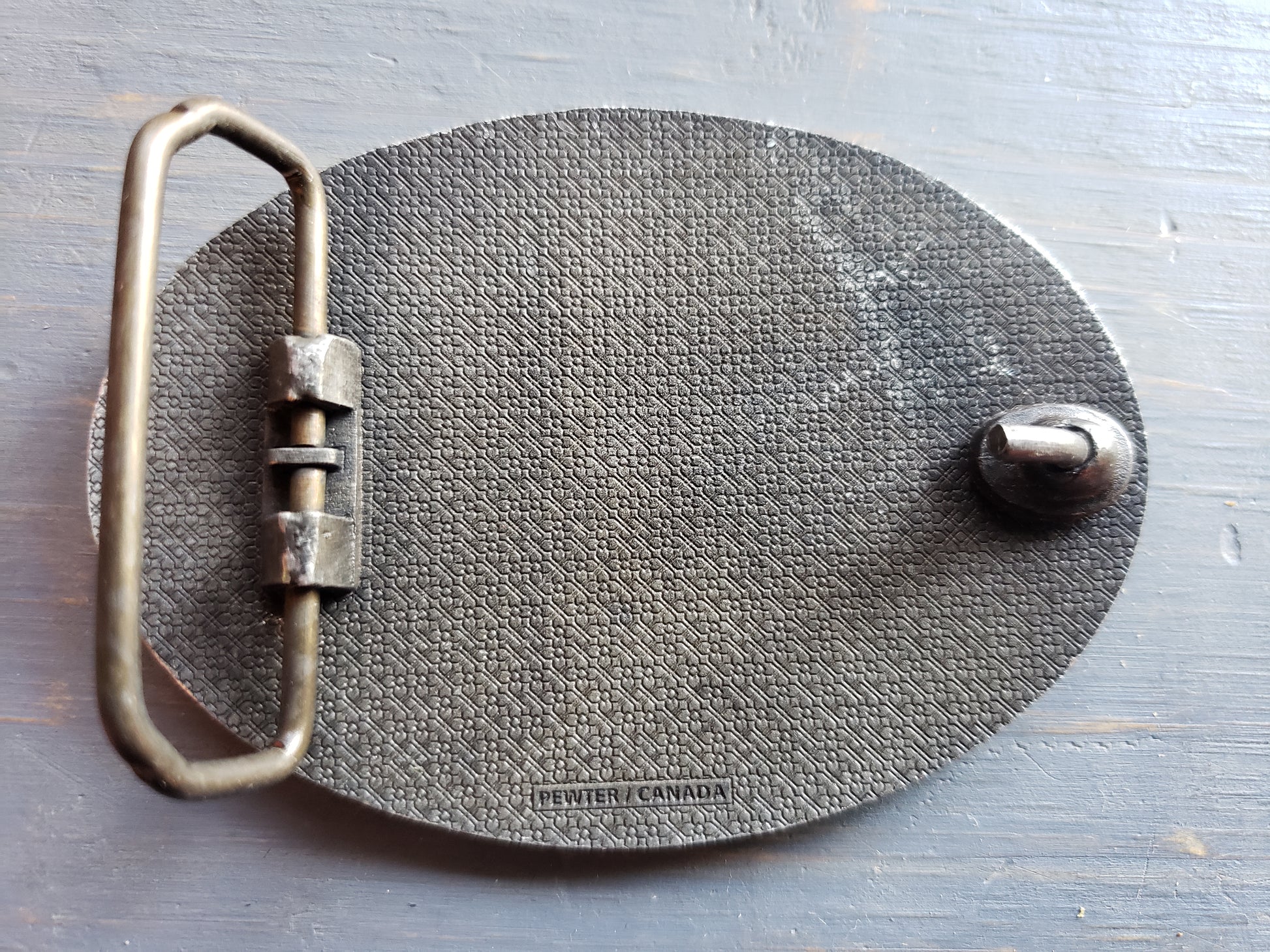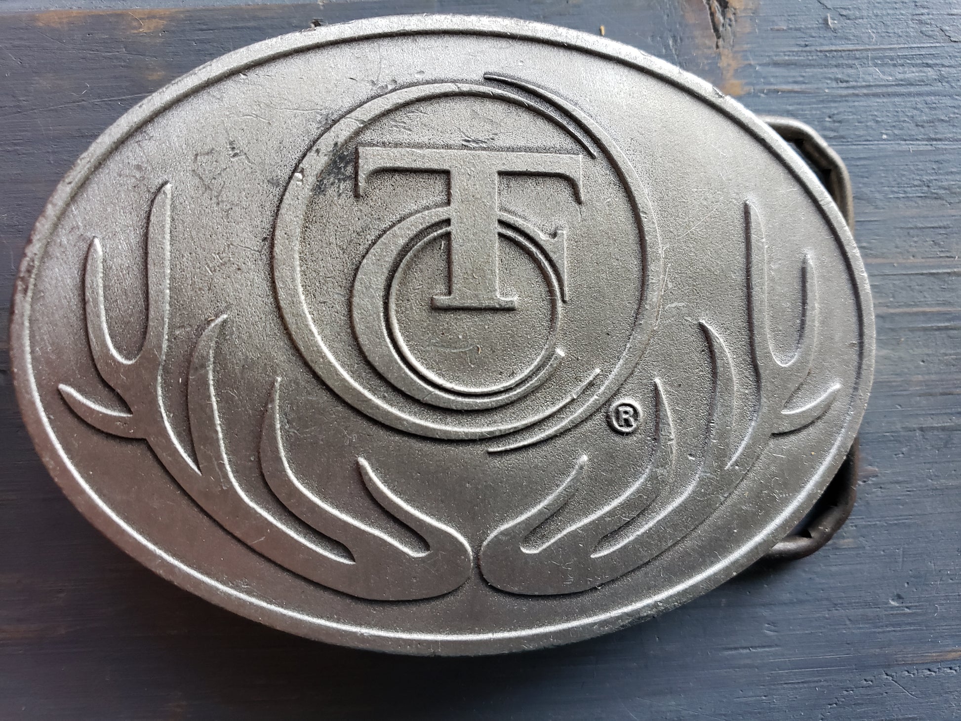 Vintage belt buckle advertising Thompson Center Arms. Silver colored metal, fair vintage condition. Wear a piece of firearm history.