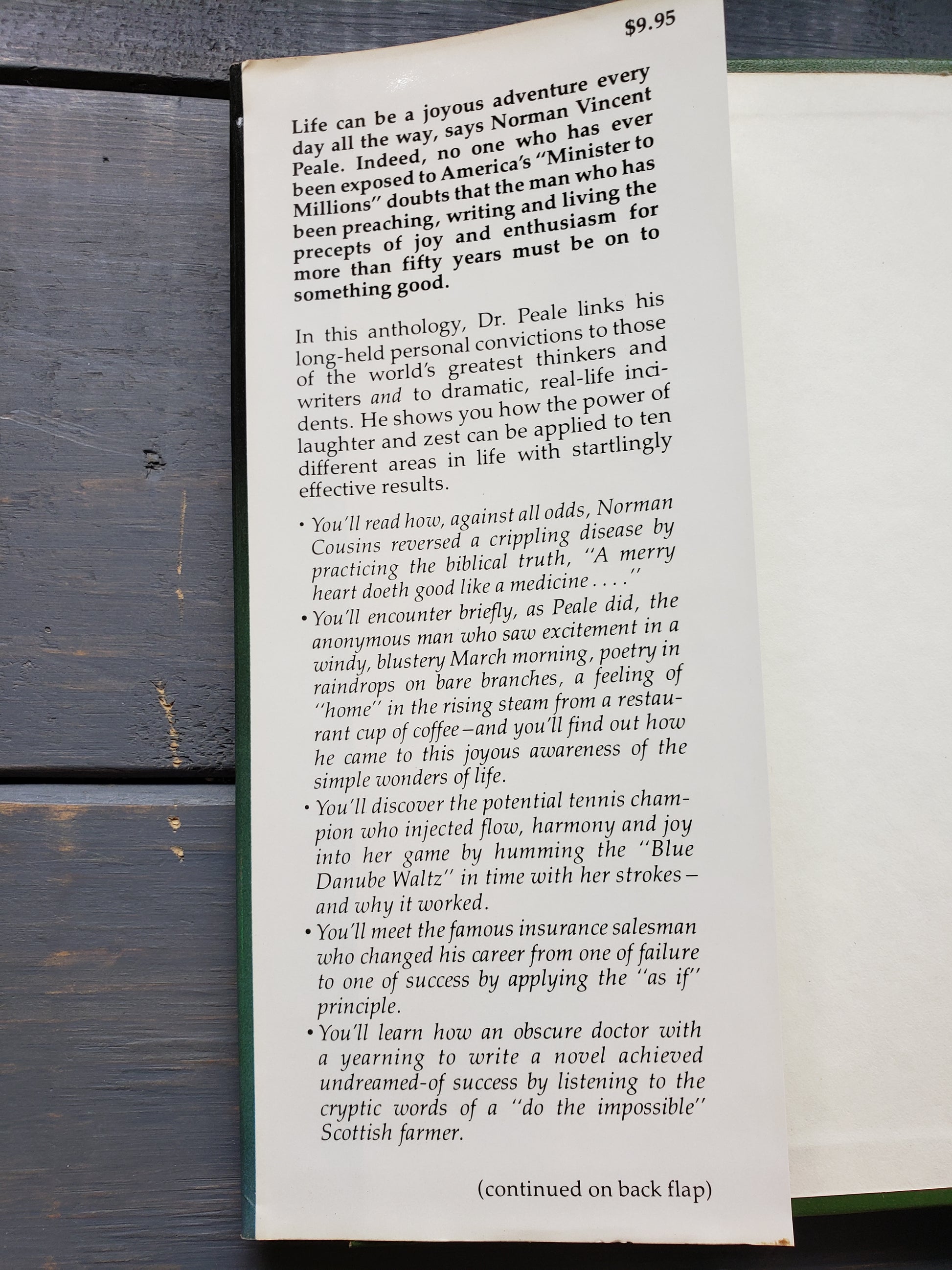 "Treasury of Joy and Enthusiasm" by Norman Vincent Peale offers timeless insights to inspire a more fulfilled and positive life. This collection thoughtfully combines practical wisdom with uplifting reflections, encouraging readers to embrace optimism and inner strength. Ideal for those seeking a refined approach to cultivating happiness and motivation, this work stands as a meaningful guide to joyful living. Previously owned, fair condition.