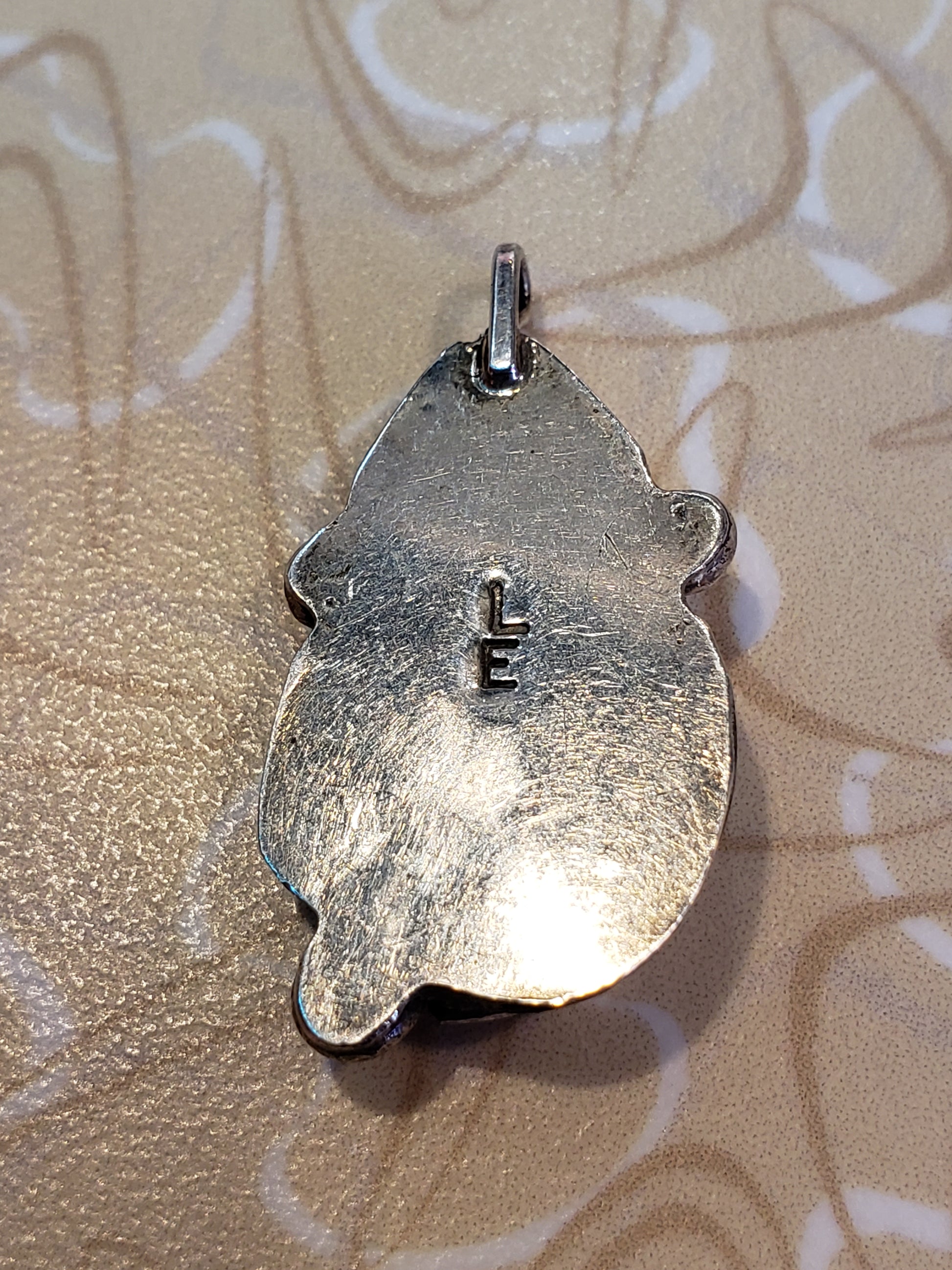 Elevate your jewelry collection with this stunning handcrafted feather pendant, featuring two genuine turquoise nuggets set in sterling silver. Artisan-signed with maker's initials LE, this piece represents authentic craftsmanship and timeless design. At 1 5/16 inches long and 5/8 inches wide, it's perfectly proportioned to make a captivating impression without overwhelming your look. The natural beauty of turquoise combined with the symbolic grace of a feather creates a conversation-starting accessory that speaks to your appreciation for quality and individuality. Own a wearable work of art that celebrates both heritage and personal style. The eye of the pendant is big enough to slide onto your favorite necklace with ease. Fair vintage condition.