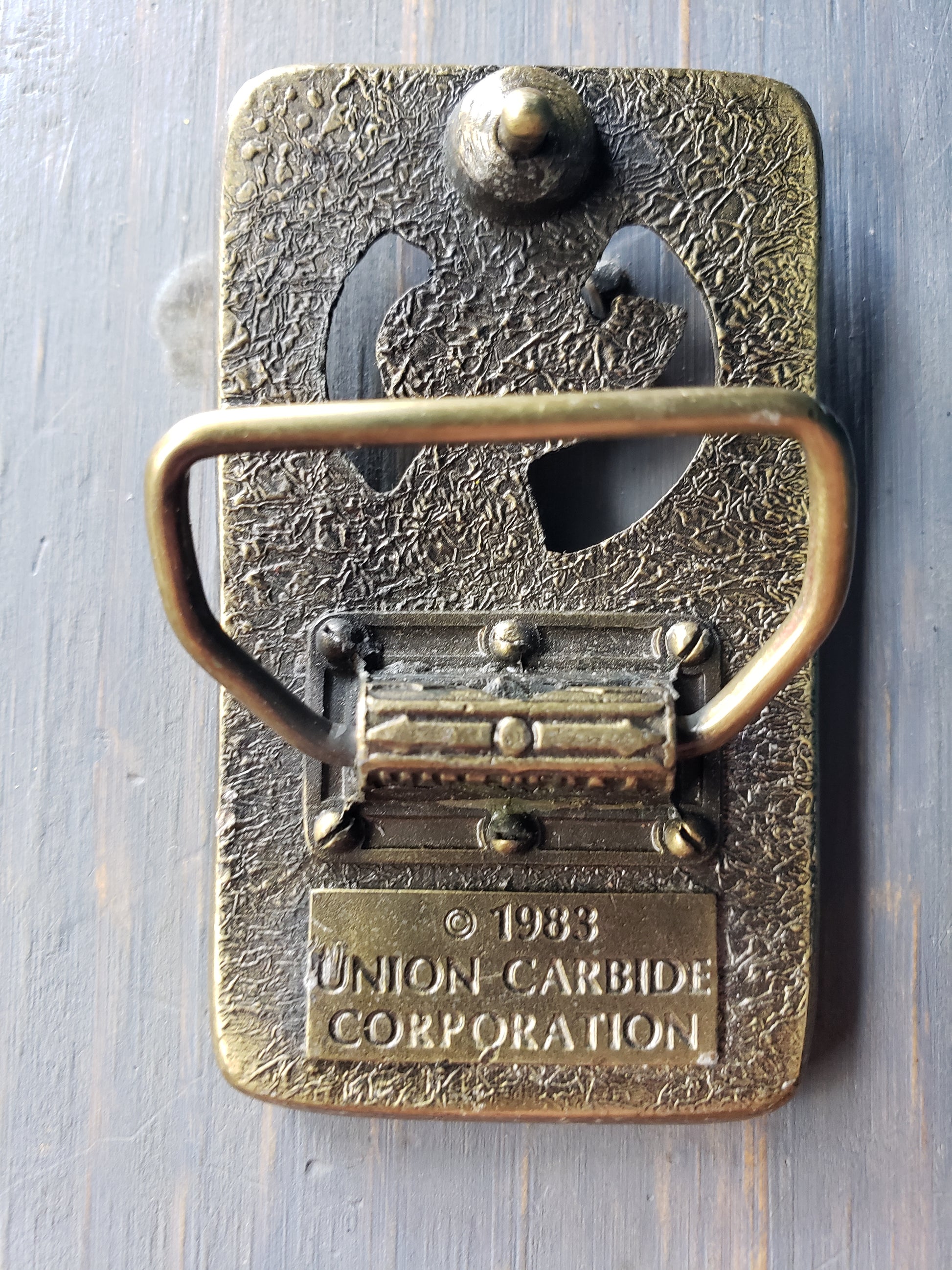 Vintage belt buckle advertising Union Carbide. It features a cat jumping through a number 9. It measures 2.5 x 1.5 inches. Solid brass, made in 1983. Fair vintage condition.