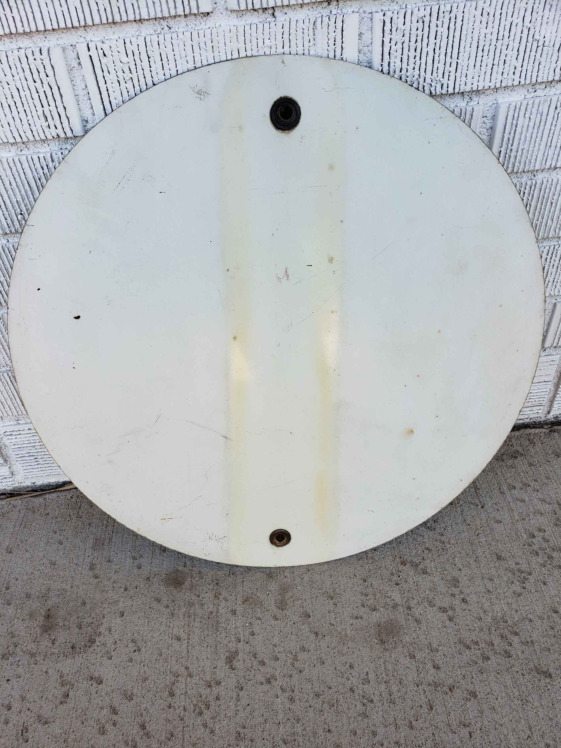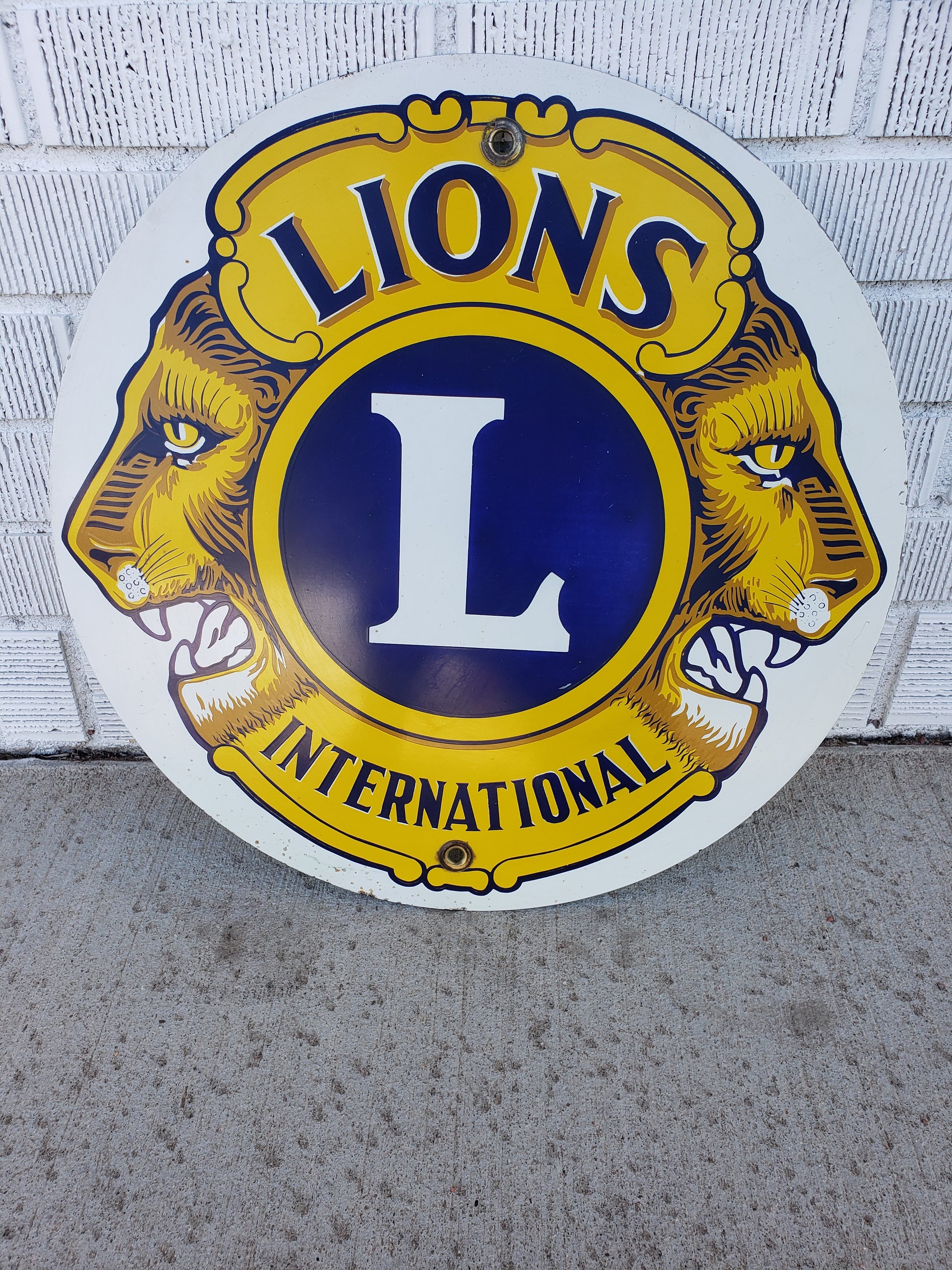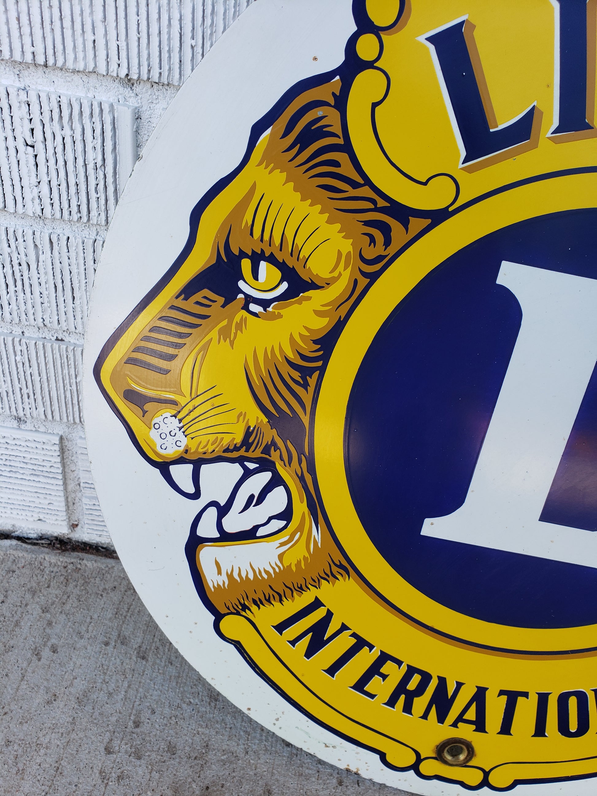 This vintage Lions Club porcelain sign, measuring 18 inches in diameter, combines classic charm with durable craftsmanship. Crafted with porcelain over metal, it features two brass grommets for easy and secure hanging. Perfect for collectors or as a distinctive decorative piece, it adds a timeless touch to any space while showcasing your appreciation for heritage and community spirit. Previously displayed outside, it is in fair vintage condition.
