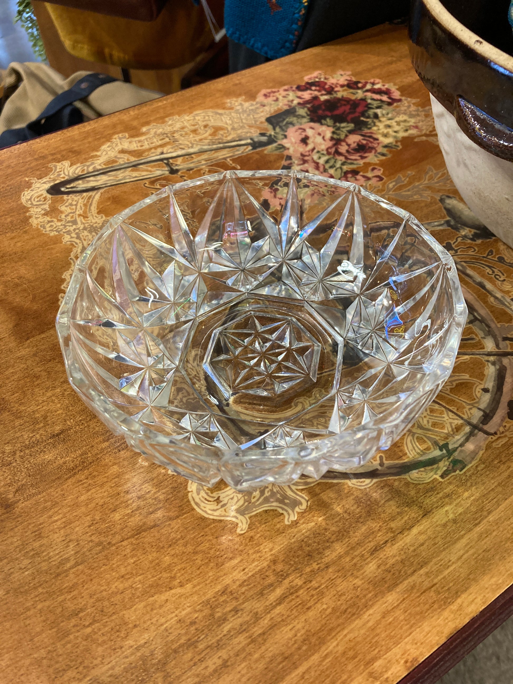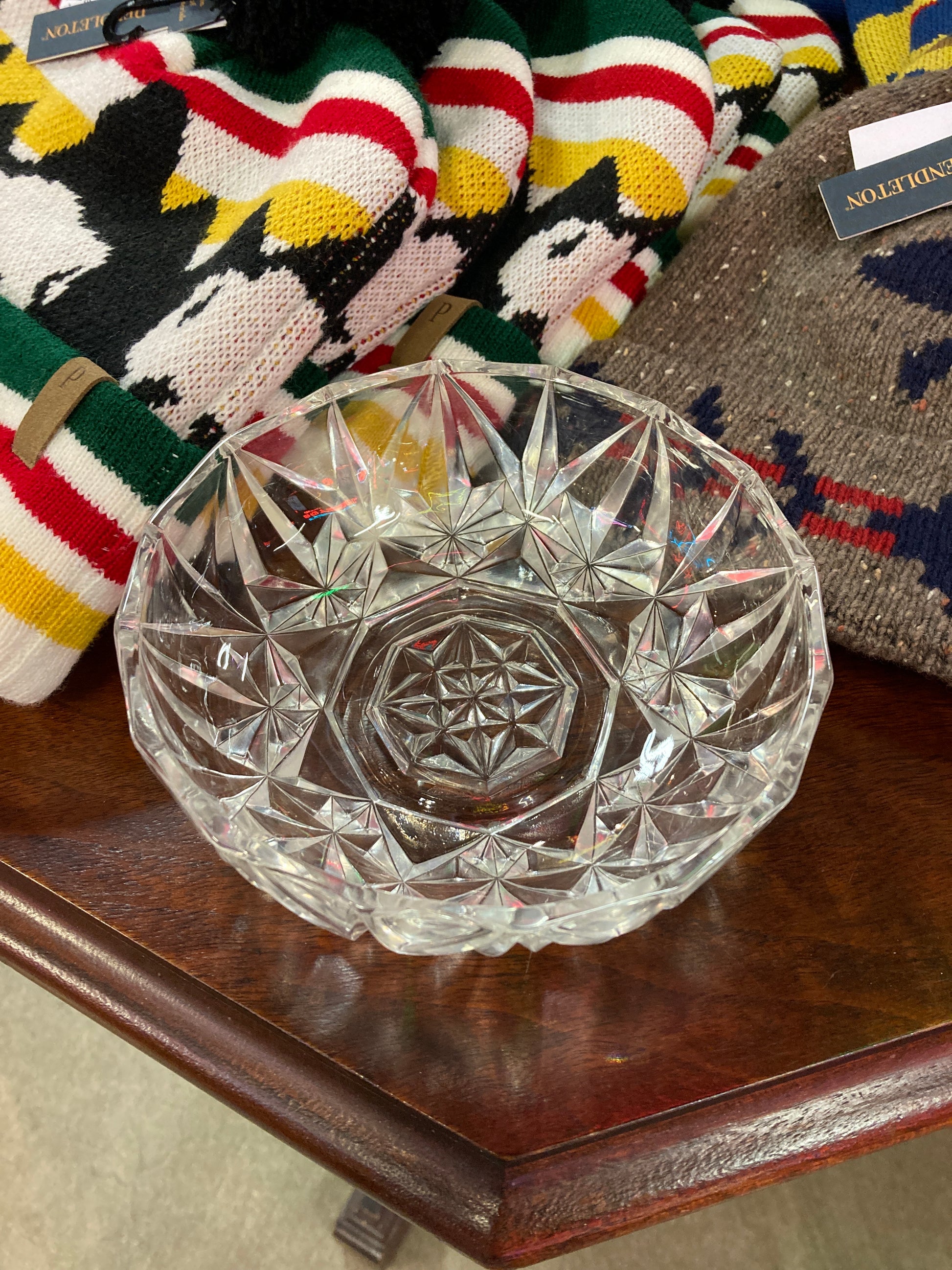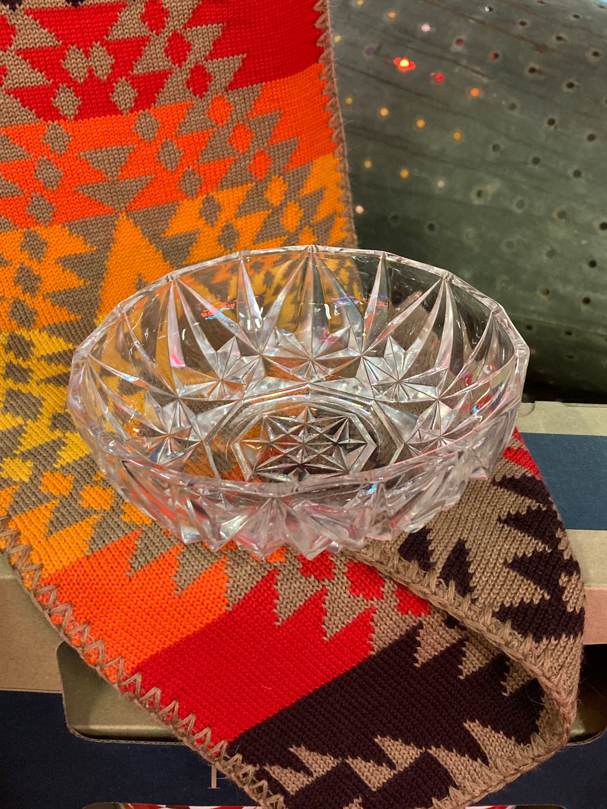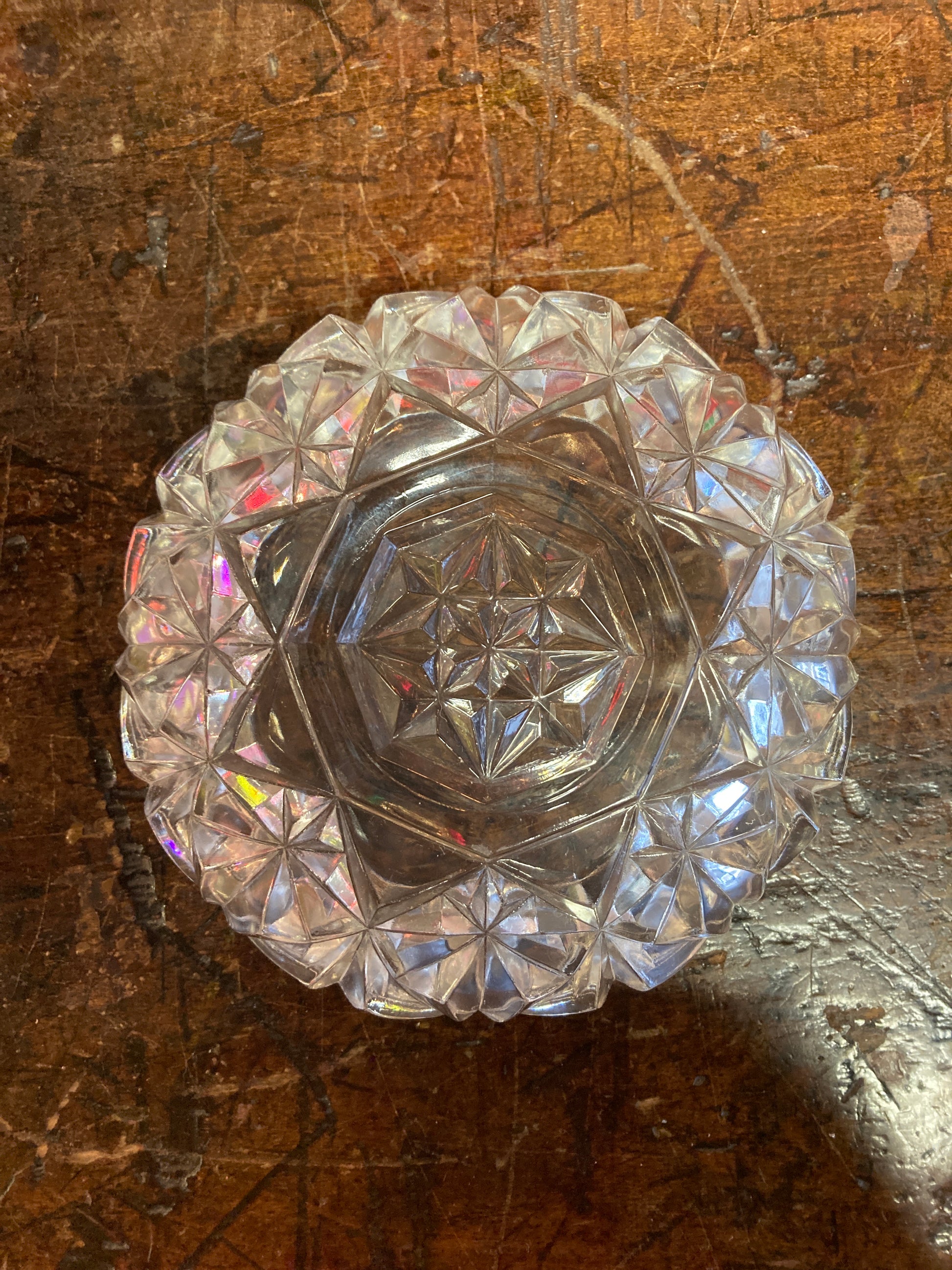 Pretty cut glass candy dish in a starburst pattern. 6 inches in diameter. In fair vintage condition, no cracks or chips. Catches the light beautifully! RED TAG SALE!