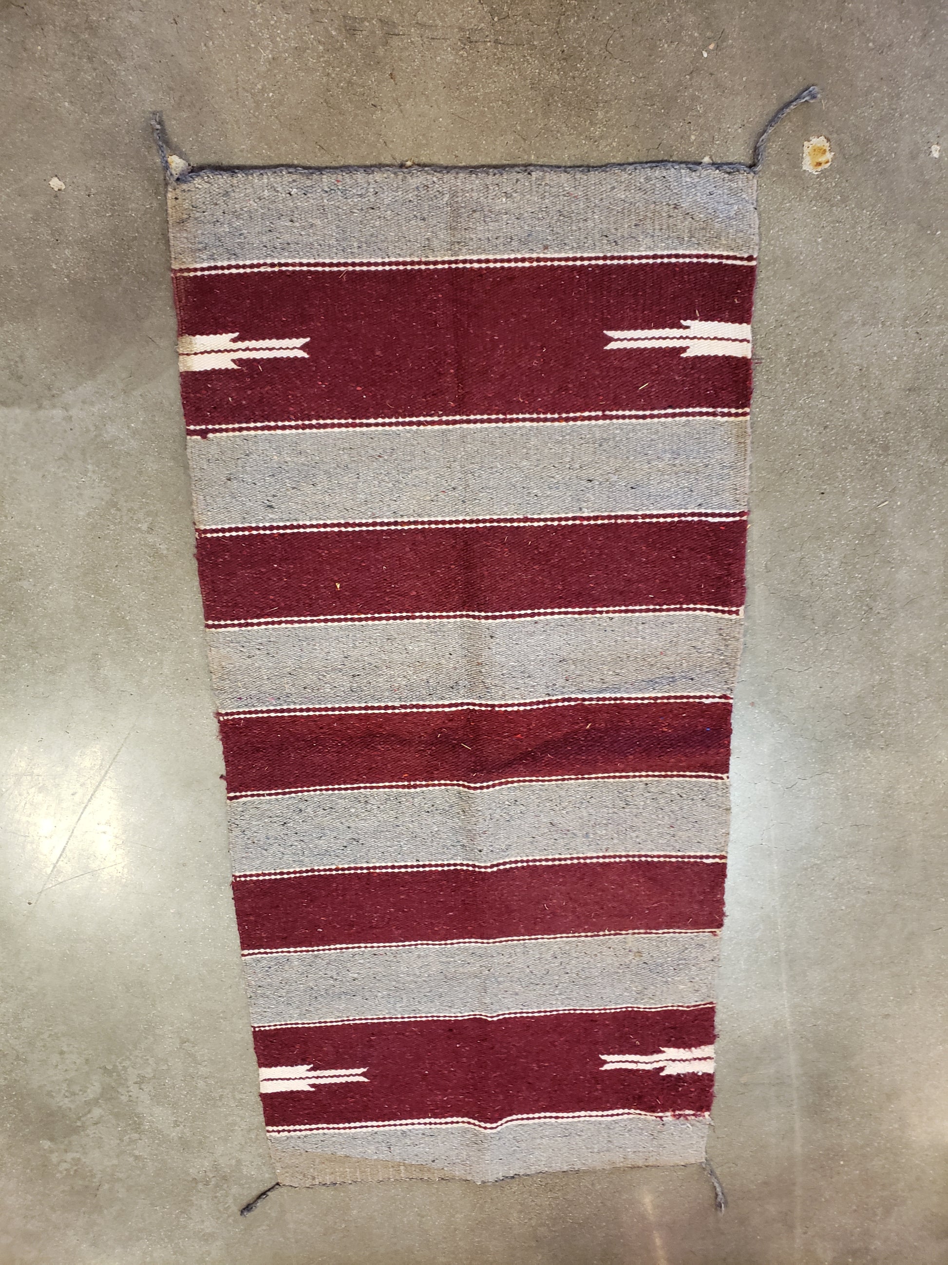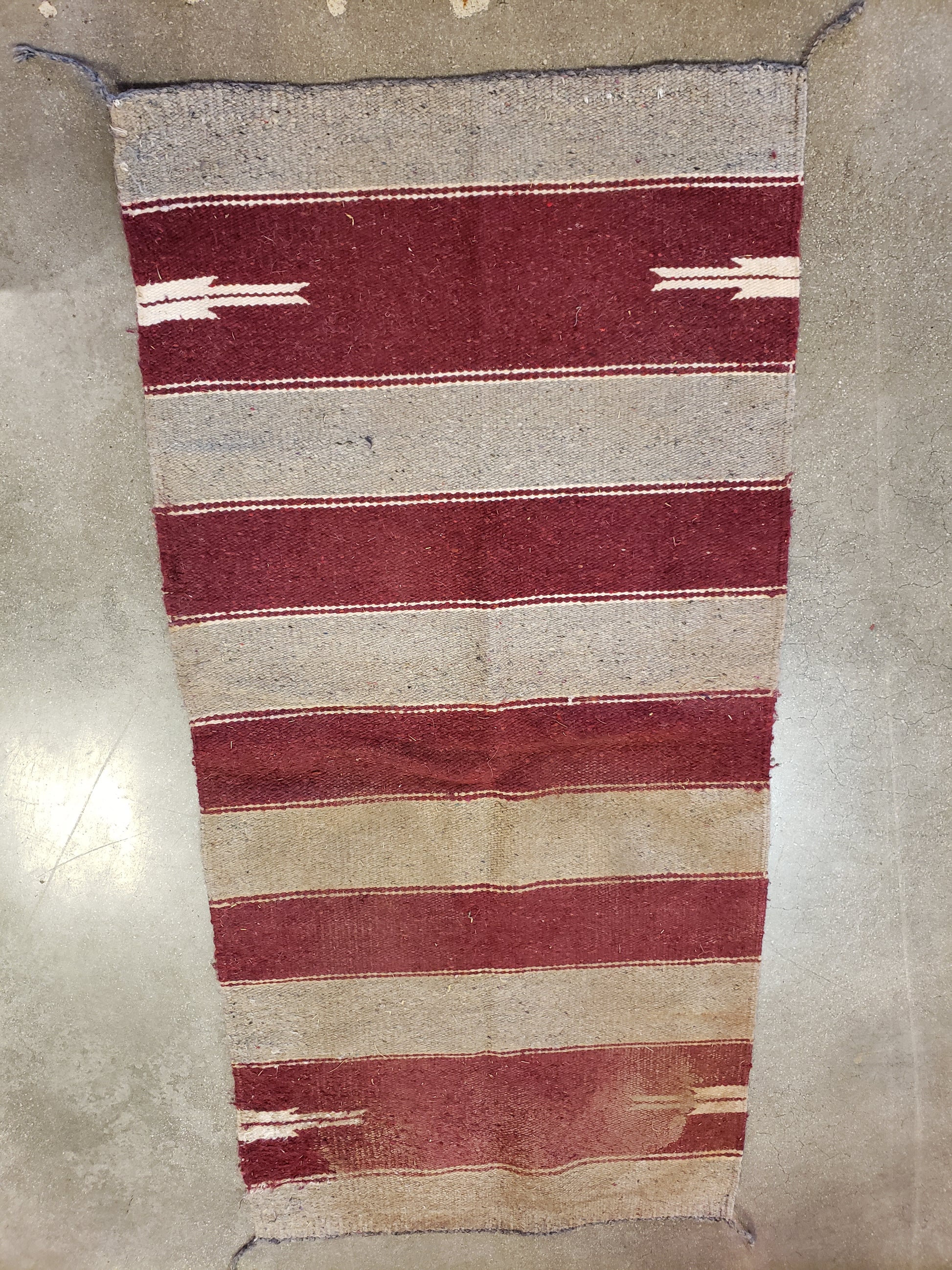 Vintage woven saddle blanket in maroon white and grey. It has been used on horses and needs cleaned, priced accordingly. Once cleaned it would make a cool Western style rug or you could still use it as a saddle blanket. Measures 60.5 inches long x 29 inches wide. Fair vintage condition.