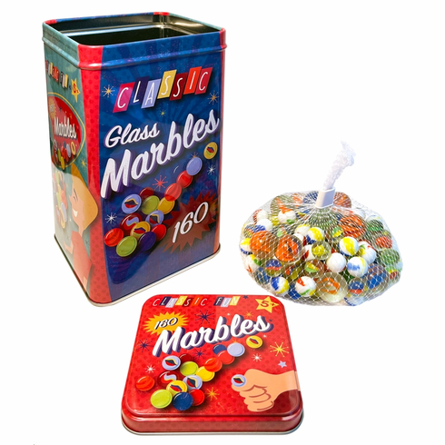 160 Marbles in Tin Box, Classic Fun. 4.5 x 4.5 x 7.5