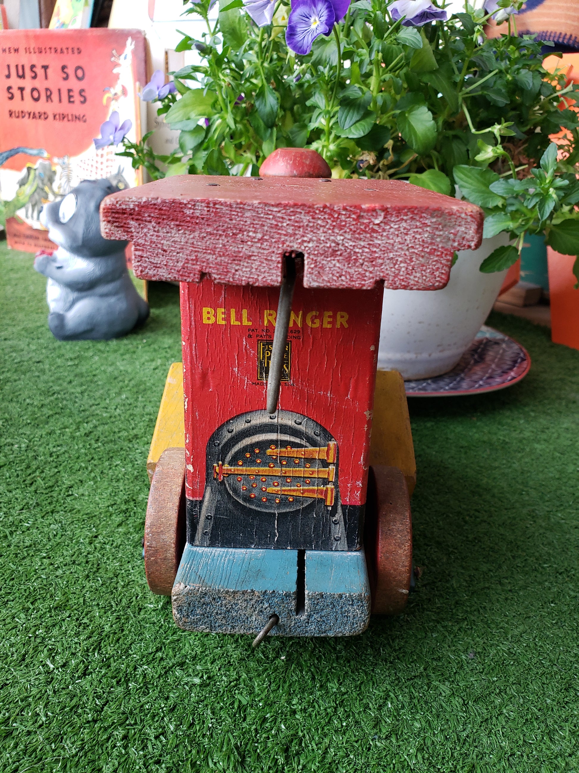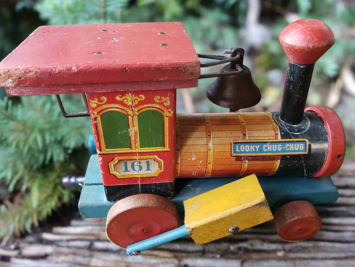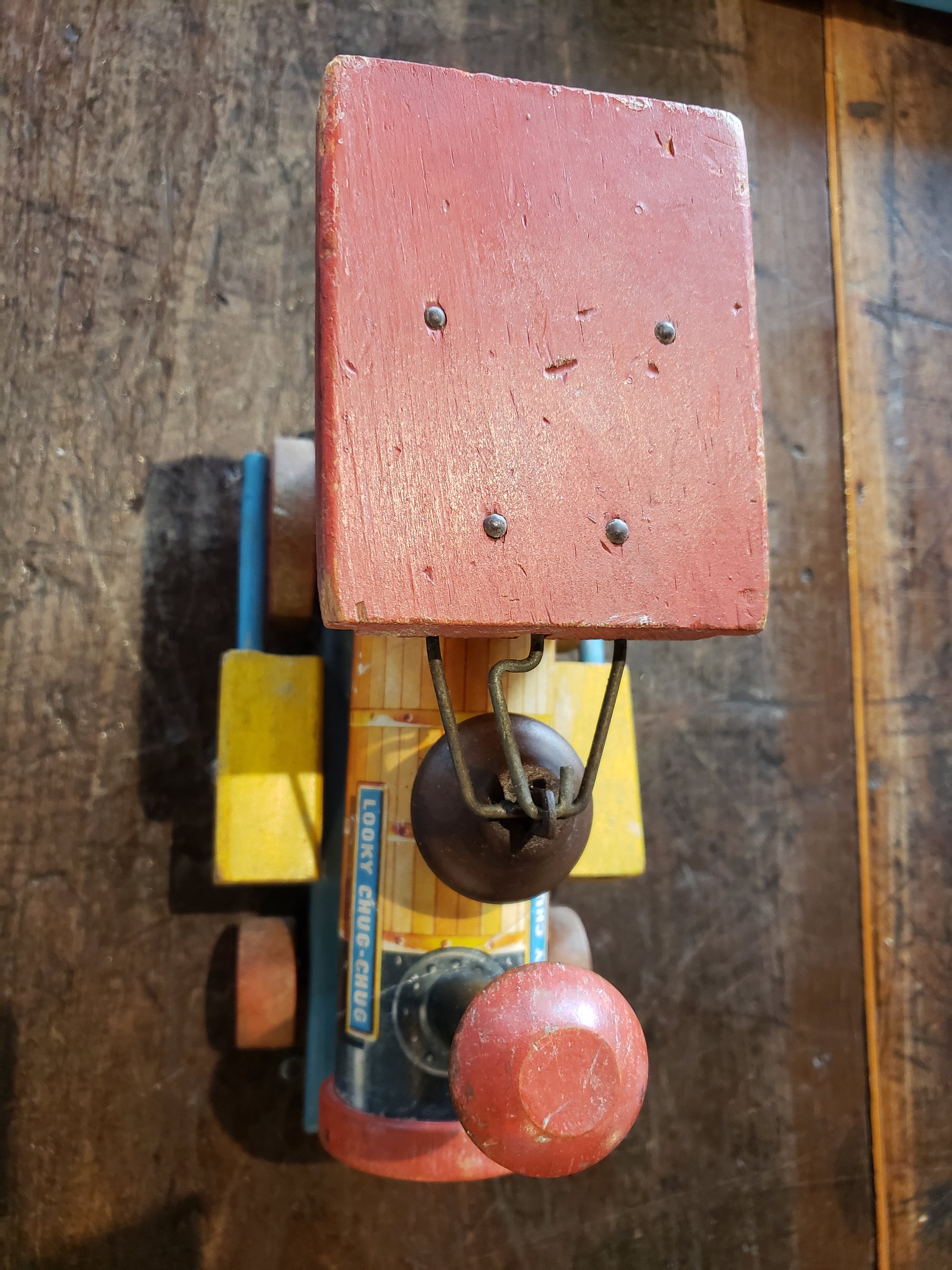 Experience nostalgic playtime with the 1950's Looky Chug-Chug train, a charming vintage Fisher-Price toy. This classic train makes an authentic chug-chug sound when pushed and features a ringing bell, bringing joyful sounds to every play session. Though gently used, it remains in fair condition, perfect for collectors or children who appreciate timeless toys. Add a piece of history and fun to your collection with this delightful, sound-filled train.
