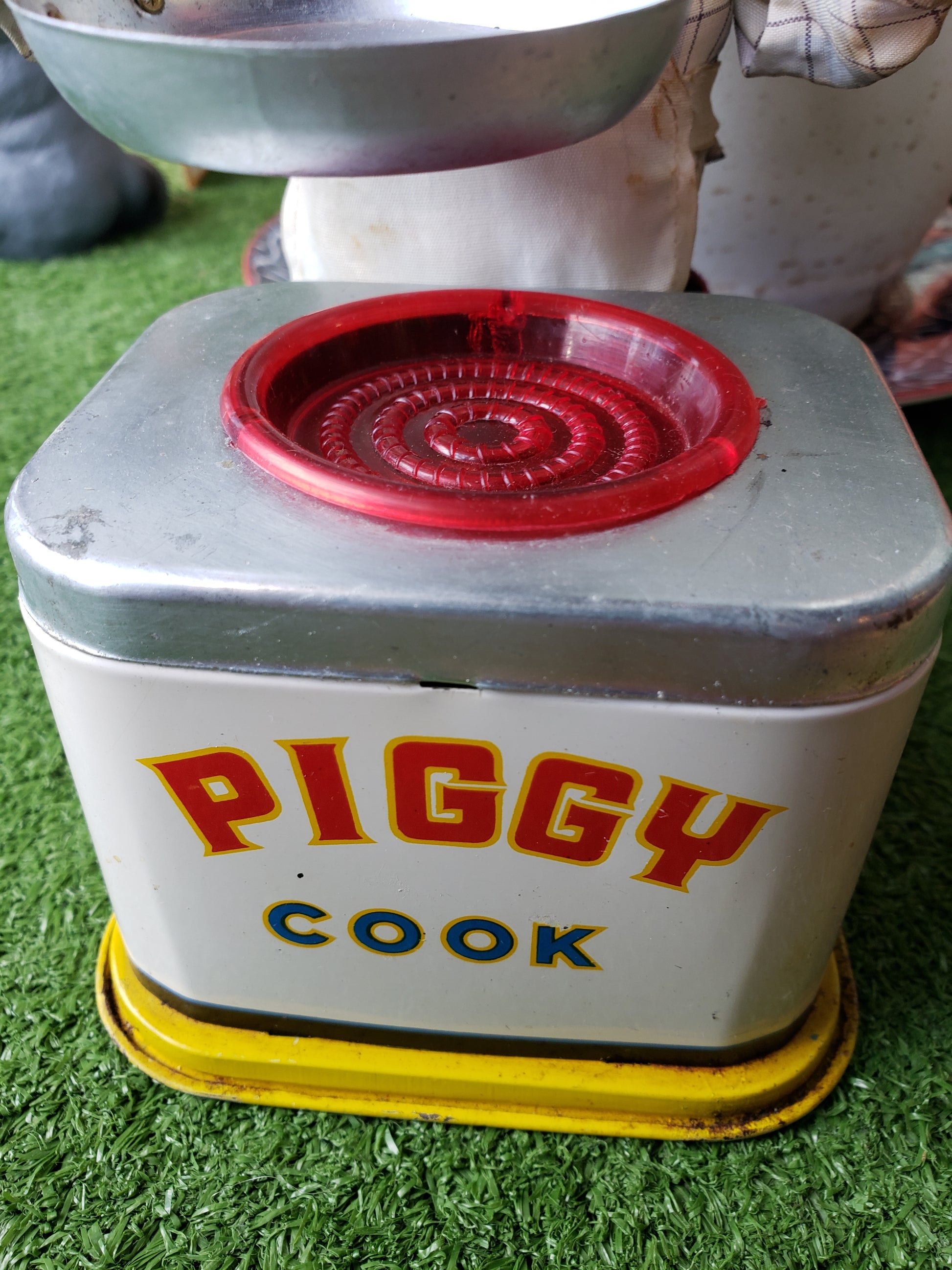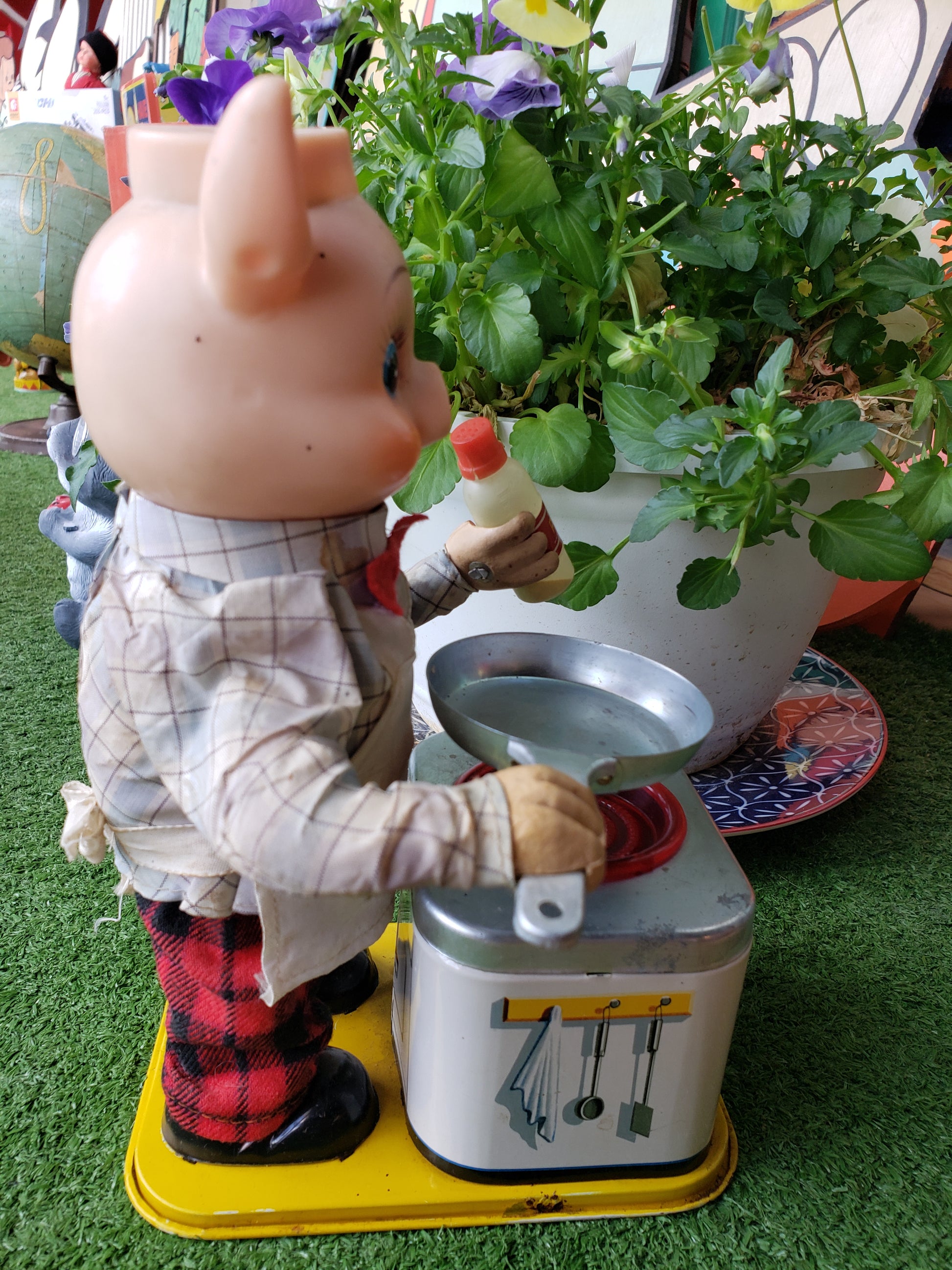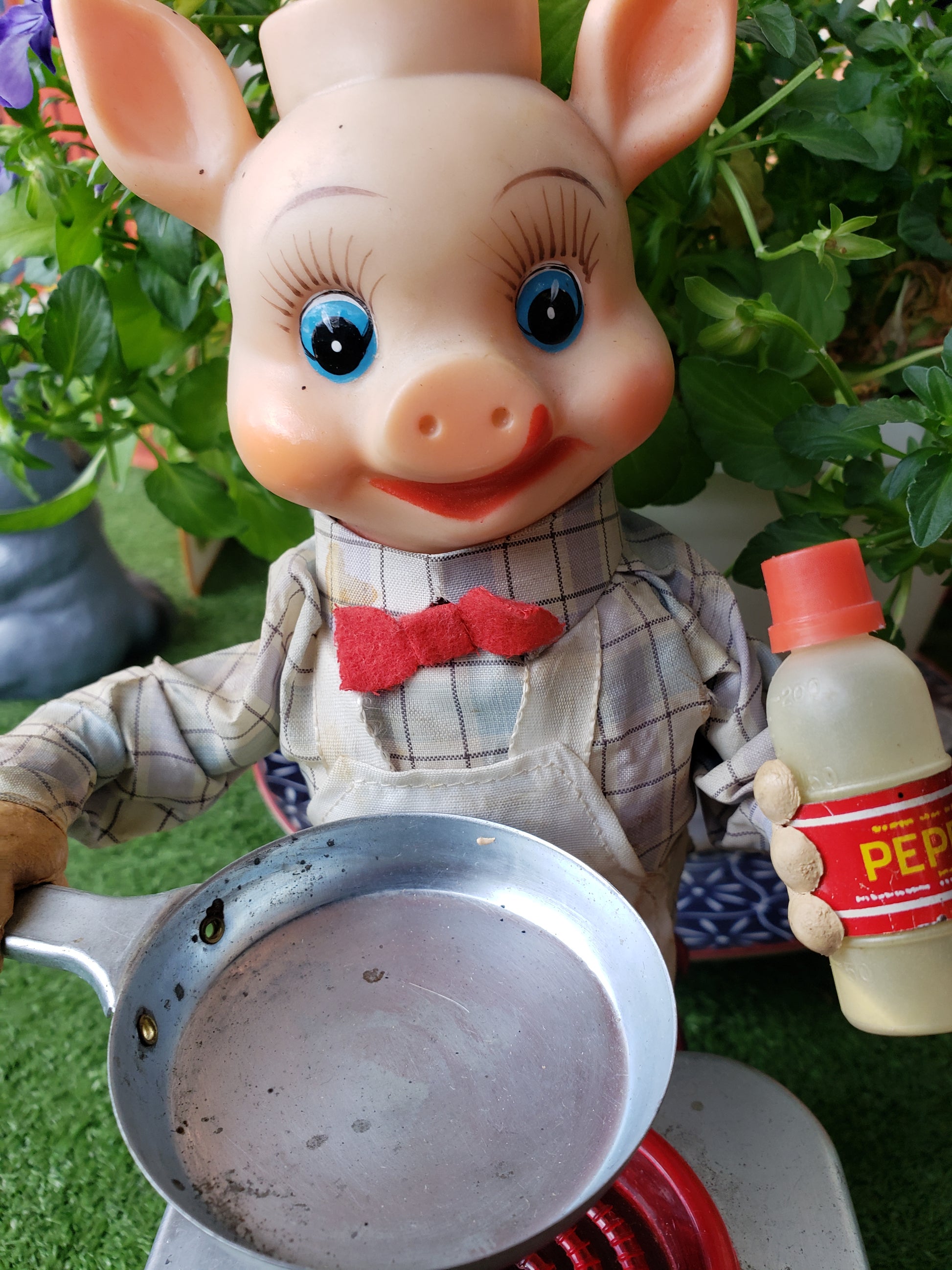1950s Original Yonezawa Piggy Cook Battery Operated Toy, untested. Missing the chef's hat and the food for the frying pan. A fun collectible in fair used condition.