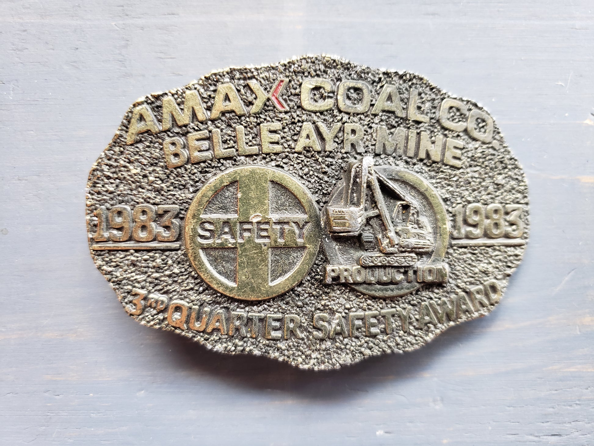 Celebrate mining heritage with this 1983 AMAX Coal Belle Ayr mine Safety award belt buckle. Crafted from solid brass, it features a detailed raised image of a loader, symbolizing dedication to safety. This third-quarter award buckle, pre-owned and in fair condition, makes a unique collectible for enthusiasts and a meaningful tribute to hardworking miners. Add a piece of mining history to your collection today.