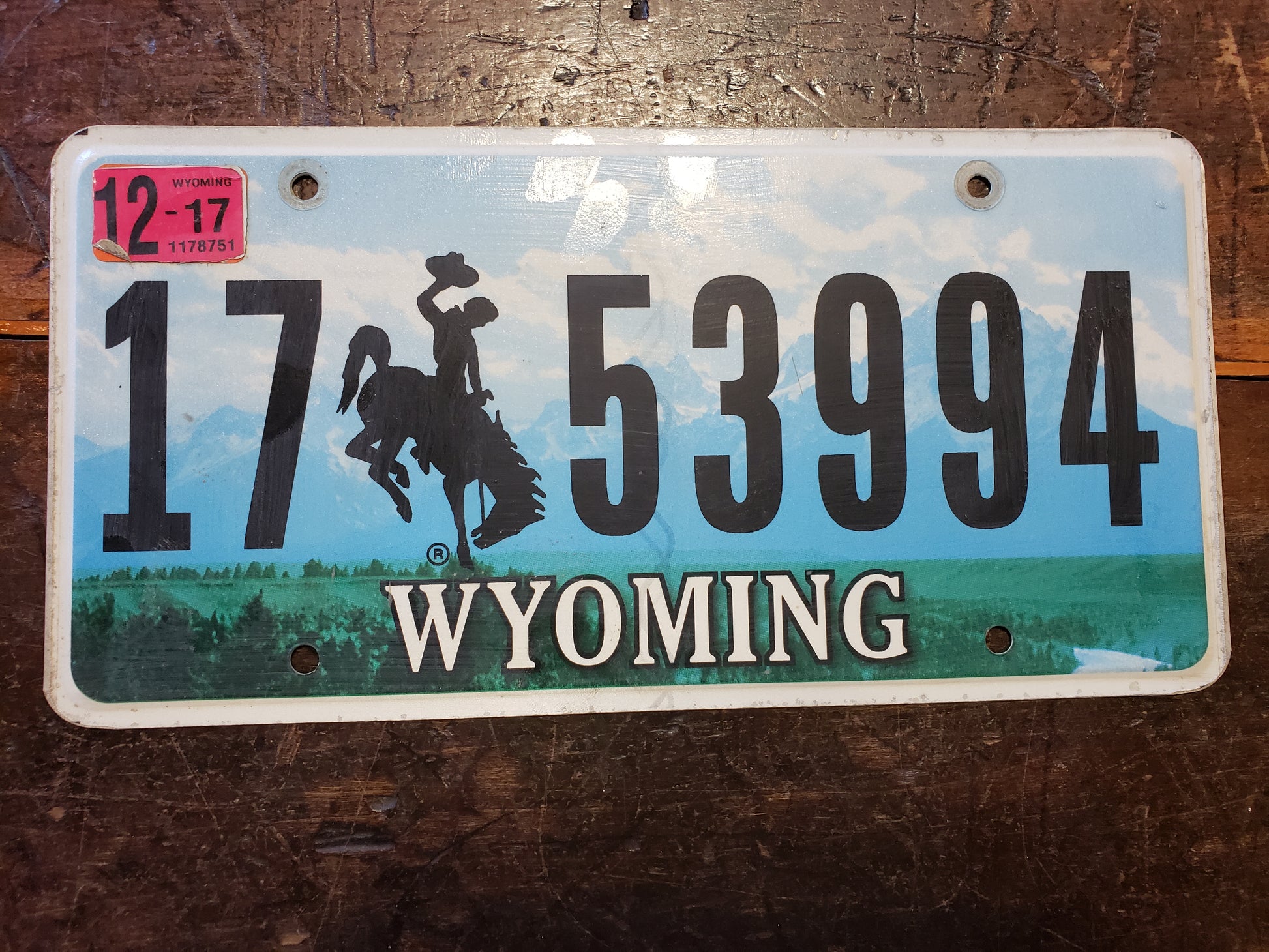2017 Wyoming License Plate 17 53994. Fair used condition, flat reflective plate has Teton mountains in the backdrop.