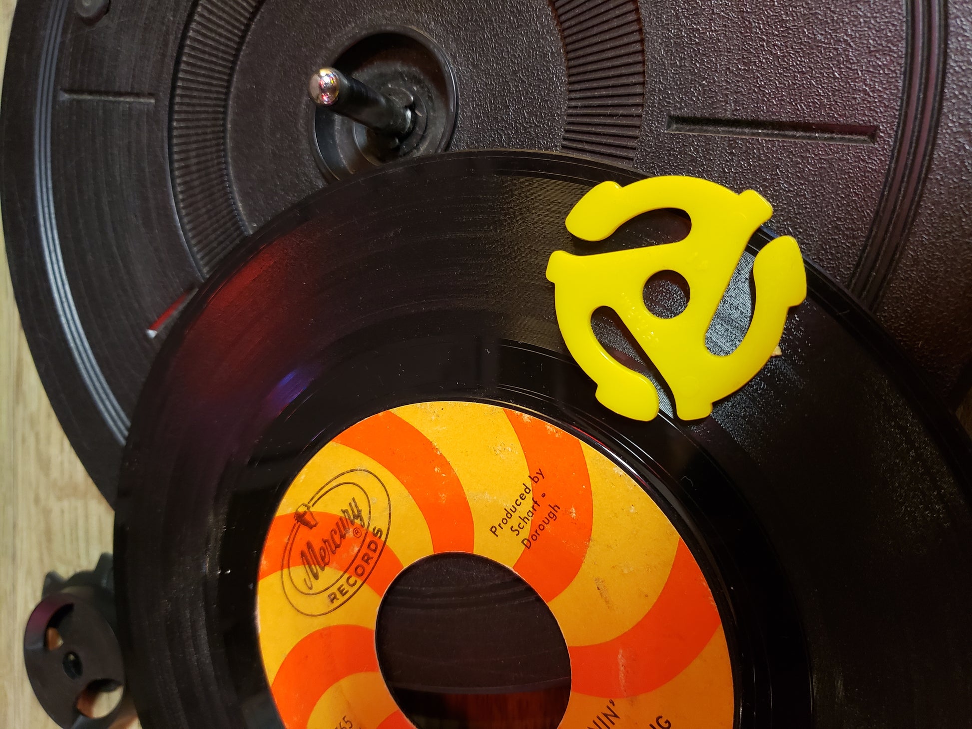 This plastic spacer will fit in the center of a 45 rpm record, allowing it to be played on a regular turntable. Fair vintage condition. Record not included.