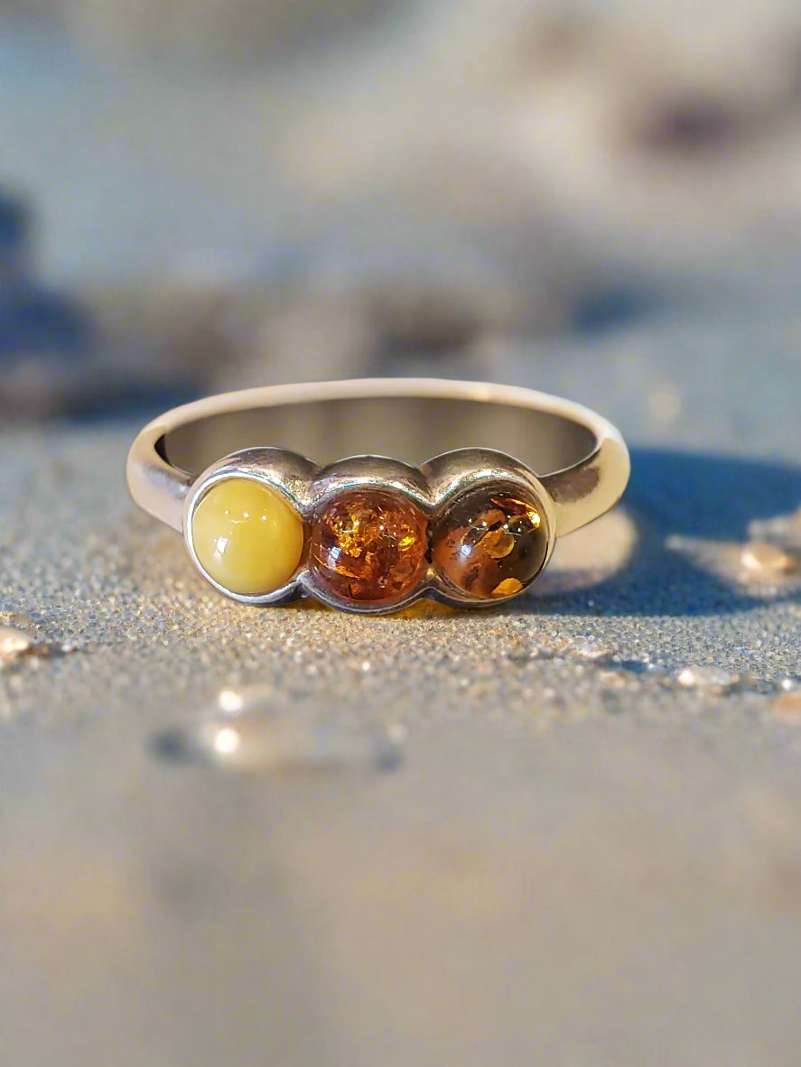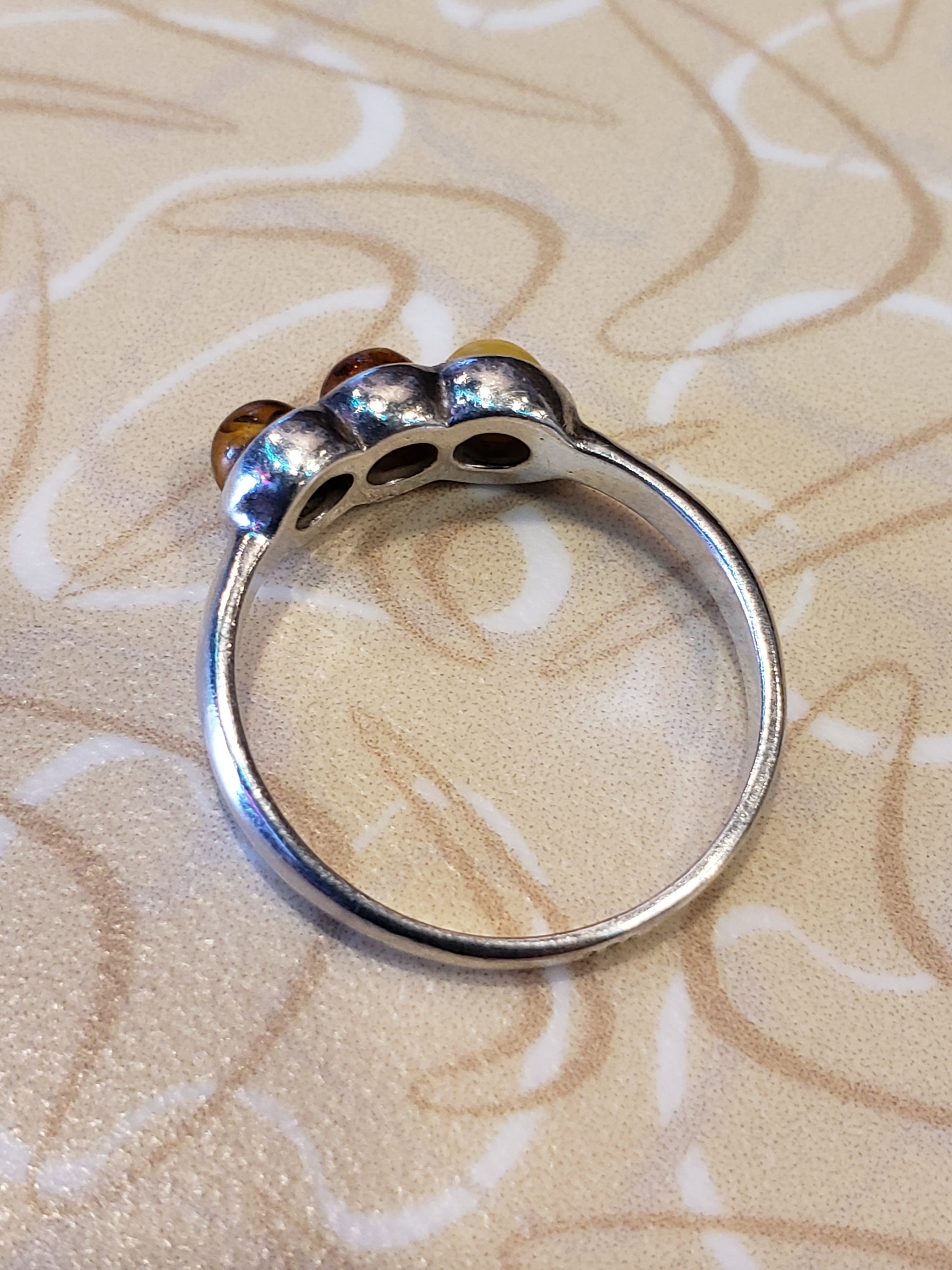 This .925 sterling silver ring features a striking design with three captivating stones, including two warm amber gems. Sized at 7.5, it offers a unique blend of elegance and character. Previously owned and in fair condition, this eye-catching piece is perfect for those seeking a distinctive accessory with a story. Add a touch of timeless charm to your collection today.