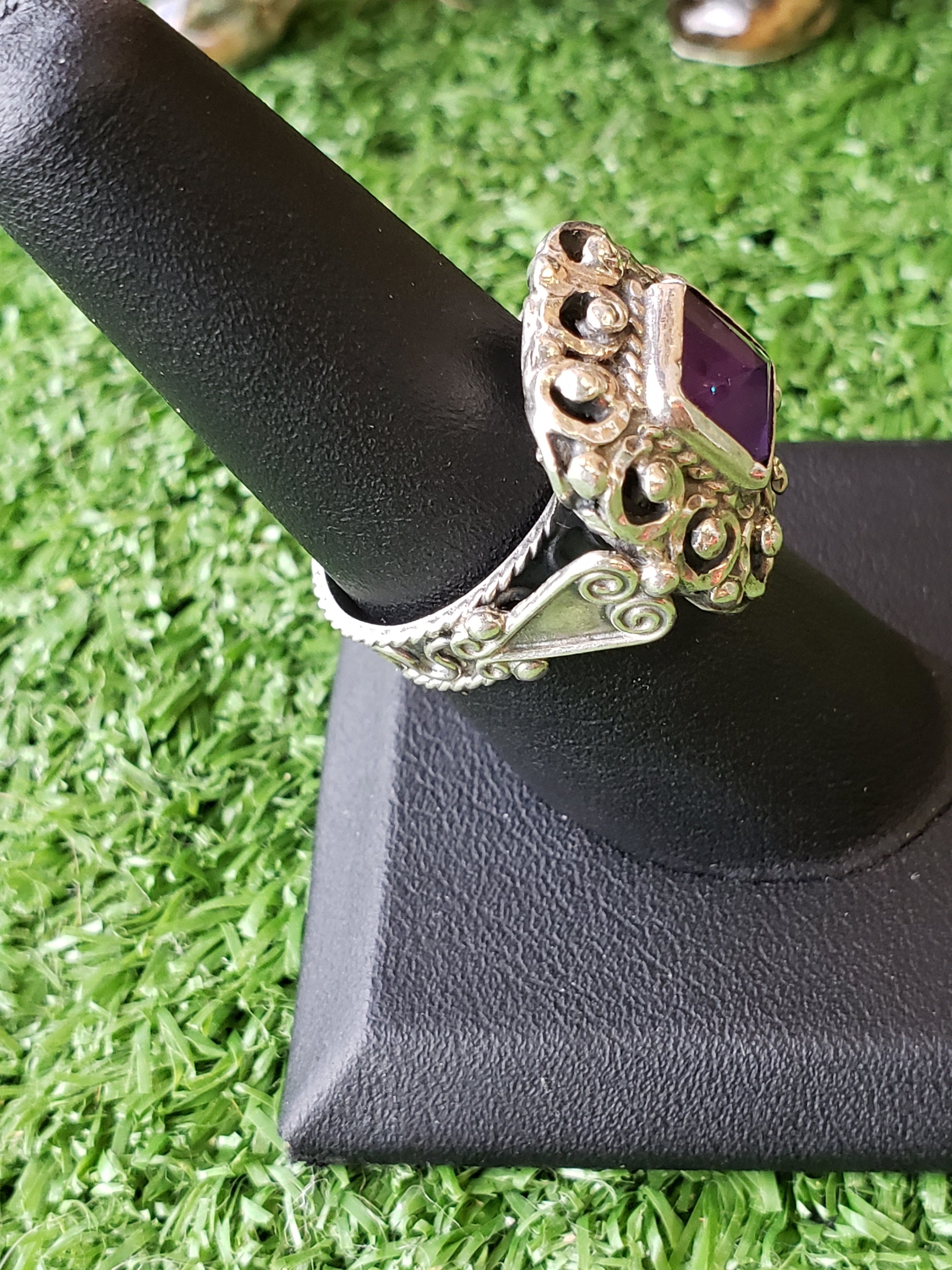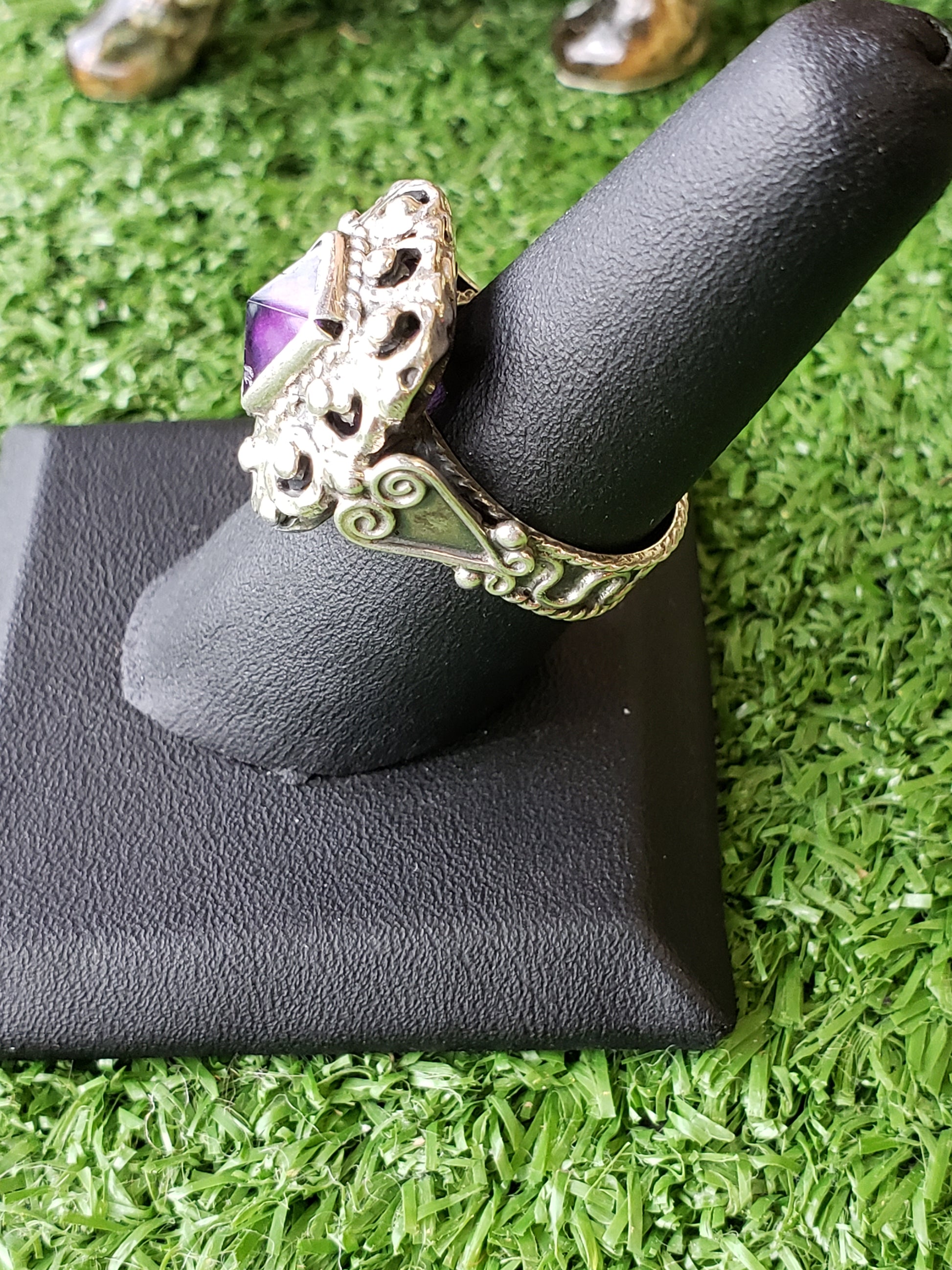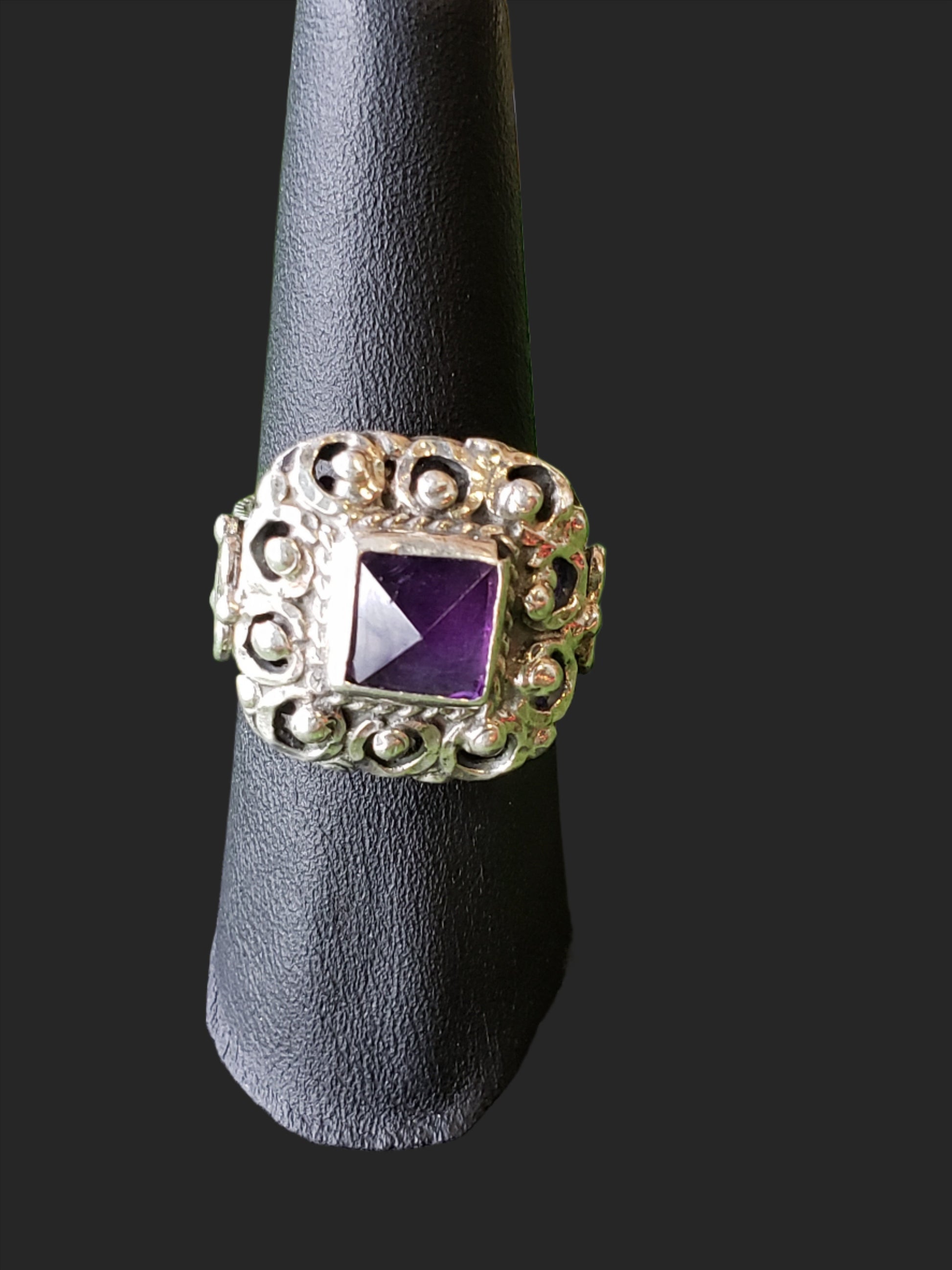 Unique sterling ring is stamped .925 T0-95 MEXICO inside, has a square purple faceted stone. The setting is very detailed, it has curlique hearts on each side and a zig zag design along the band. Fair used condition. Size 7.5