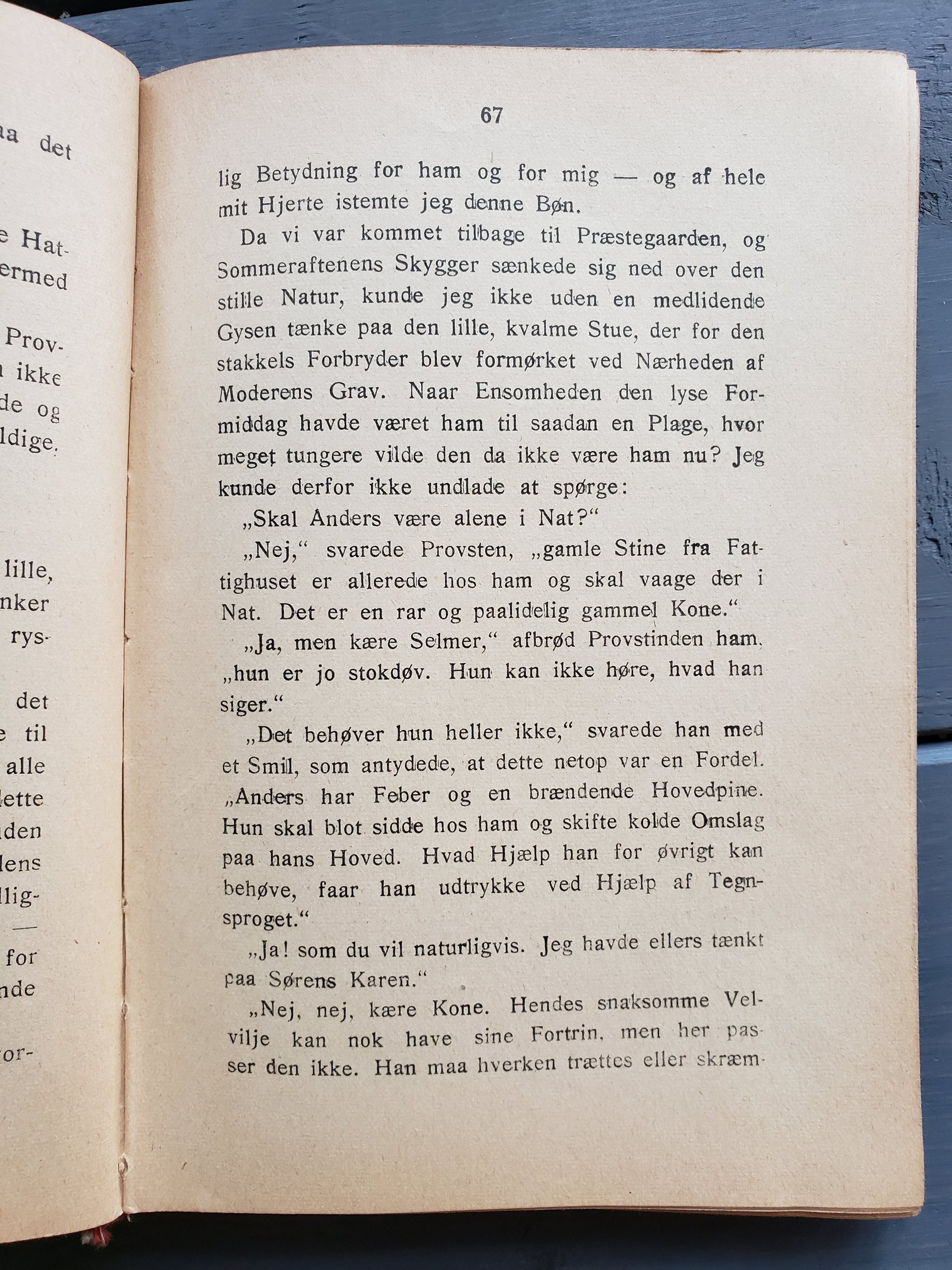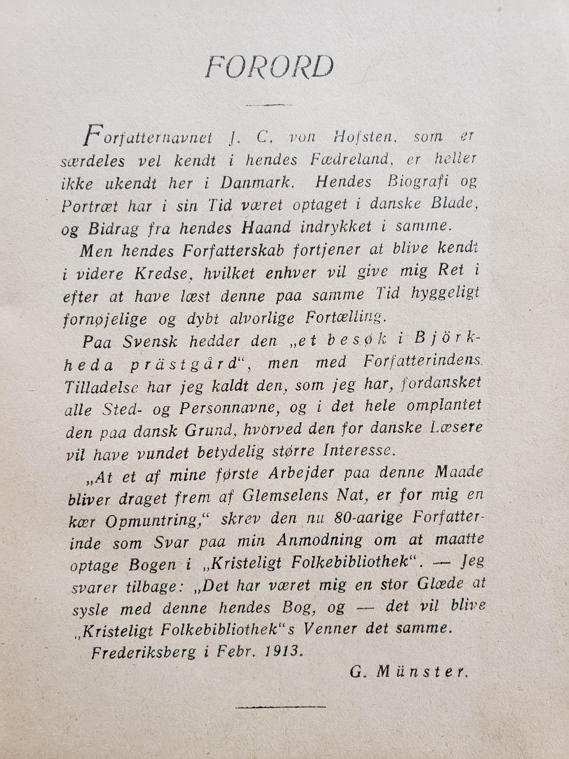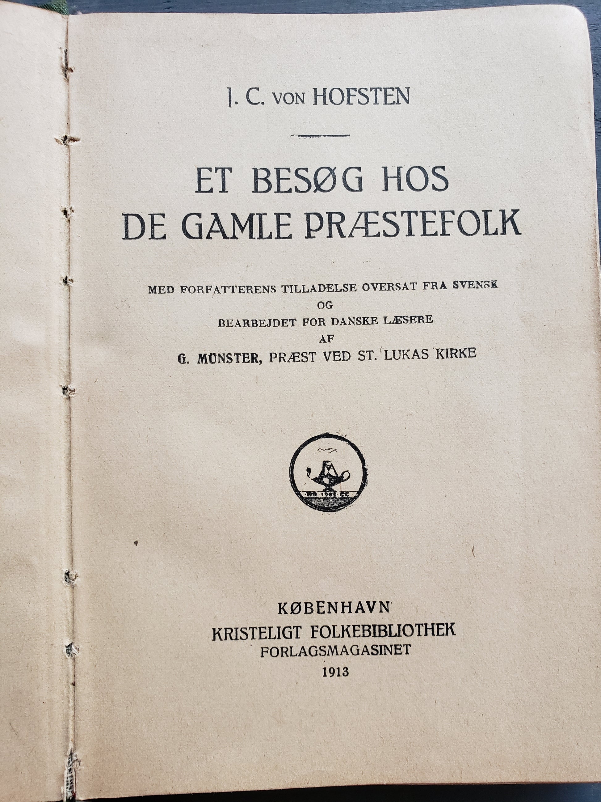 A Visit to the Old Priests, J.C. von Hofsten. Published in 1913. This is a novel which was translated from Swedish to Danish by G. Munster, who was a Priest at Lukas Church in Copenhagen. He had the author's permission to translate this book, as he wanted to gain her writings a greater following because he had much respect for her works. He changed the settings and names to Danish for his readers to enjoy. From what I've read via Google translate, this sounds like a very interesting story. Fair vintage condition.