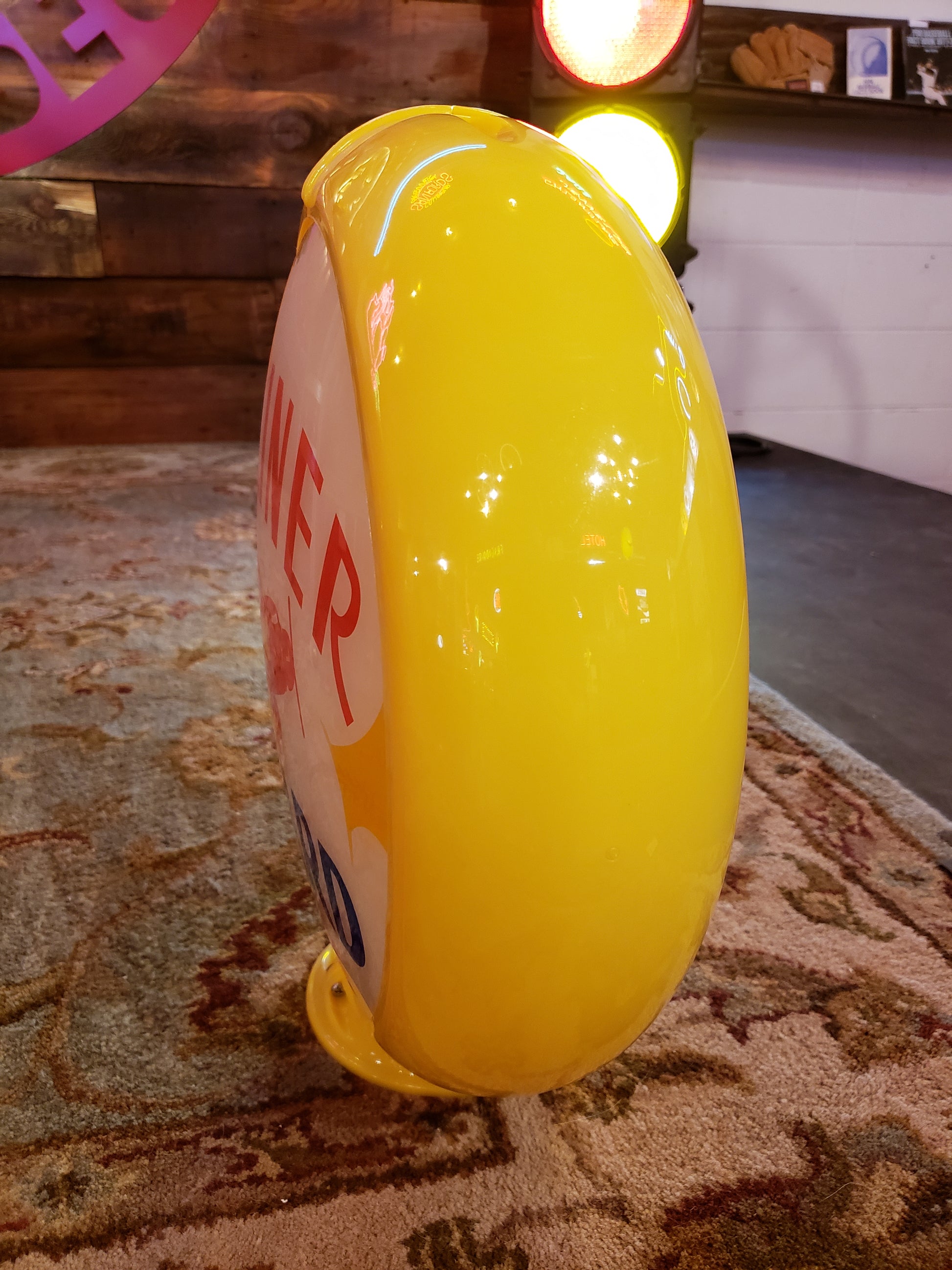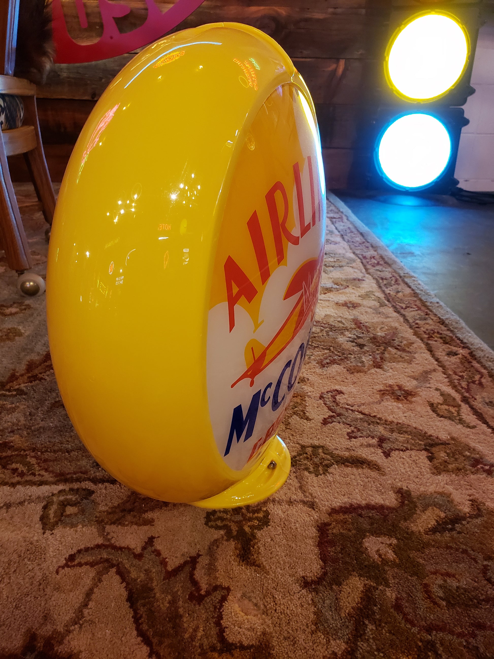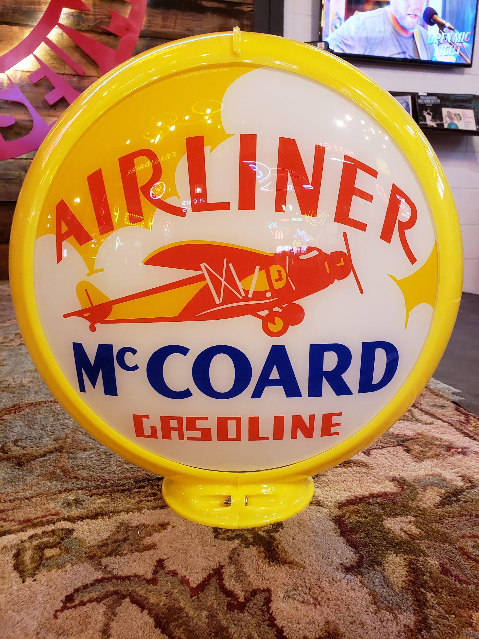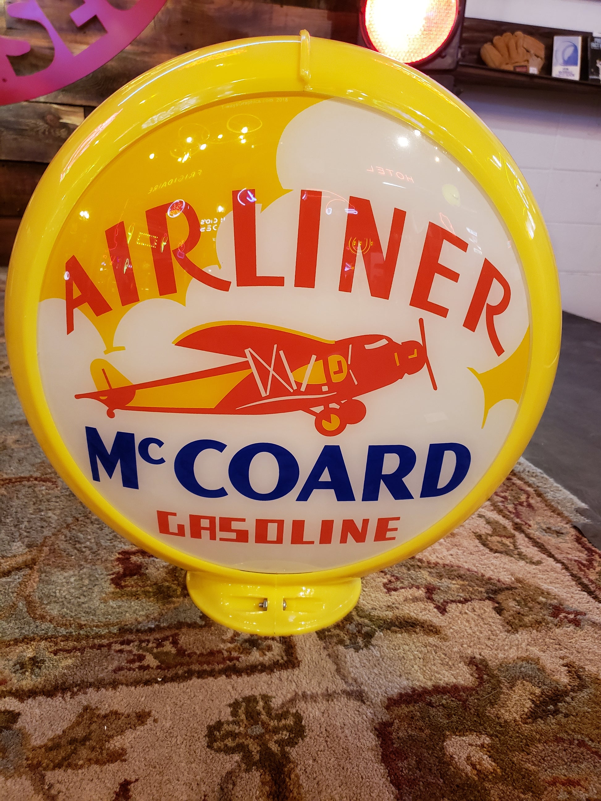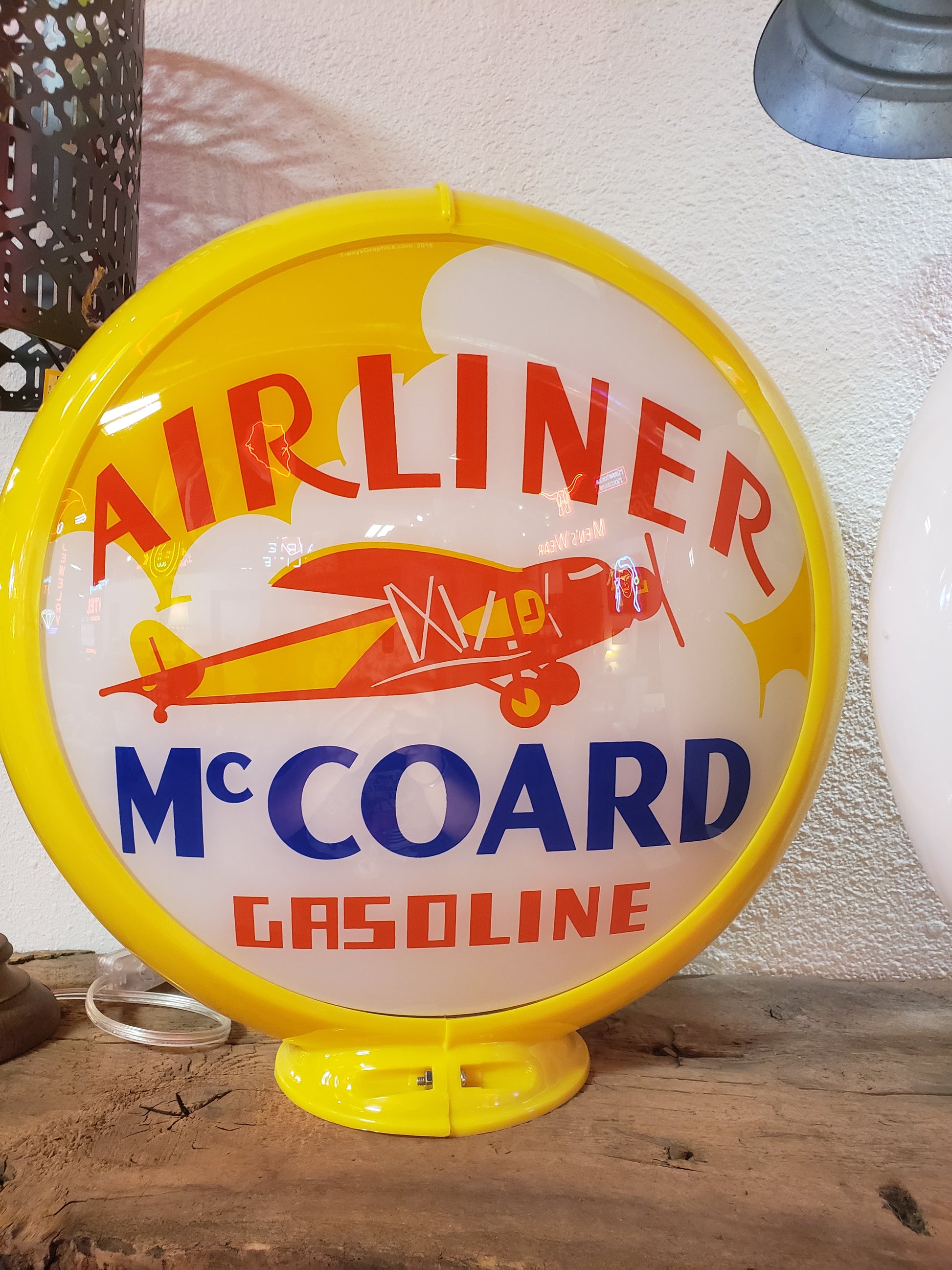 This is a reproduction 13" Glass Lens Gas Pump Globe advertising McCoard Airliner Gasoline. Globe and body only, lighted base not included.