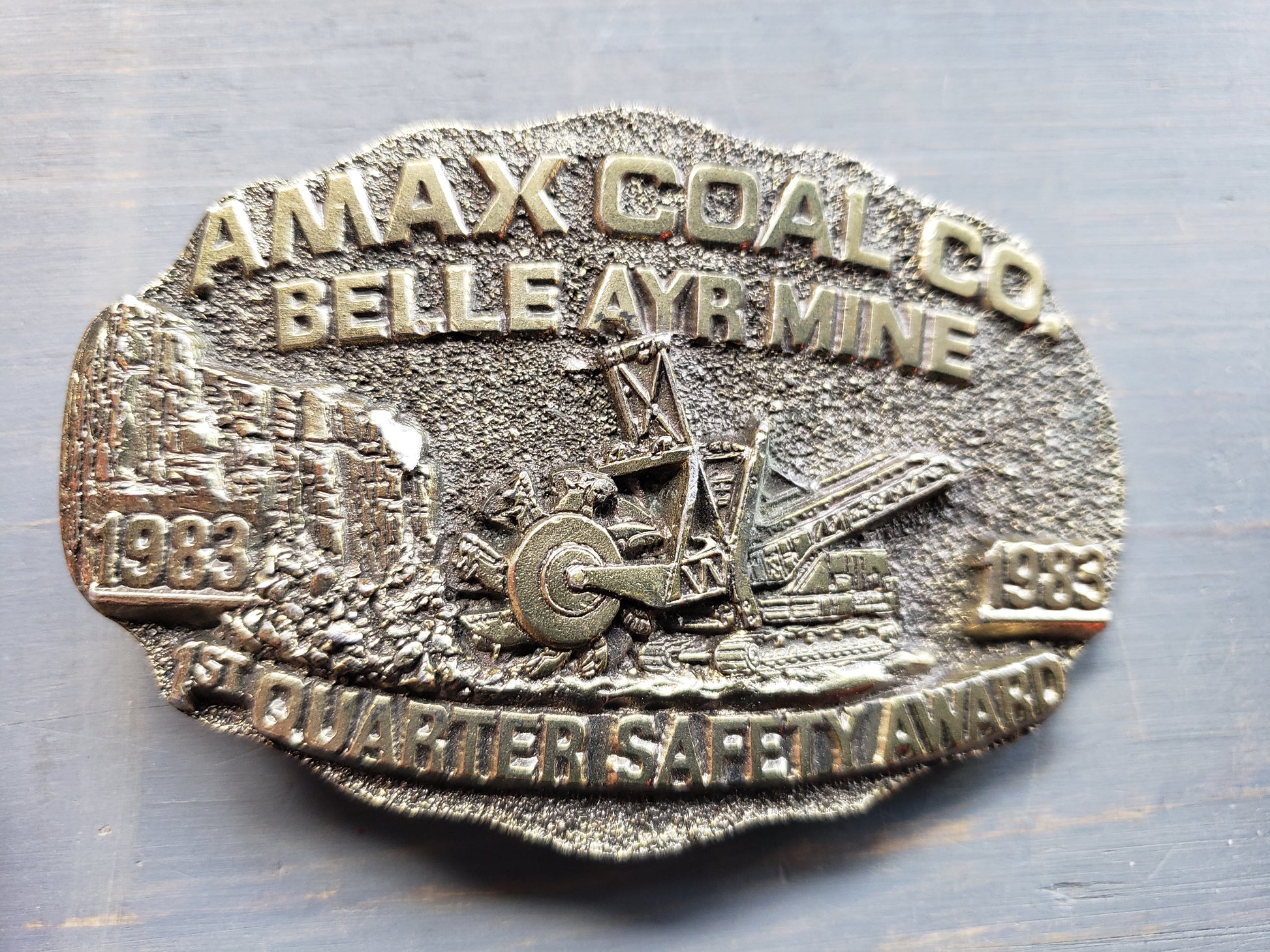 Celebrate a piece of mining history with the AMAX Coal Belle Ayr Mine 1st Quarter Safety Award Belt Buckle. Featuring a detailed dragline design, this 1983 buckle honors workplace safety achievements. Though pre-owned and in fair condition, it remains a distinctive collectible that showcases pride in mining heritage. Perfect for enthusiasts and collectors alike, this buckle is a meaningful reminder of dedication and safety in the coal mining industry.