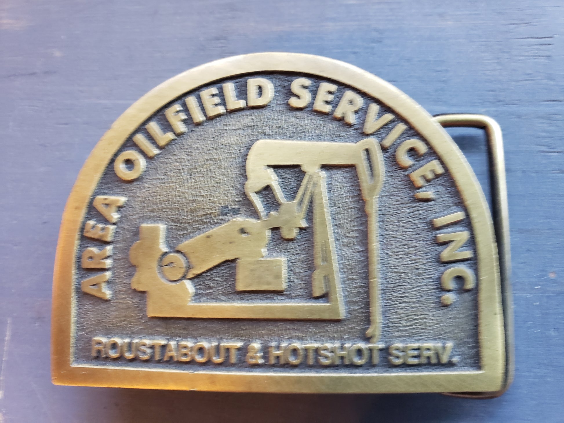 This vintage brass belt buckle from Area Oilfield Service, Inc. captures the rugged spirit of roustabout and hotshot work. Pre-owned and showing authentic signs of wear, it offers a genuine piece of oilfield history. Perfect for collectors or anyone wanting to showcase a connection to hardworking oilfield service, this buckle combines durability with nostalgic charm. Add a distinctive touch to your style while honoring a proud heritage.