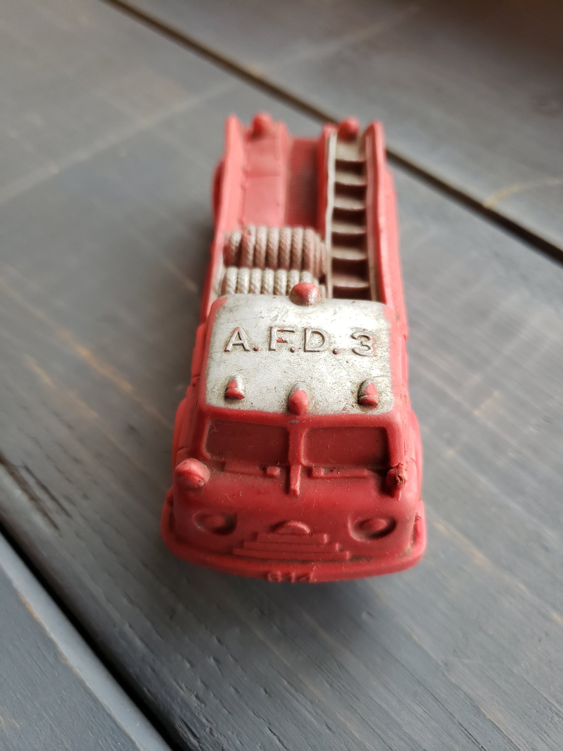 This Auburn A.F.D. 3 rubber firetruck toy offers a durable and flexible design perfect for imaginative play. Crafted from soft rubber, it is safe for children to handle while inspiring creative storytelling and motor skills development. Its detailed firetruck features provide an engaging experience for young firefighters in training. Measures a bit over 4 inches long. Fair vintage condition.