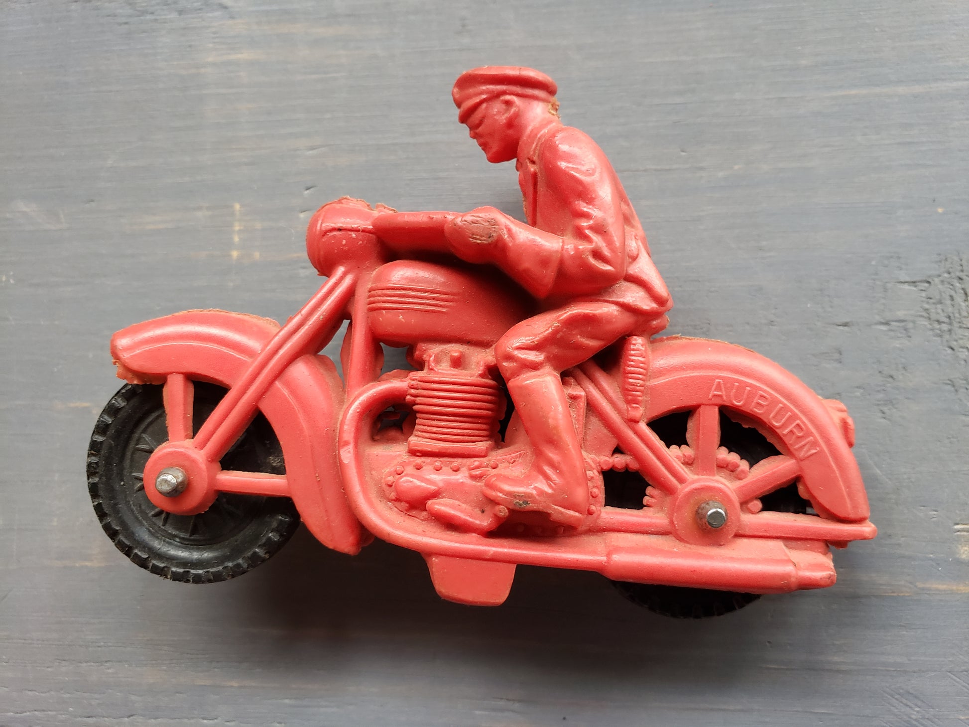 This Auburn brand toy Red man on motorcycle figurine measures 3.75 inches long and 2.5 inches tall, featuring black wheels and a vintage-inspired design. Its classic style makes it a charming collectible or decorative piece, perfect for motorcycle enthusiasts or those seeking nostalgic accents for their space. The detailed craftsmanship ensures it stands out while evoking a sense of timeless adventure. It been played with so it does have some wear.