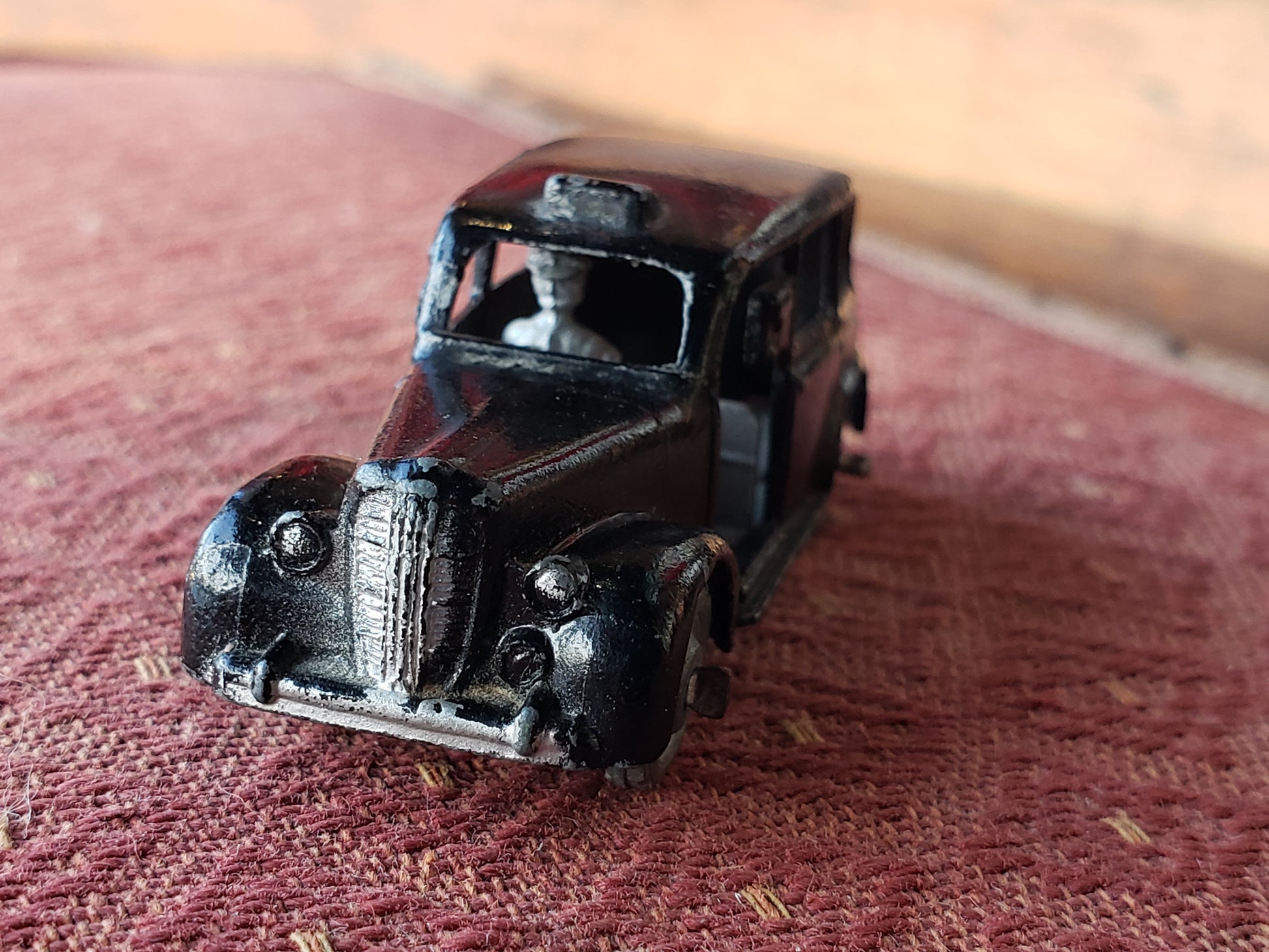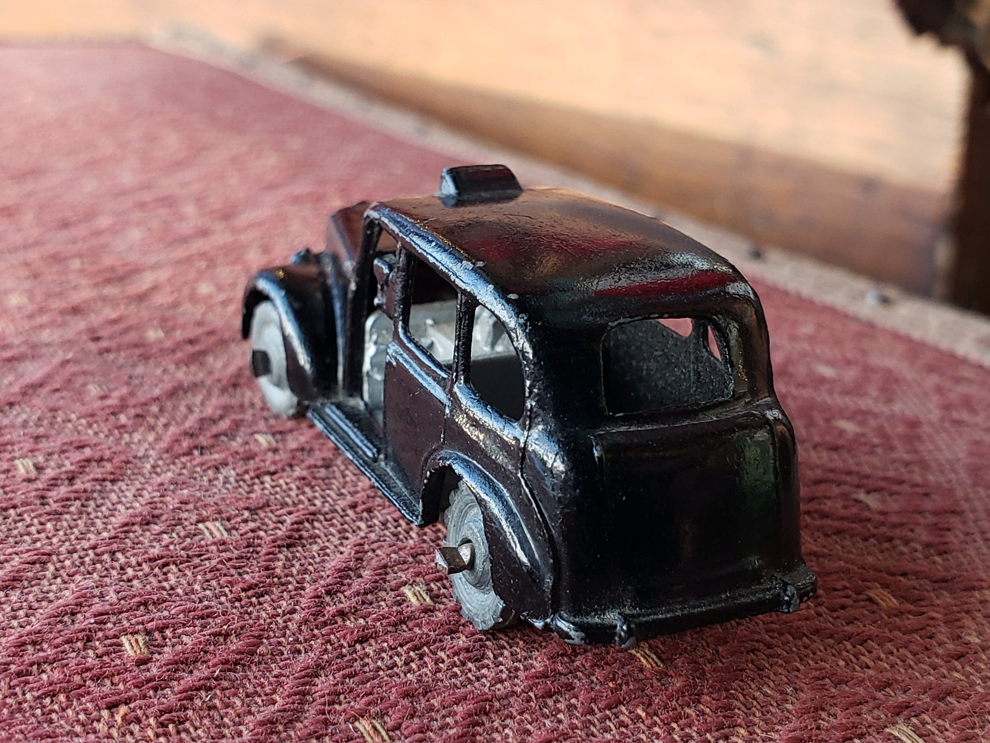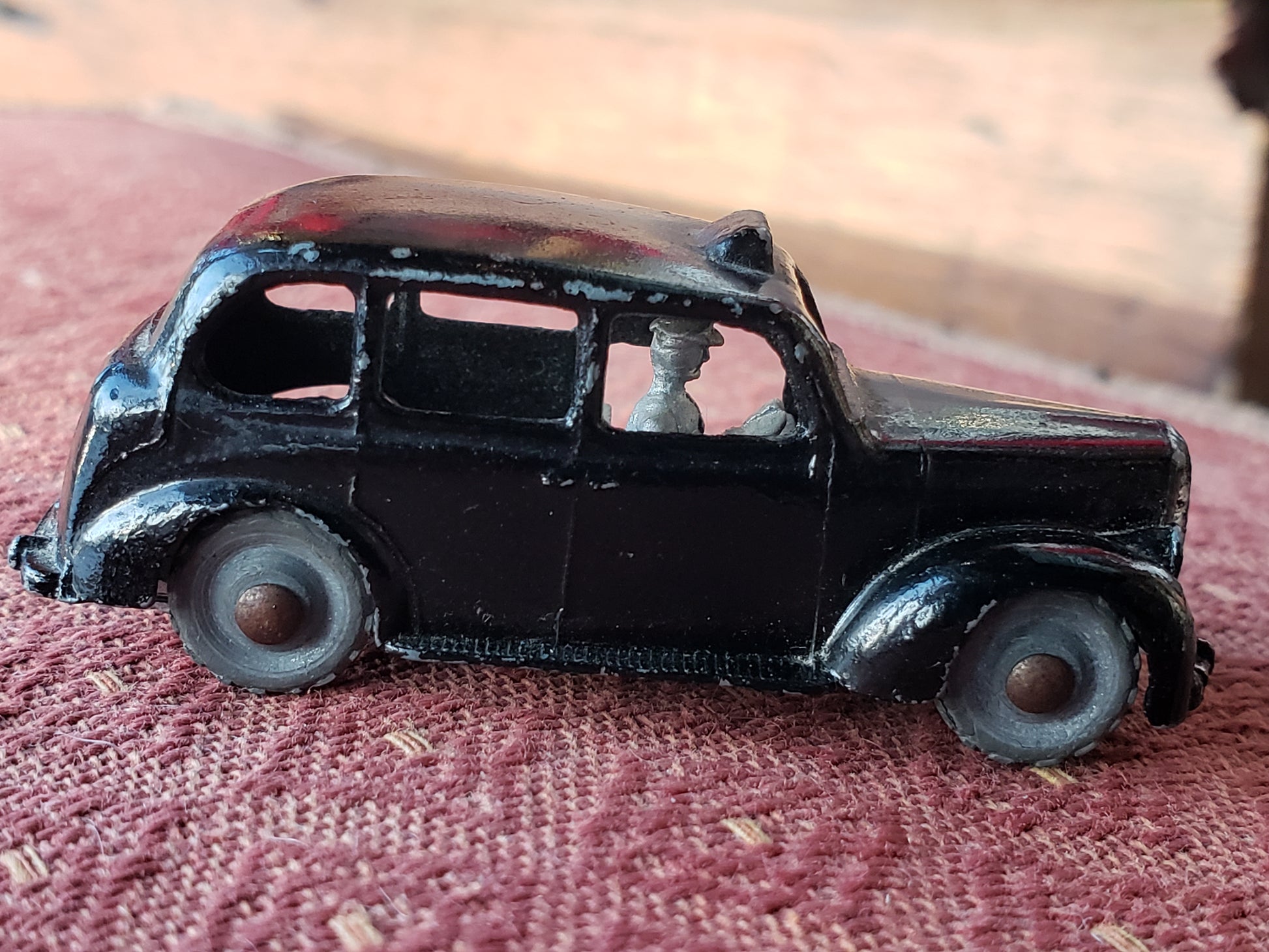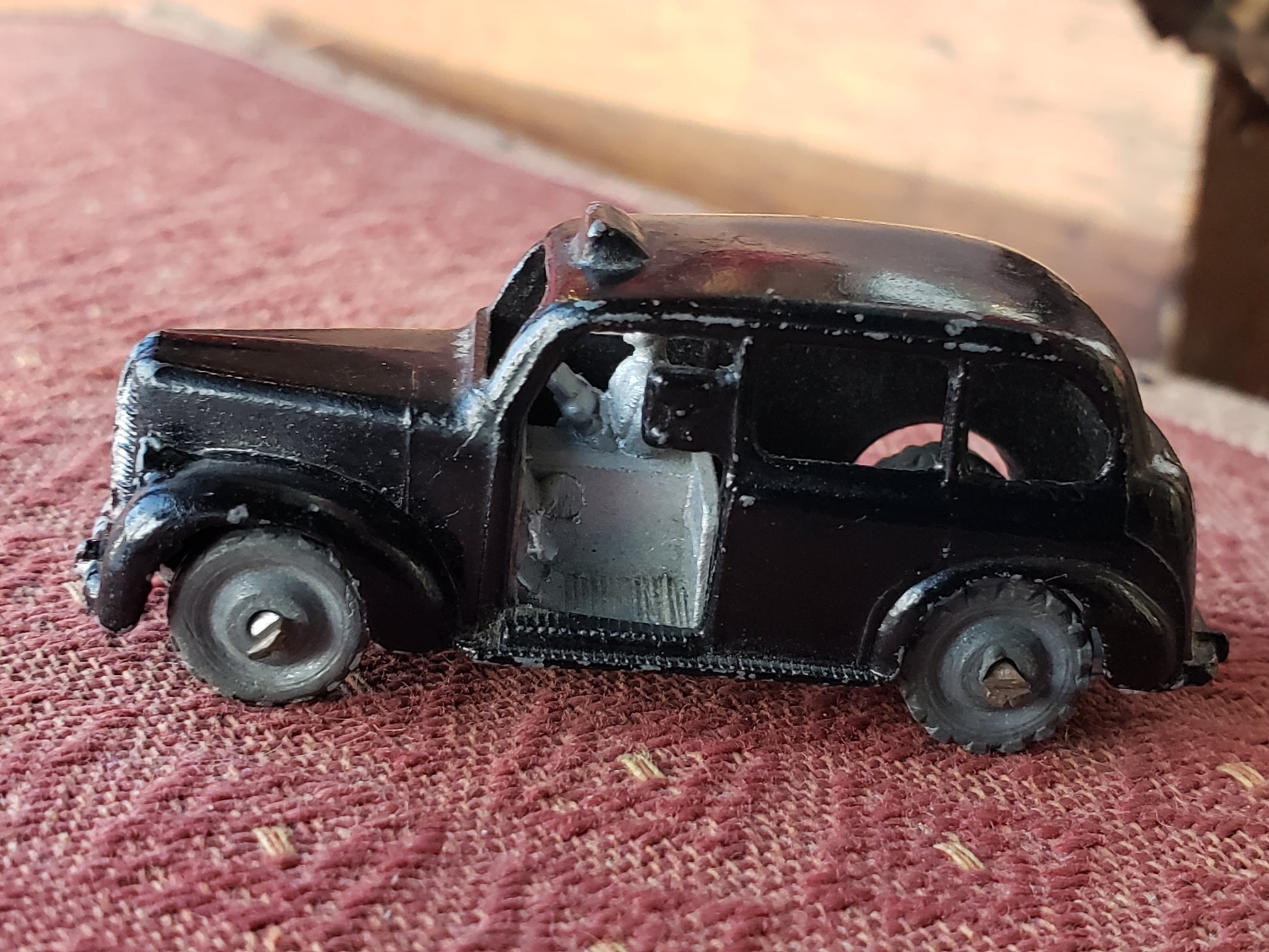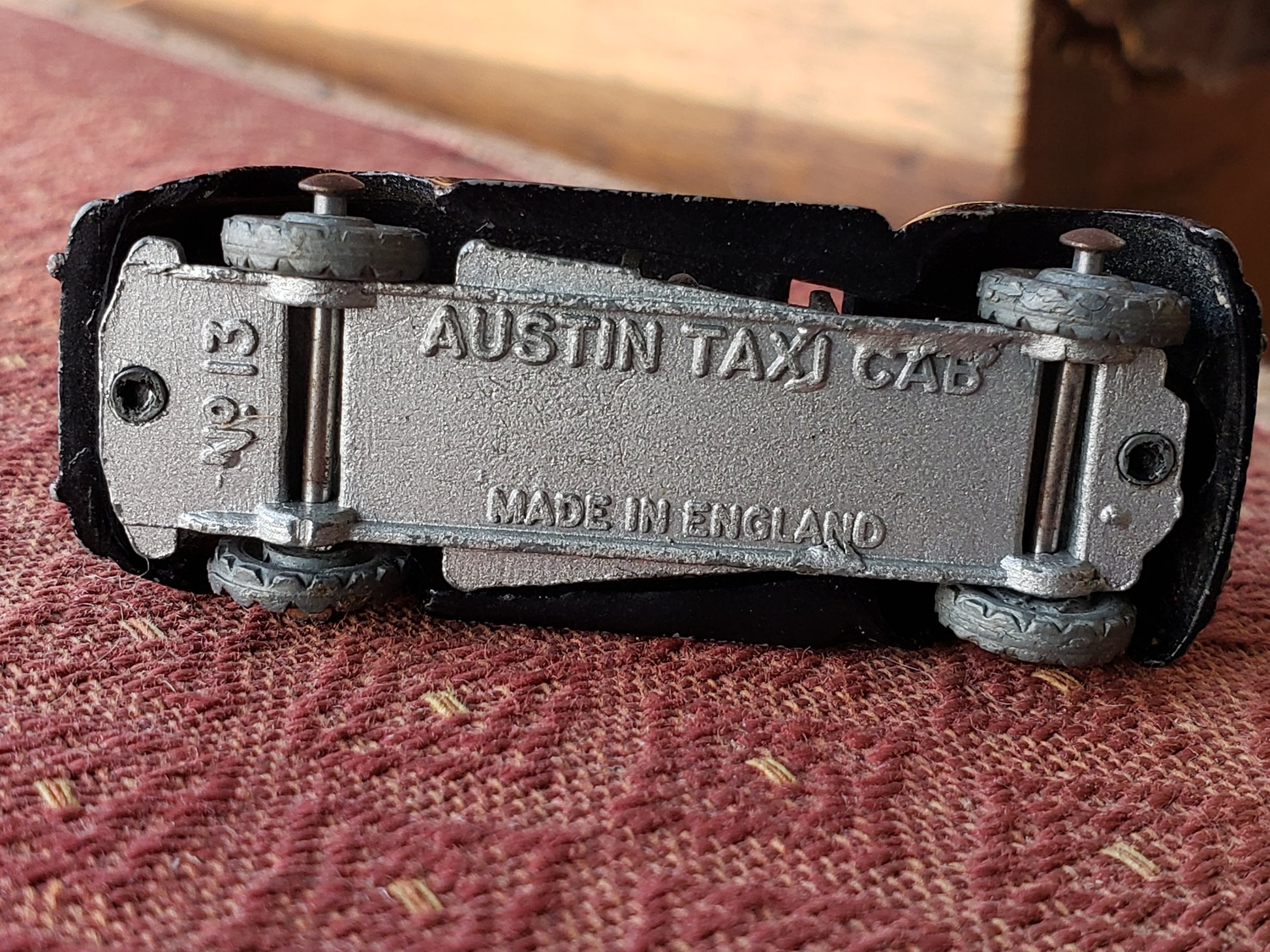 Vintage diecast car made in England, this Austin Taxi cab is no 13 in a series. It is black with silver metal wheels. Rolls freely. It even has the little taxi driver inside. Cute! Fair vintage condition.