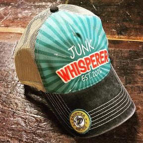 Turquoise/White Hat with junk whisperer, Frontier Relics Patch on Right corner of bill, Trucker style with Cream color Mesh back- New