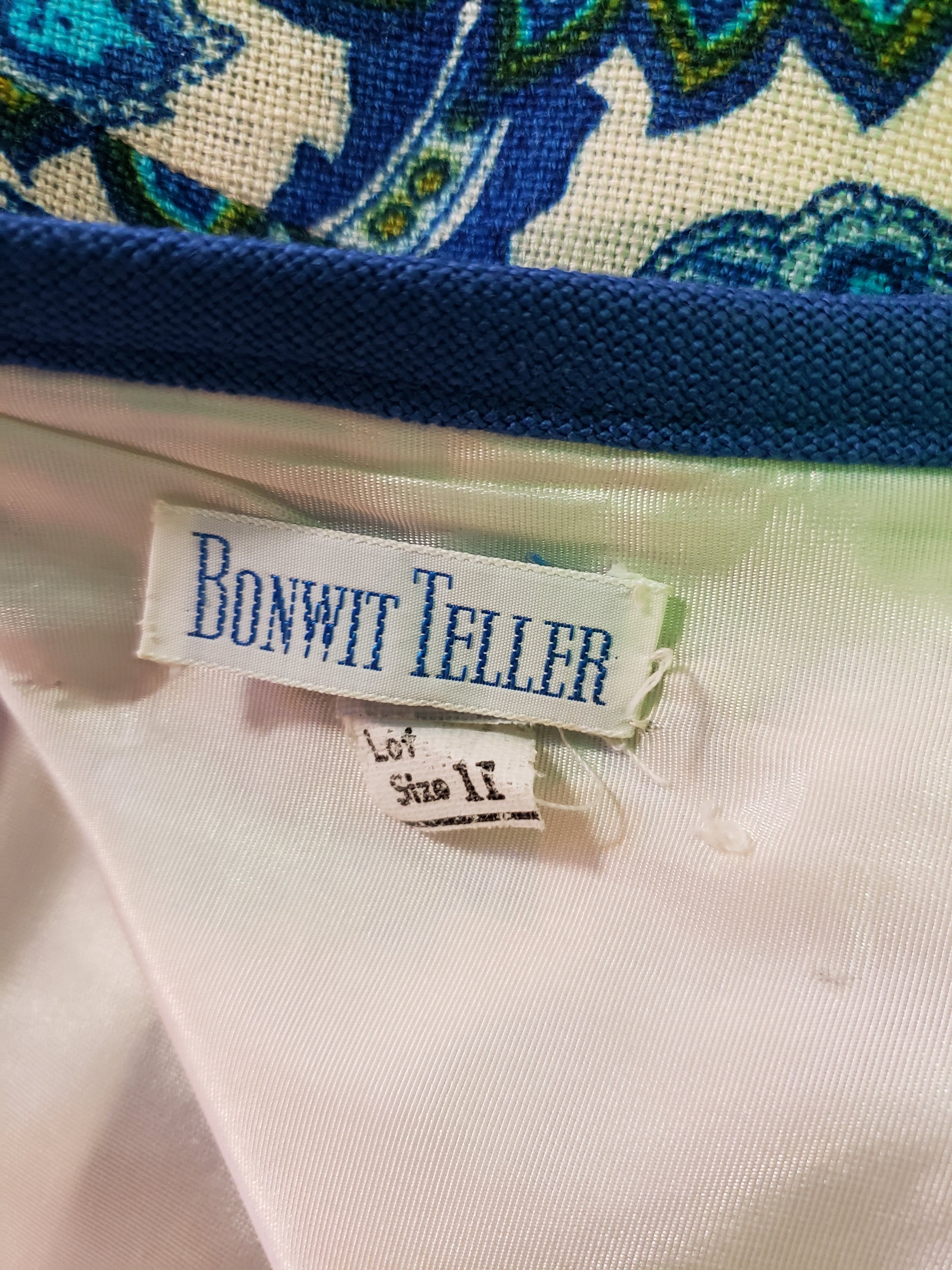 Discover timeless elegance with this stunning blue paisley vintage sheath dress by Bonwit Teller, a legendary name in American fashion. Crafted for size 11, this fully lined dress features the sophisticated silhouette that defined mid-century style. Measuring 38 inches in length with a professional hem, it's ready to wear and perfect for anyone seeking authentic vintage pieces with designer pedigree. The intricate paisley pattern adds visual interest while maintaining the refined simplicity sheath dresses are known for. A true collector's piece that brings classic glamour to any wardrobe. It has a cleverly hidden zipper on the back, and is made in season spanning cotton with a full lining. It would be adorable with a turtleneck underneath for Winter or as is for Spring or Summer. Fair vintage condition.