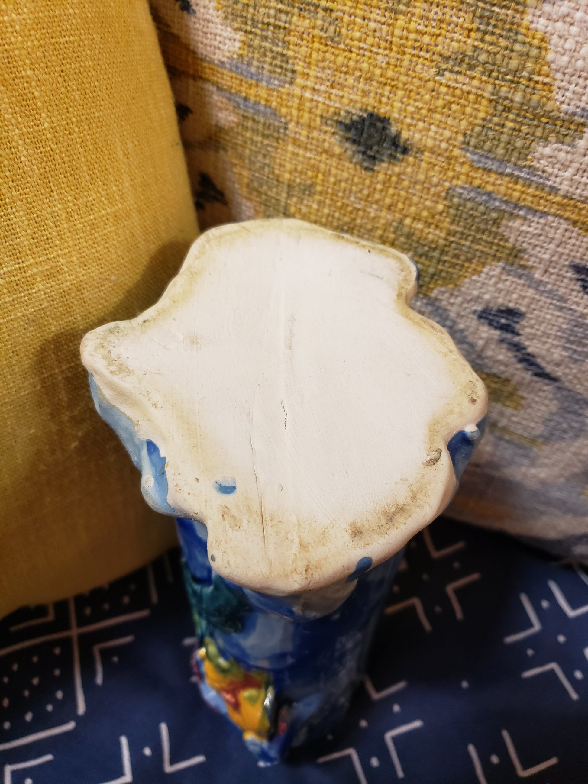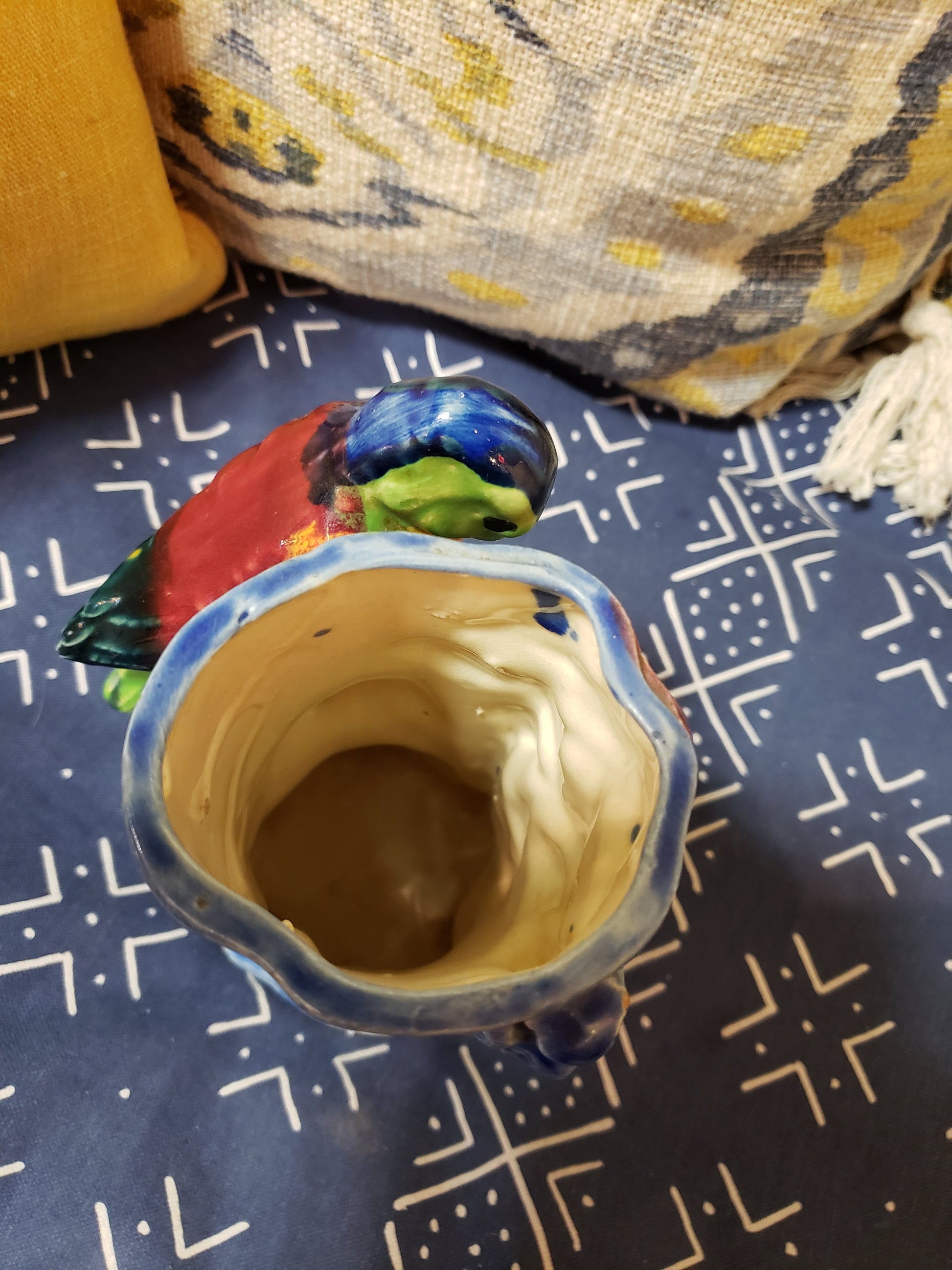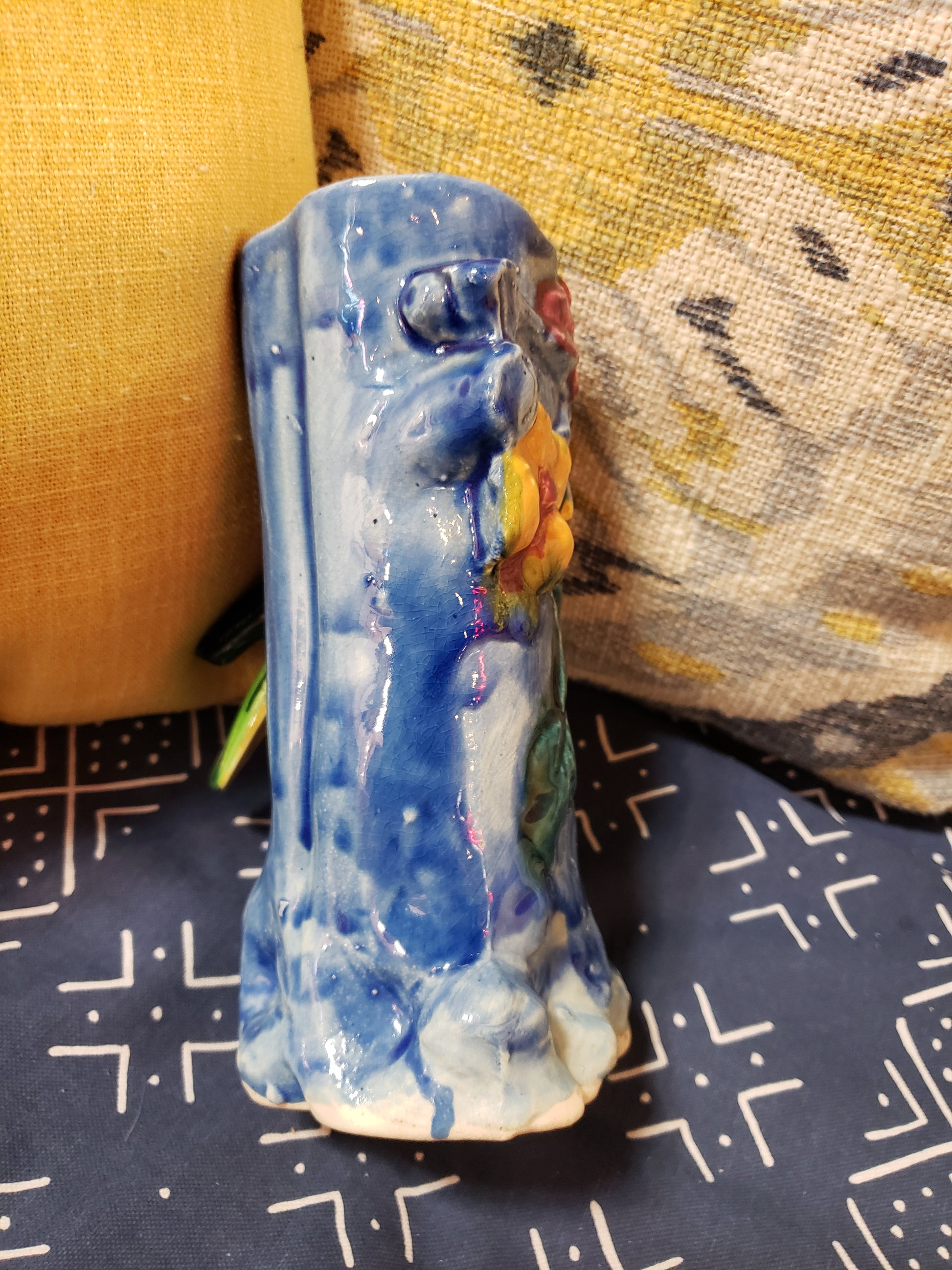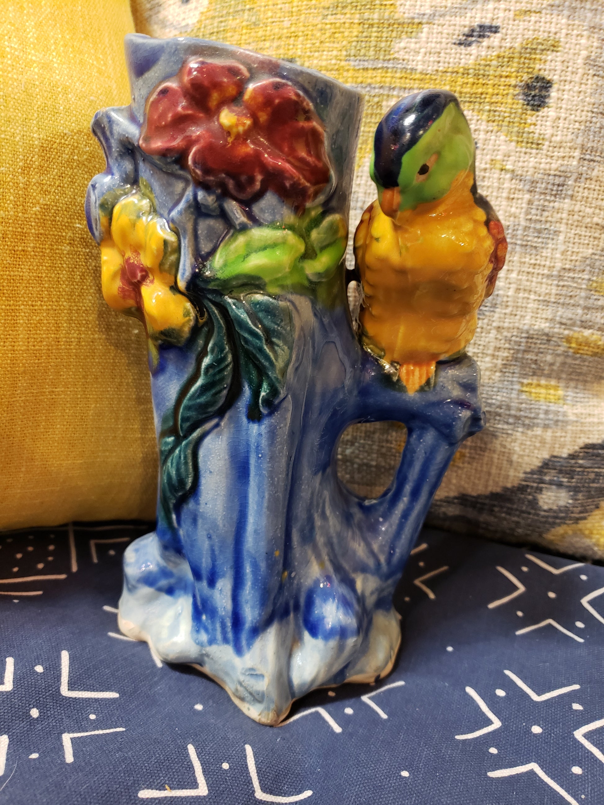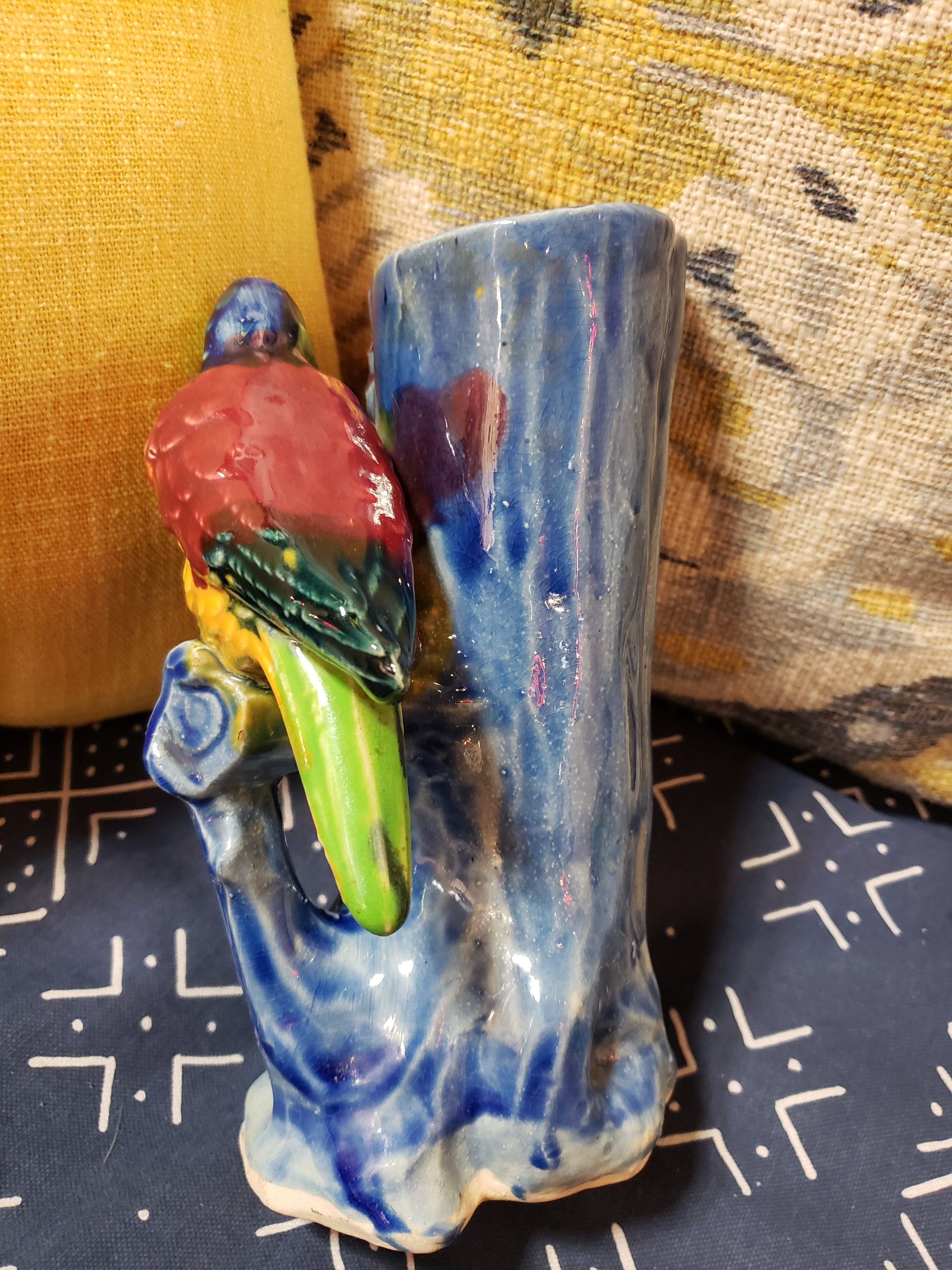 Vintage Vase of a blue tree trunk with flowers and a colorful parrot. Stands 8 1/4 inches tall and is 6 inches across. Quite eye catching to add a vibrant tropical vacation vibe to your decor. Fair vintage condition.