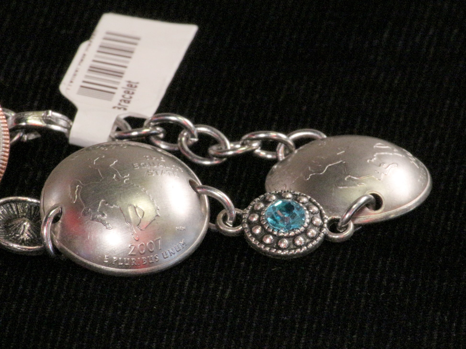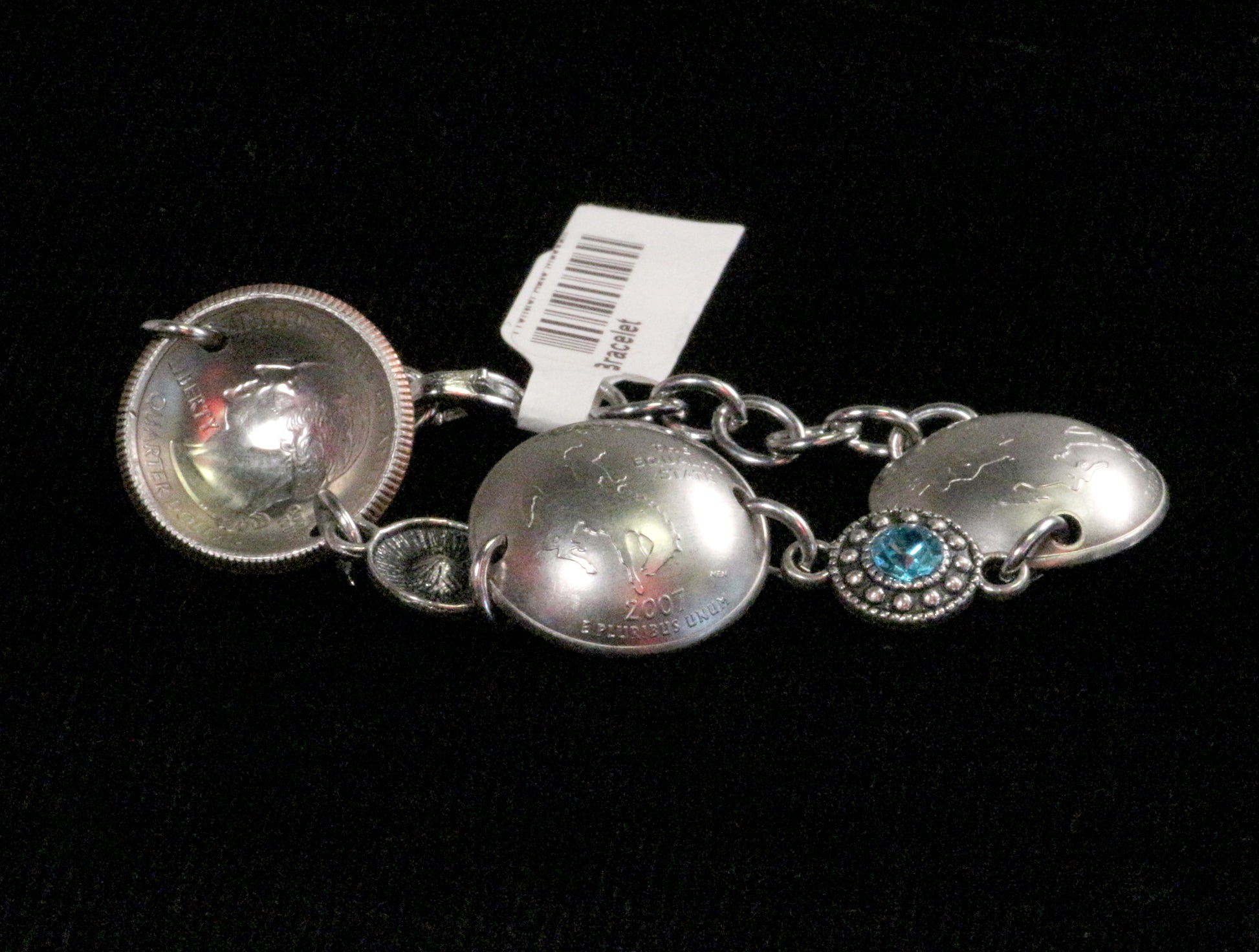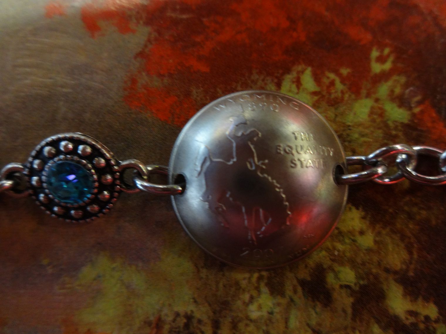 Bracelet with 3 Wyoming Quarters and two light blue and silvertone beads