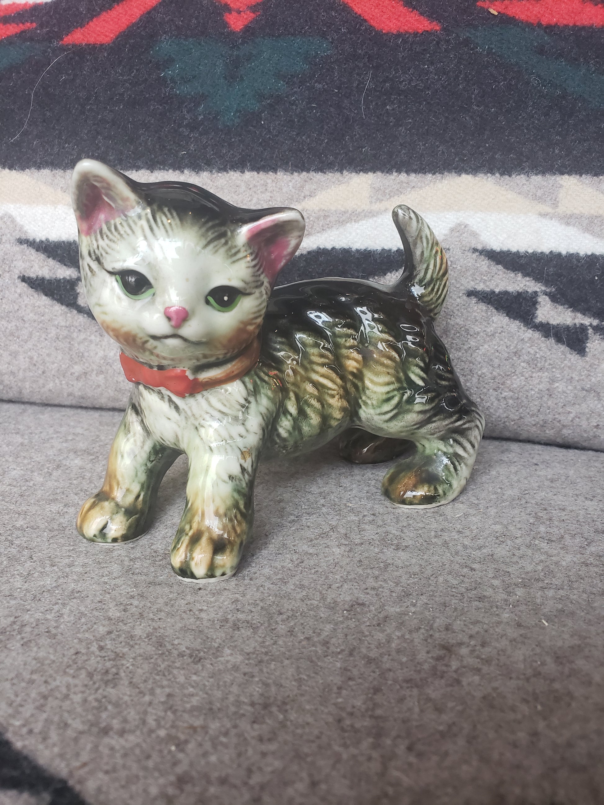 Meet your new favorite desk companion! This charming ceramic gray tabby cat captures pure feline personality with its playful uplifted tail and irresistibly cute expression. Standing 4 inches tall and stretching 5 inches long, it's the perfect size for shelves, desks, or nightstands. The adorable tabby markings and cheerful red collar add character and warmth to any space. Whether you're a cat lover seeking a delightful decorative piece or looking for a thoughtful gift, this little ceramic treasure brings instant joy and charm to your home. fair vintage condition.