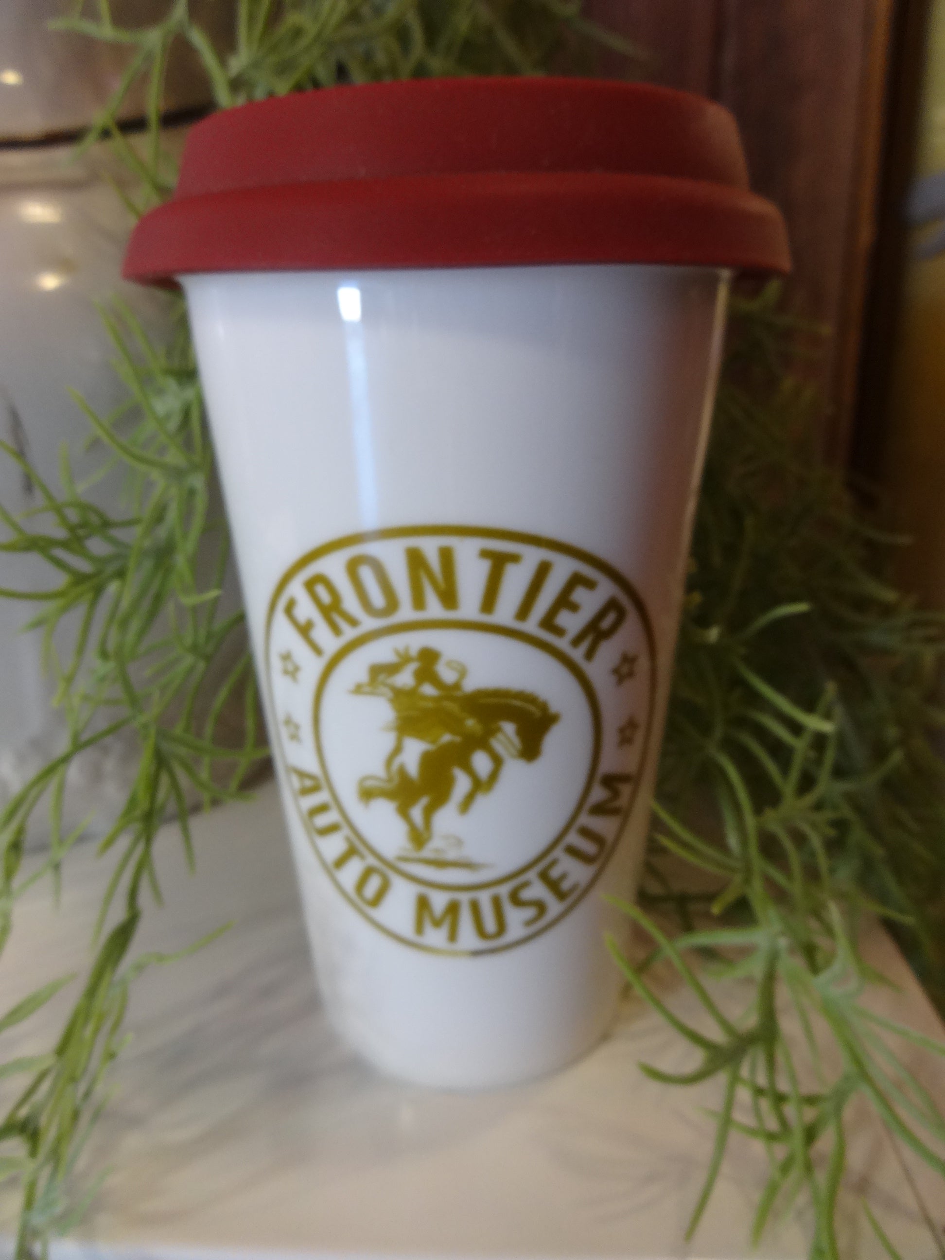 Enjoy your beverage in style with this Ceramic Travel Mug with Silicone Lid. Features the Frontier Auto Museum Logo.