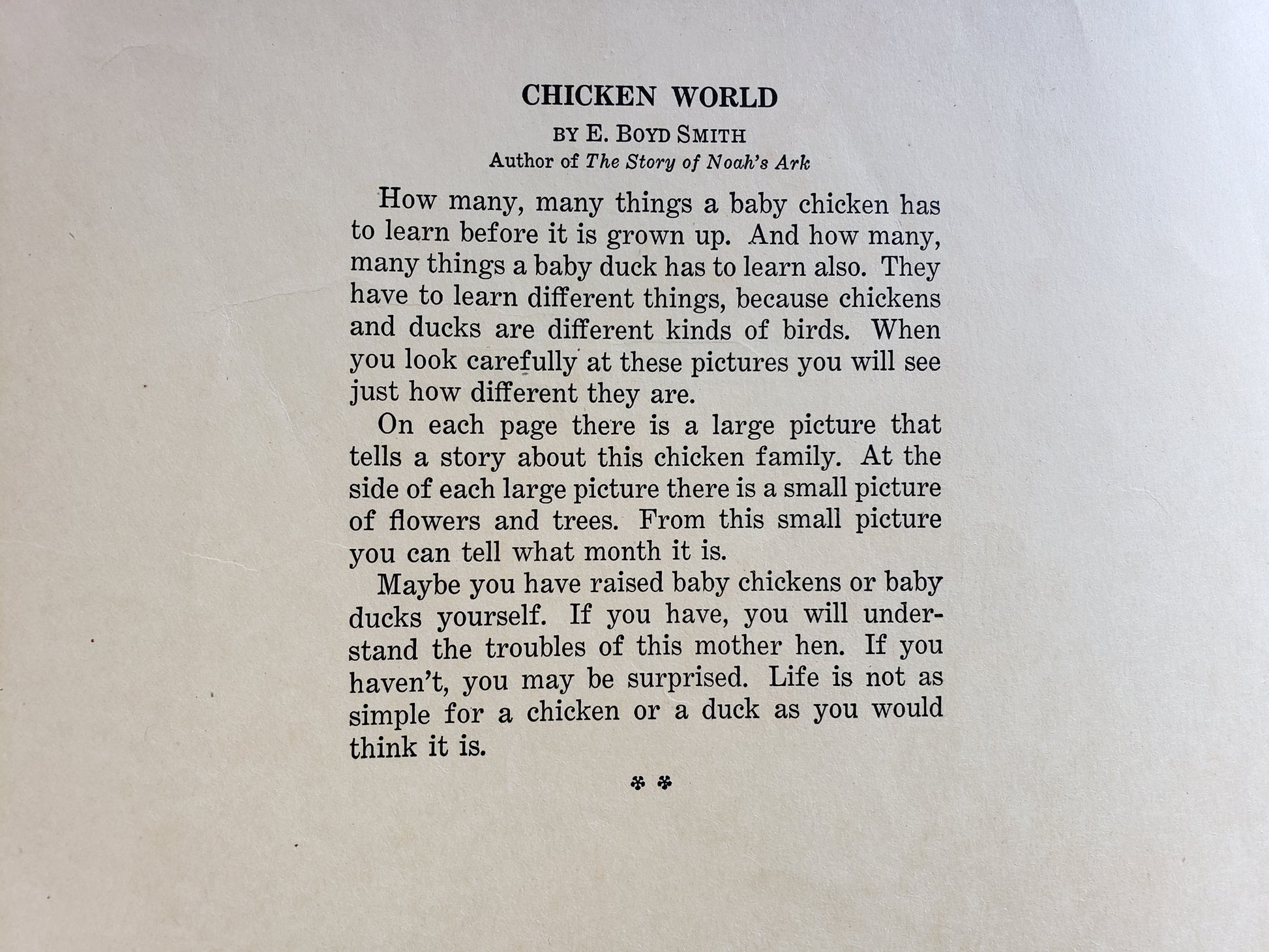 Chicken World by E. Boyd Smith (1910) is a charming, beautifully illustrated guide that introduces children to the joys and basics of raising chickens. This timeless book combines engaging storytelling with colorful, detailed artwork, making it an inspiring resource for young readers curious about farm life. Perfect for families and educators, it nurtures a love for animals and teaches practical lessons in a captivating way. Fair vintage condition.