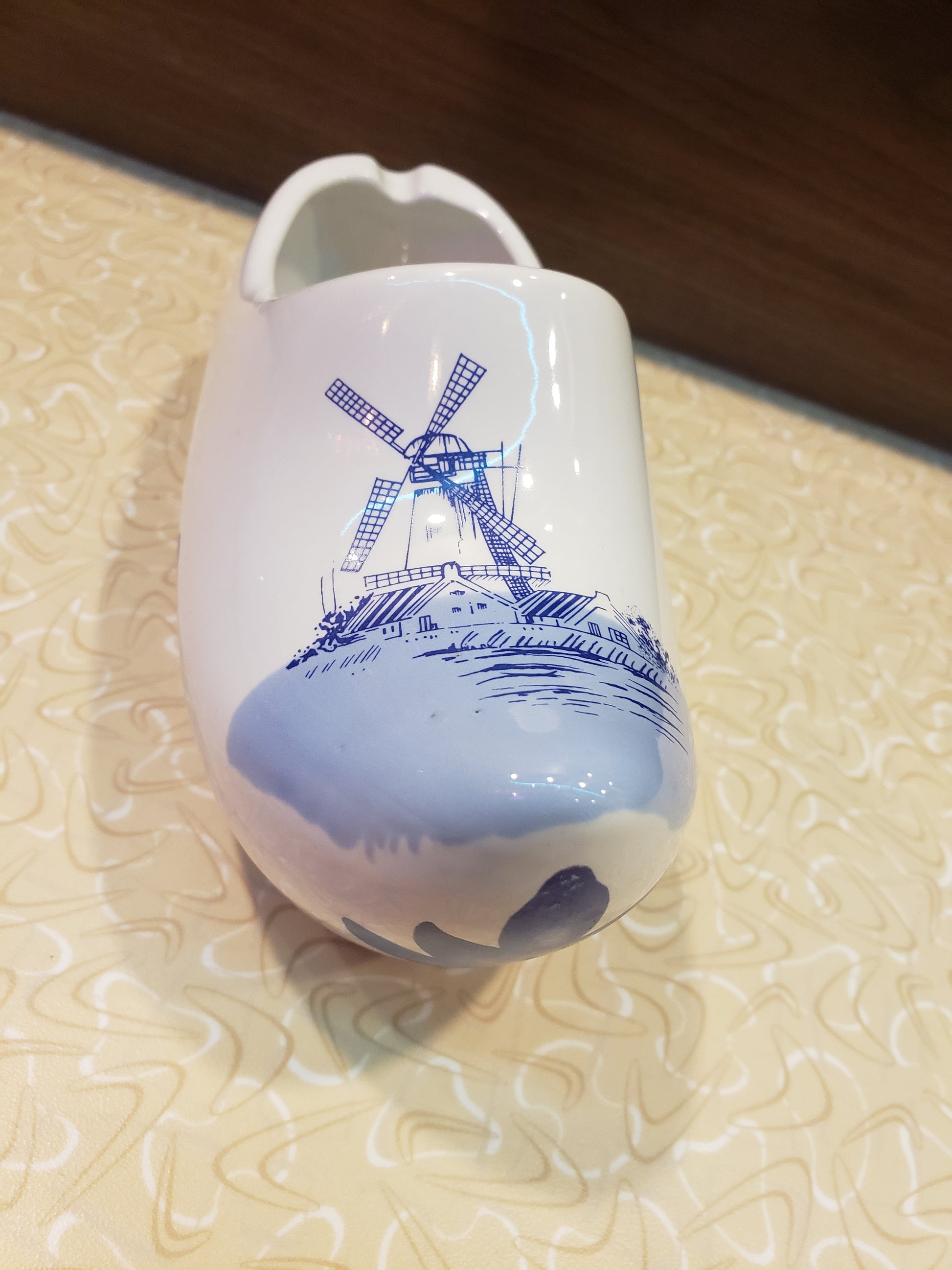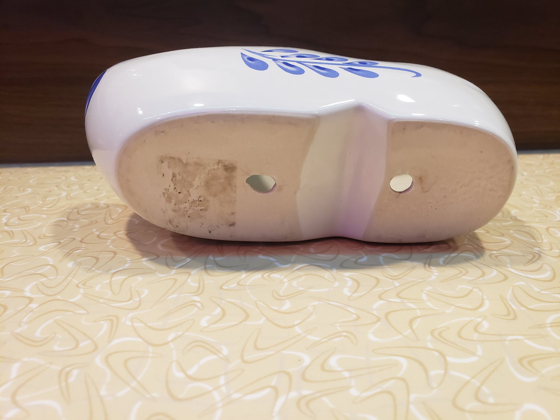 Bring authentic Dutch charm into your home with this striking Delft Holland style porcelain clog. Handcrafted in the timeless blue and white palette, this decorative piece features an iconic windmill design that captures the essence of traditional Netherlands craftsmanship. Practical drainage holes on the bottom make it perfect for displaying fresh flowers or small plants, adding both elegance and functionality to any room. A distinctive accent piece that celebrates European heritage and artisanal quality. Measures 7 inches long and 3.75 inches tall. Fair vintage condition.