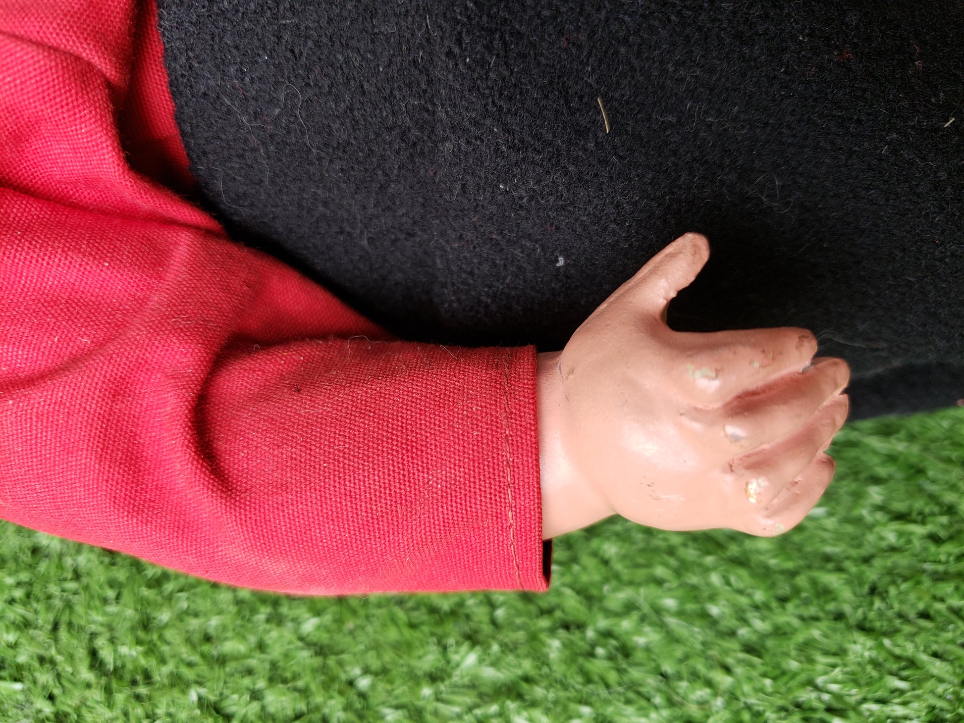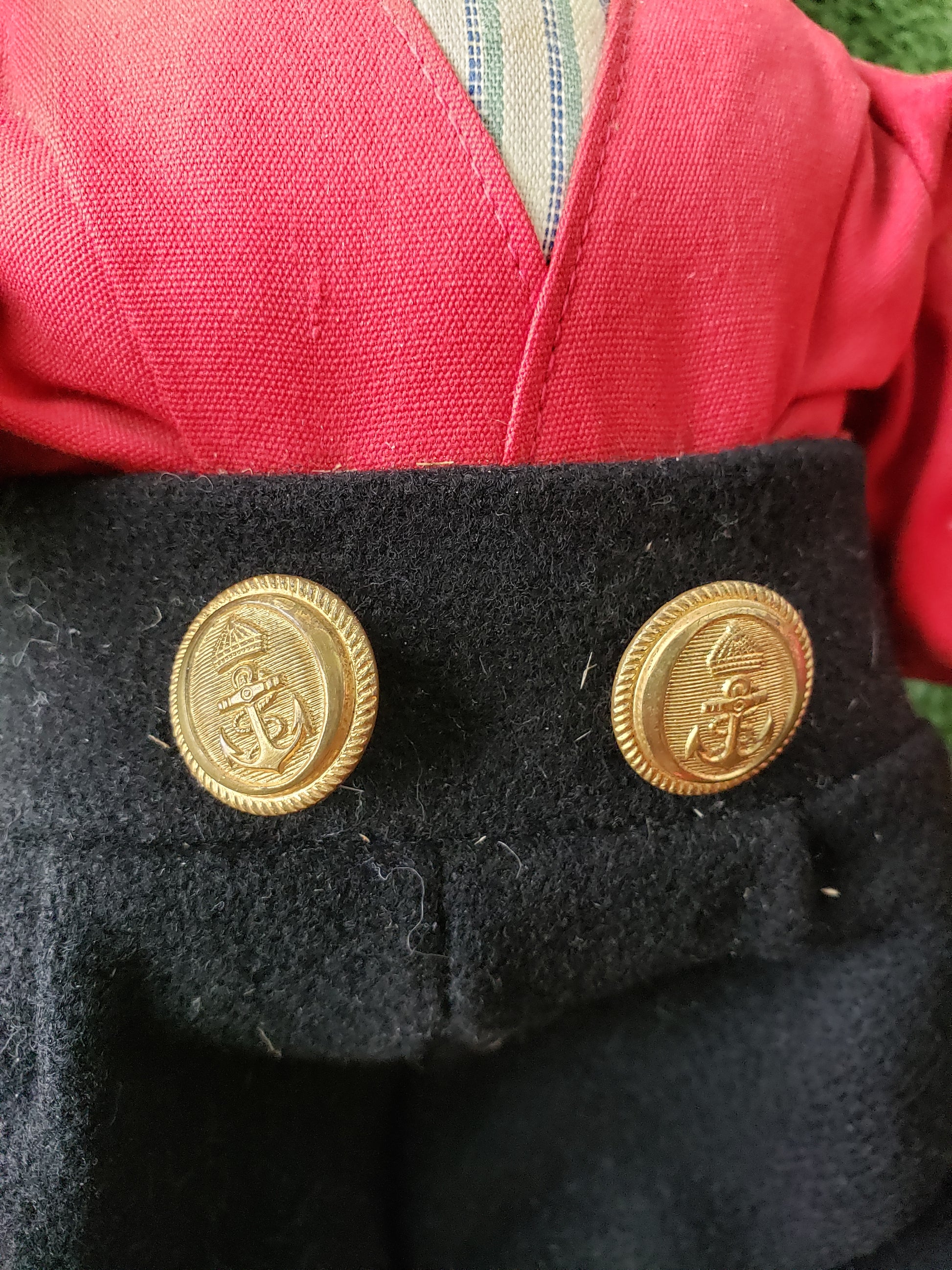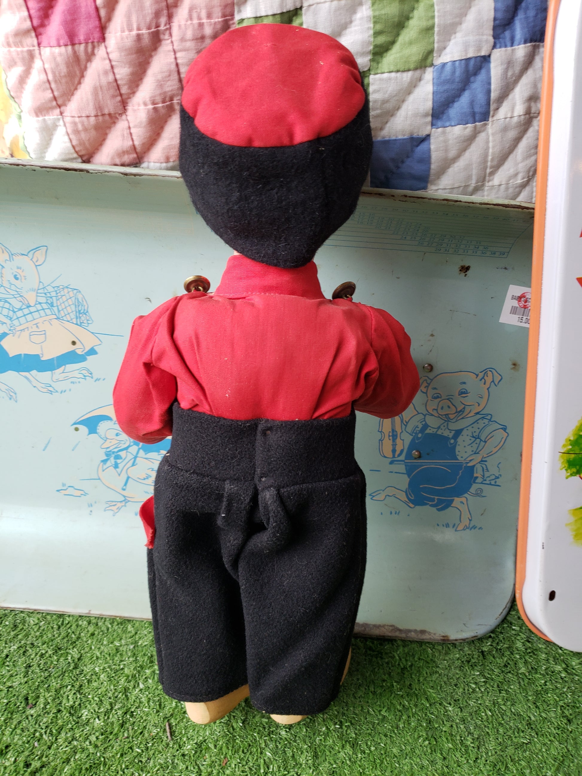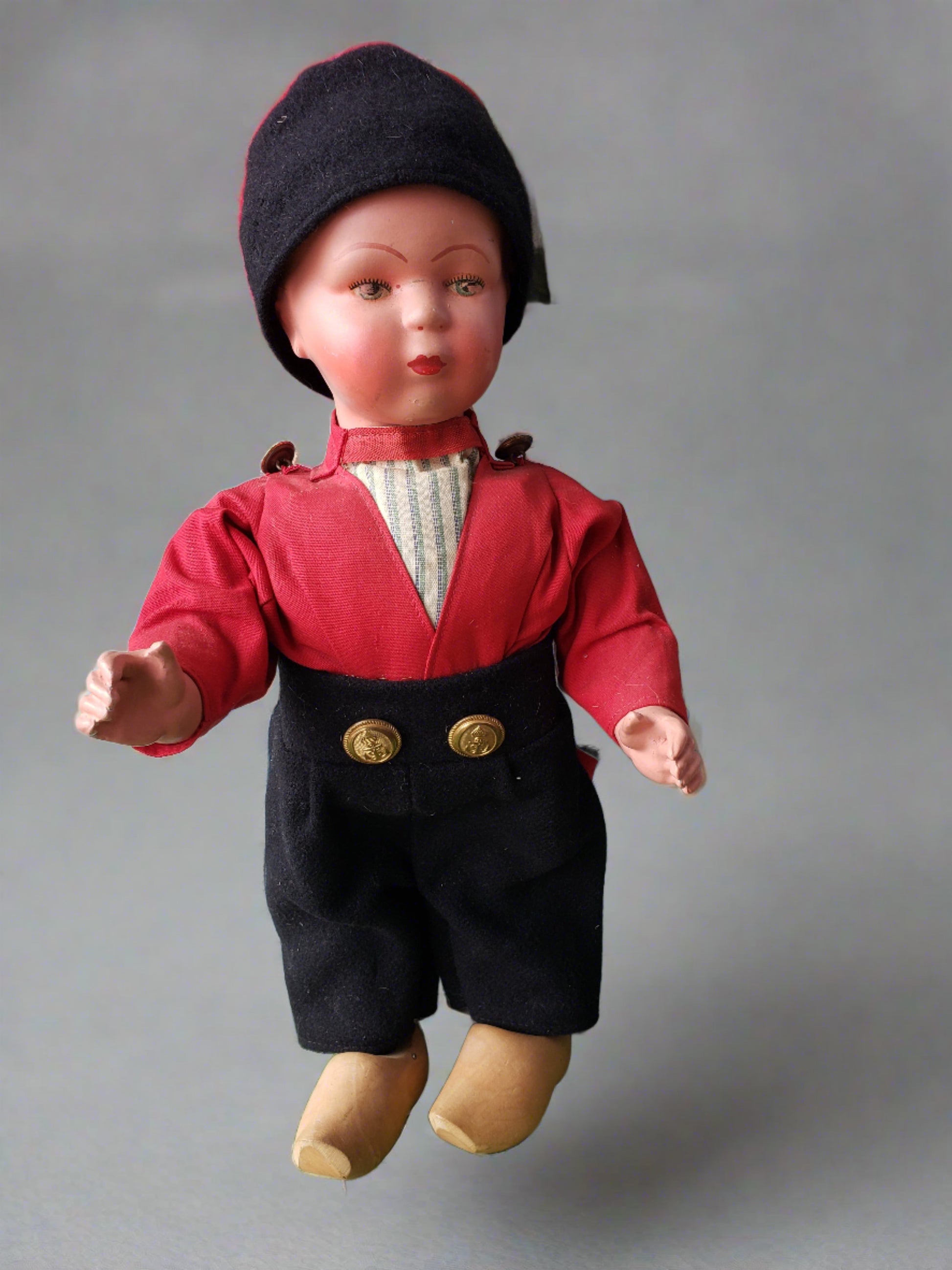 This doll was made in the 1950's, when you move it's legs his head moves. He is dressed in black wool pants, a ticking shirt and a red woven jacket, with a black and red cap and wooden Dutch shoes. 14 inches tall, hand painted lips and eyes and rosy red cheeks. Brass sailor buttons on the pants and jacket. Fair vintage condition.