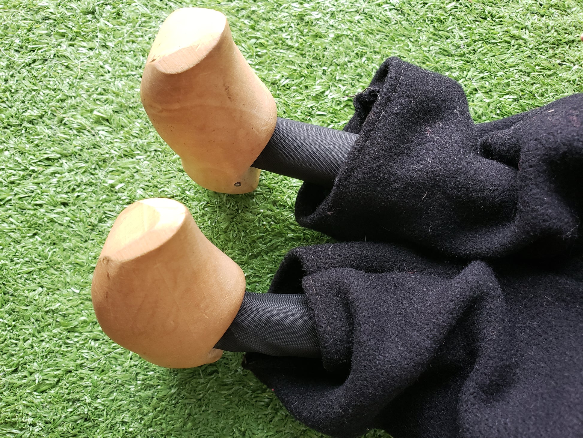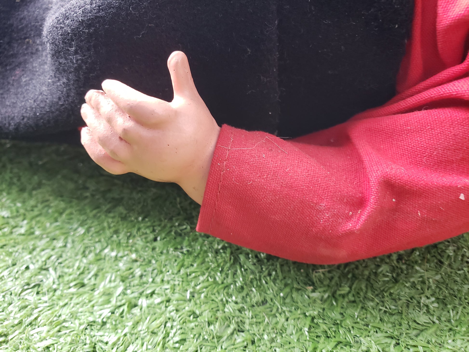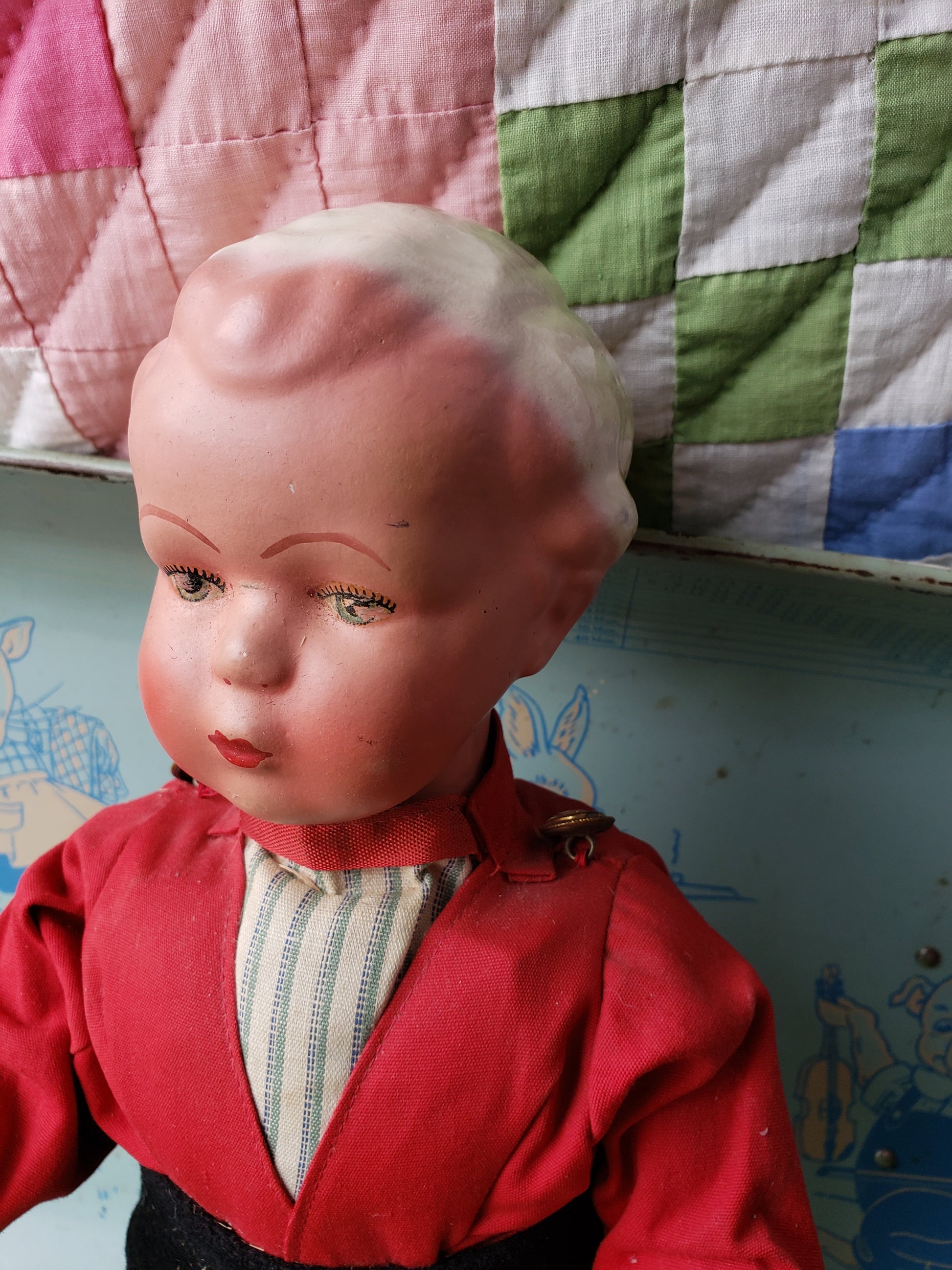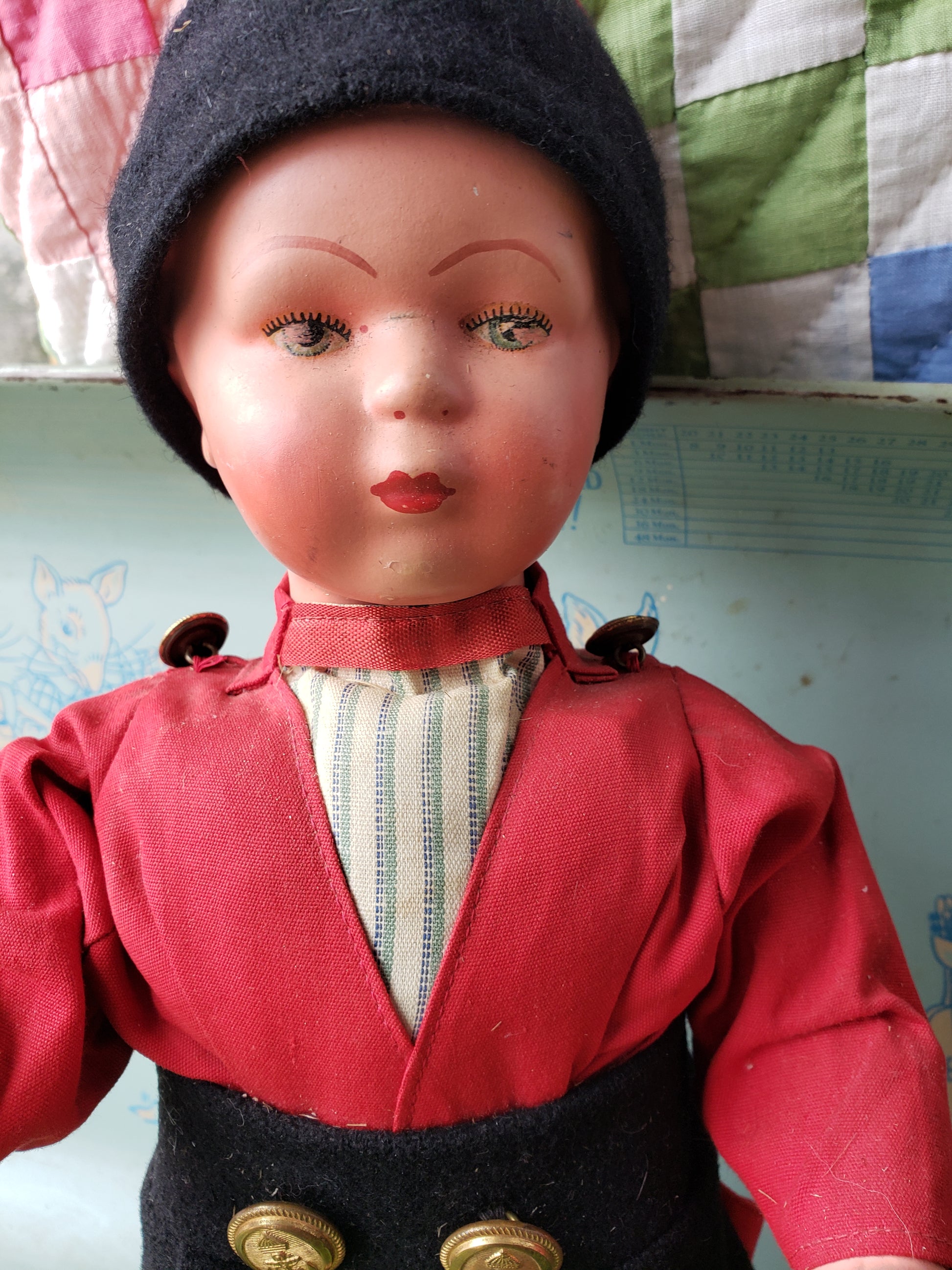 This doll was made in the 1950's, when you move it's legs his head moves. He is dressed in black wool pants, a ticking shirt and a red woven jacket, with a black and red cap and wooden Dutch shoes. 14 inches tall, hand painted lips and eyes and rosy red cheeks. Brass sailor buttons on the pants and jacket. Fair vintage condition.