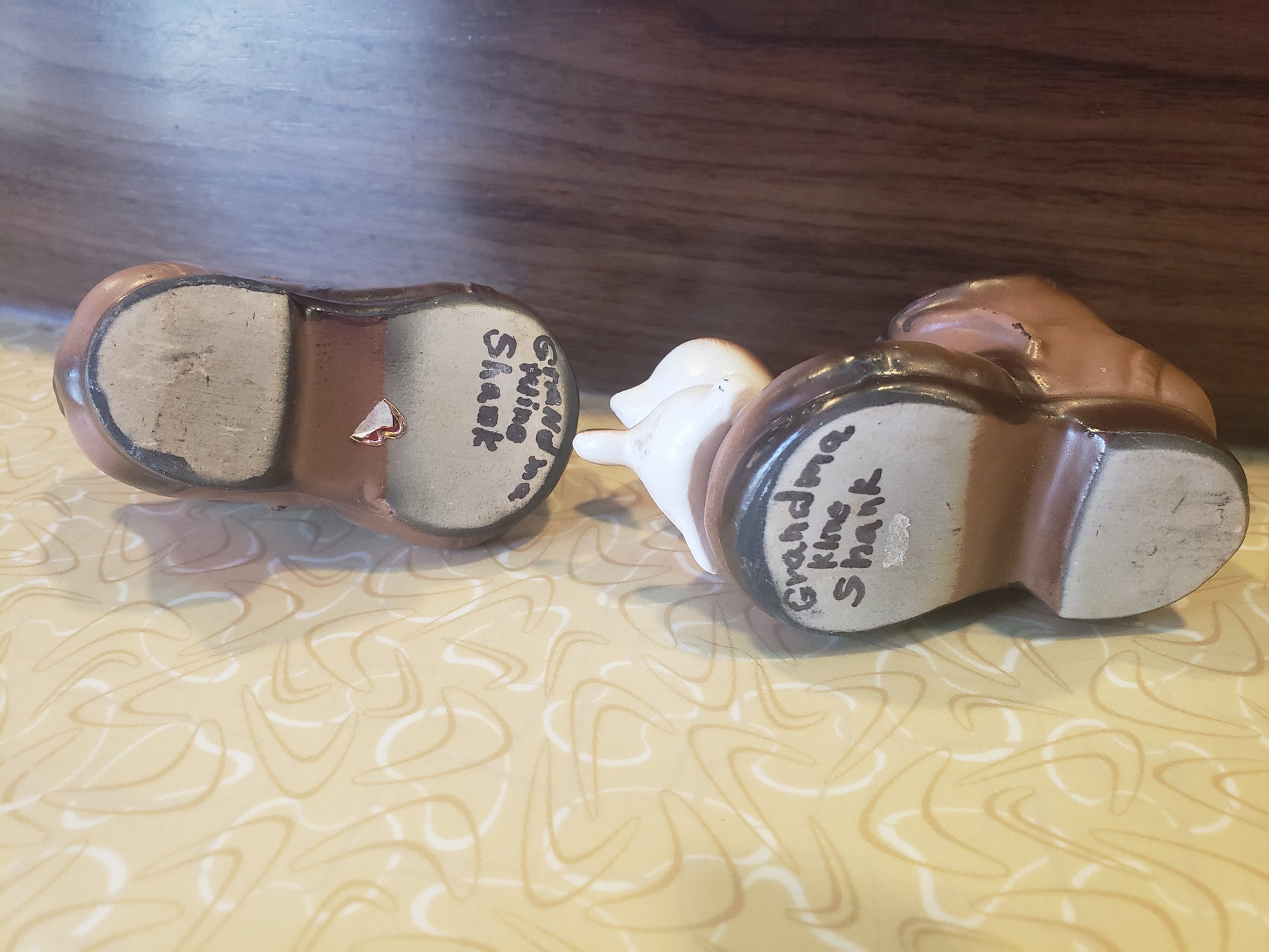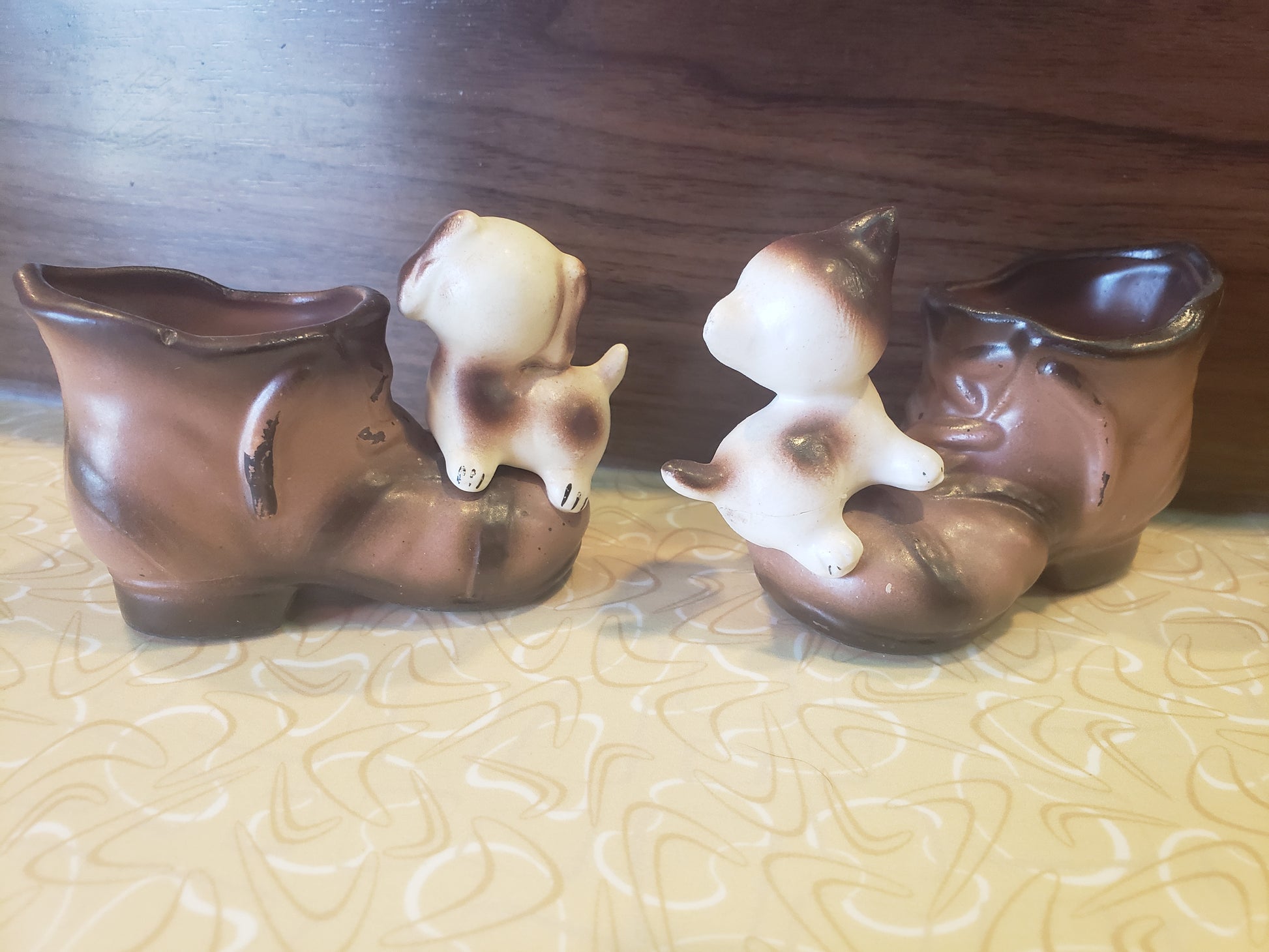 Charming vintage ENESCO pair featuring an adorable kitten and puppy sitting on tiny boots. These delightful 2.5-inch porcelain figurines serve double duty as whimsical planters or toothpick holders, making them perfect for collectors and nostalgic décor enthusiasts. Each character captures classic ENESCO craftsmanship with fine details and endearing expressions. Ideal for adding vintage character to shelves, desks, or kitchen counters. A delightful conversation starter that brings warmth and personality to any space. Fair vintage condition.