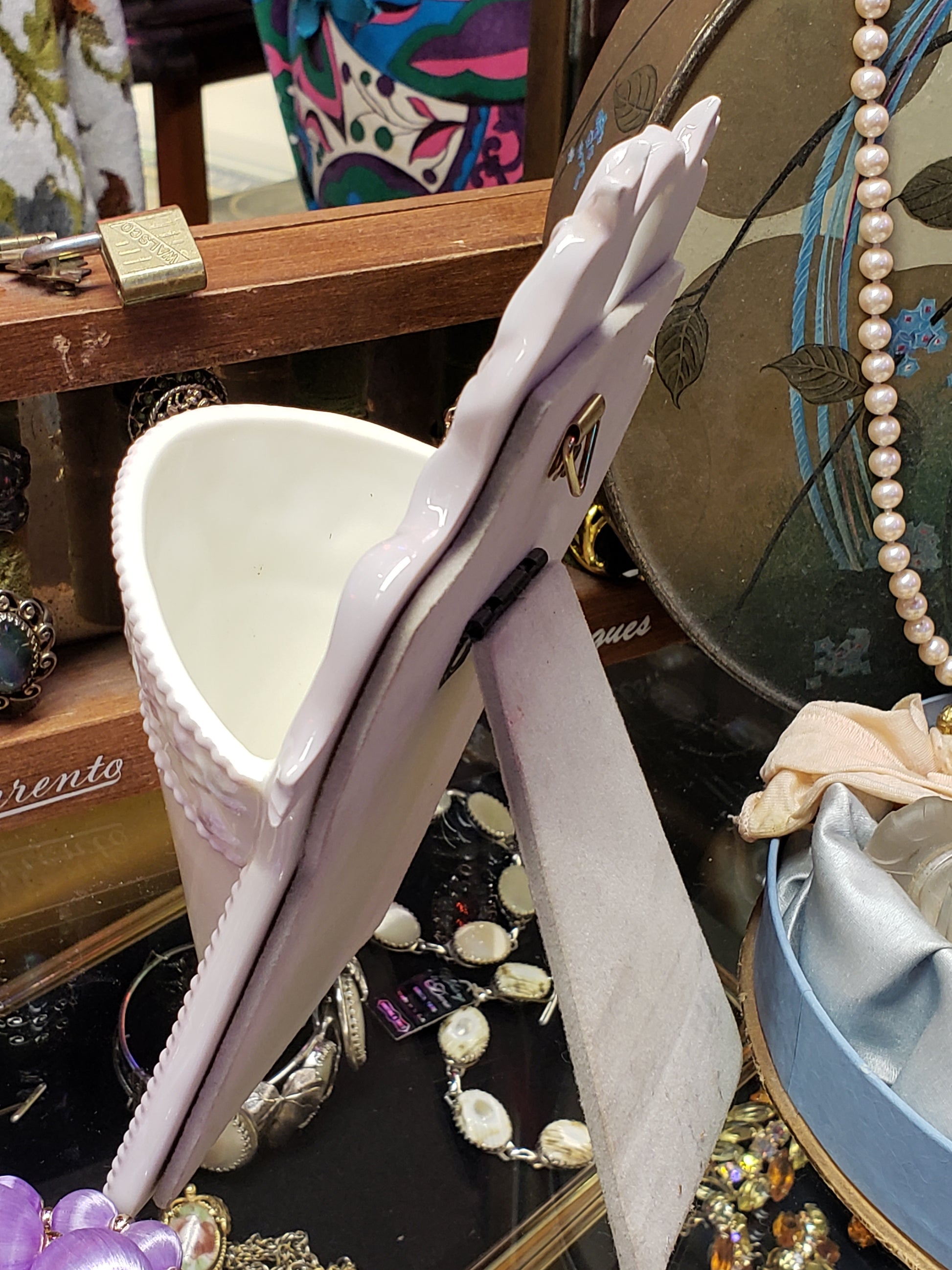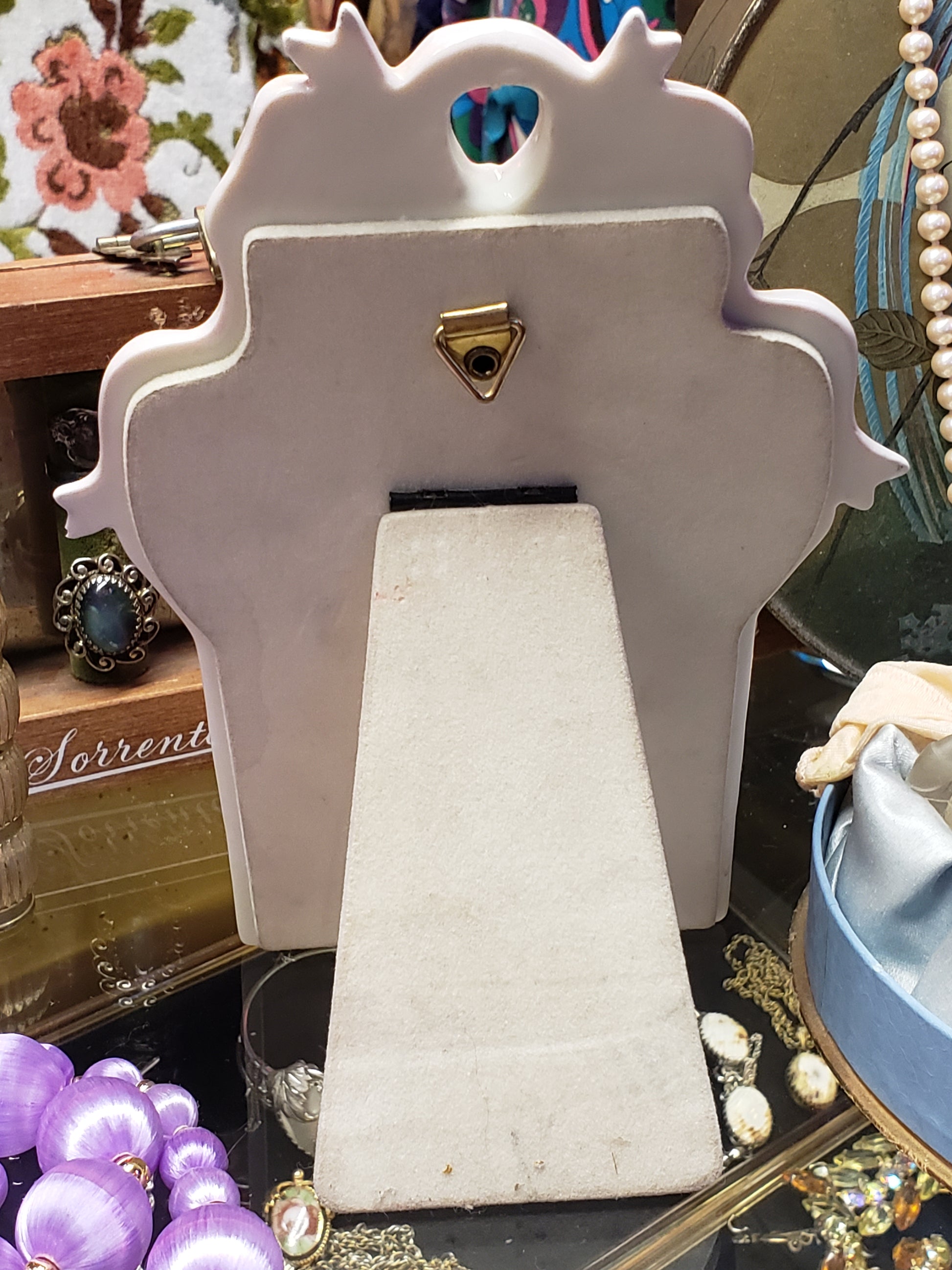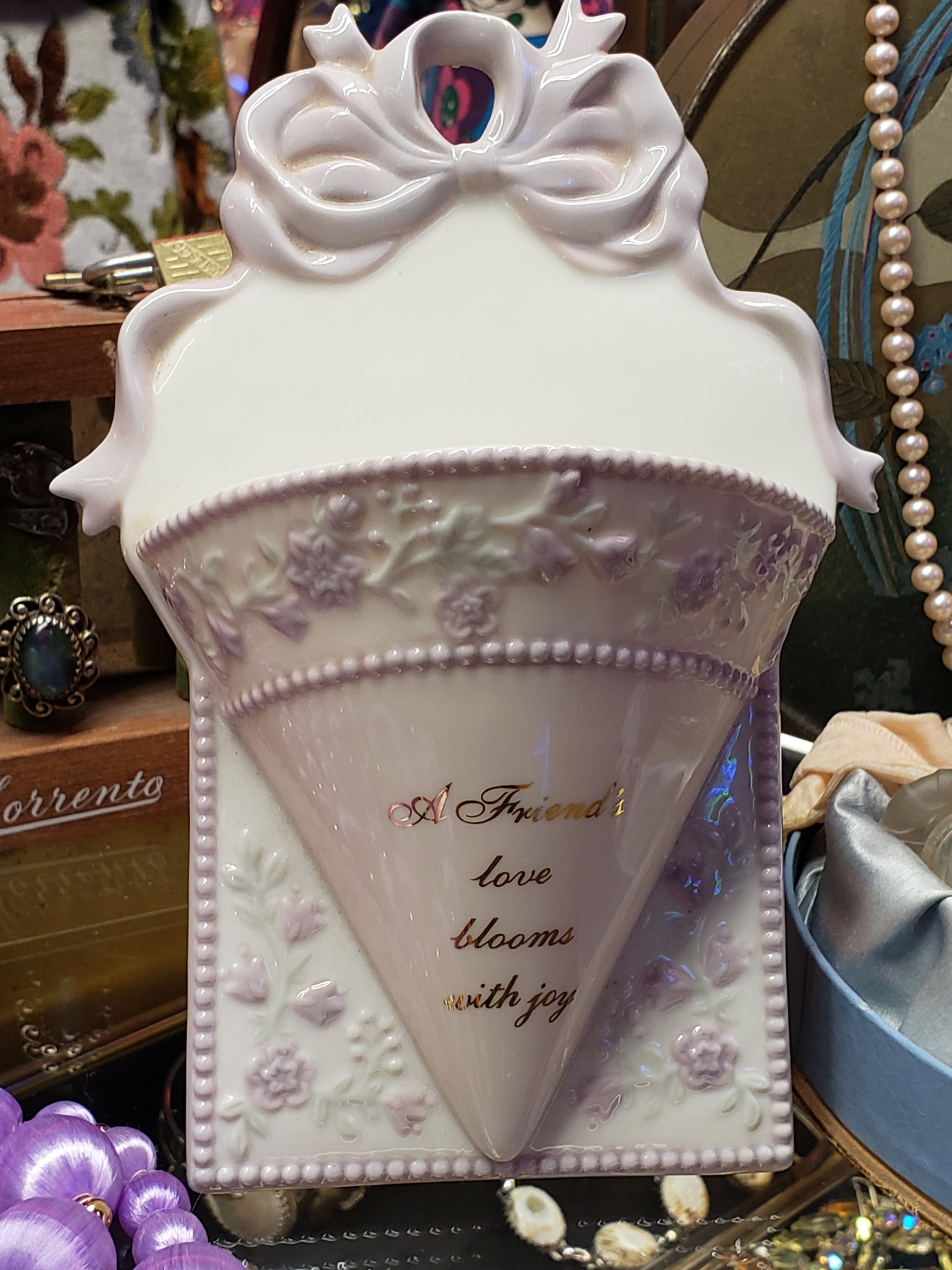 This delightful porcelain wall vase also has a hidden stand behind it so you may also display it on a shelf or desk. It is cream colored with violet and pale green floral design, and "A Friend's Love Blooms With Joy" is written in gold on the front. A lovely reminder of the value of friendship, a great gift for that special someone. It is 7.5 inches tall and is 5 inches wide. It could hold dried flowers, greenery or fresh flowers. On the back is a brass wall hanger and also a hinged stand. Fair vintage condition. Recently reduced price!