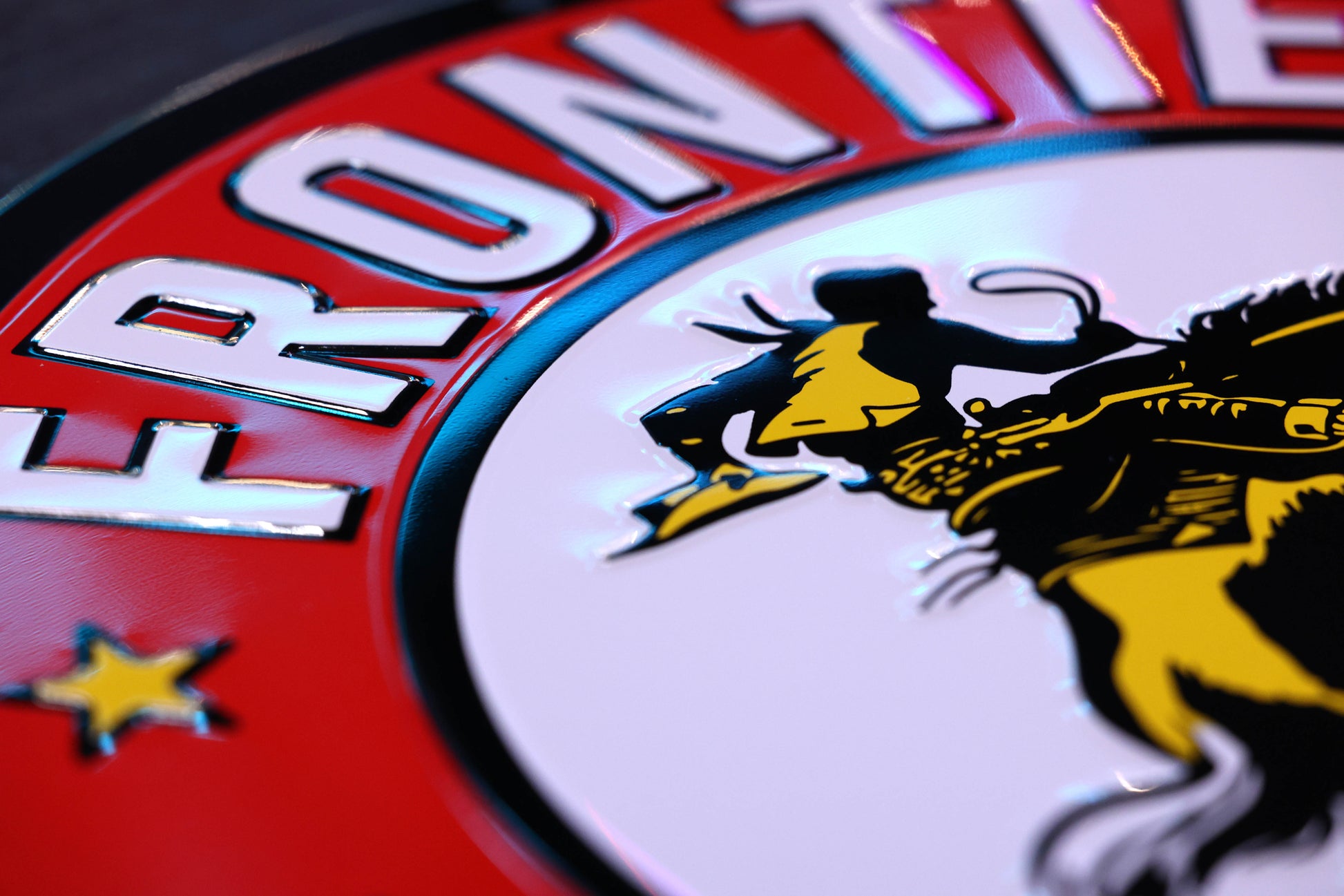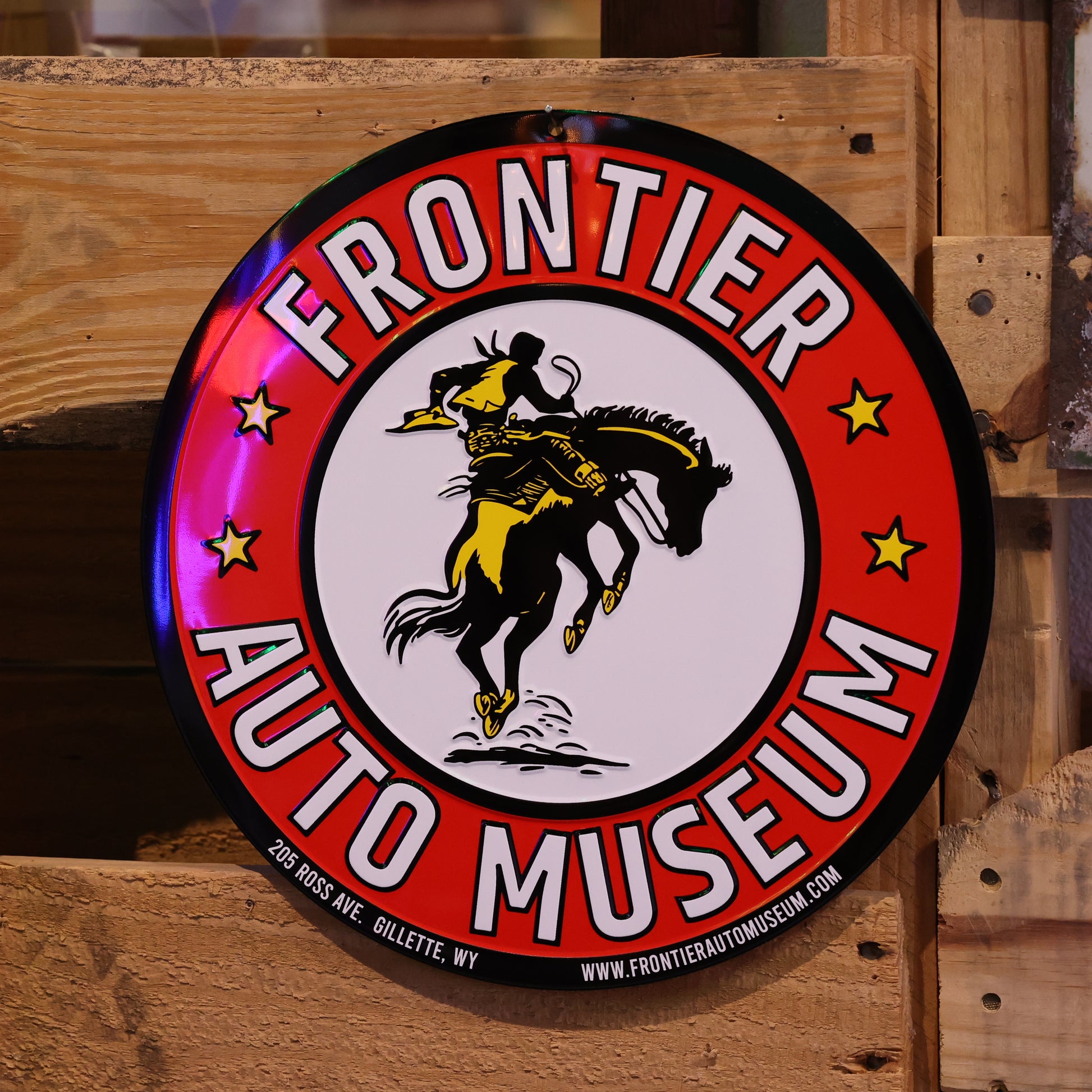 12 inch round metal embossed sign featuring the Frontier Auto Museum logo.