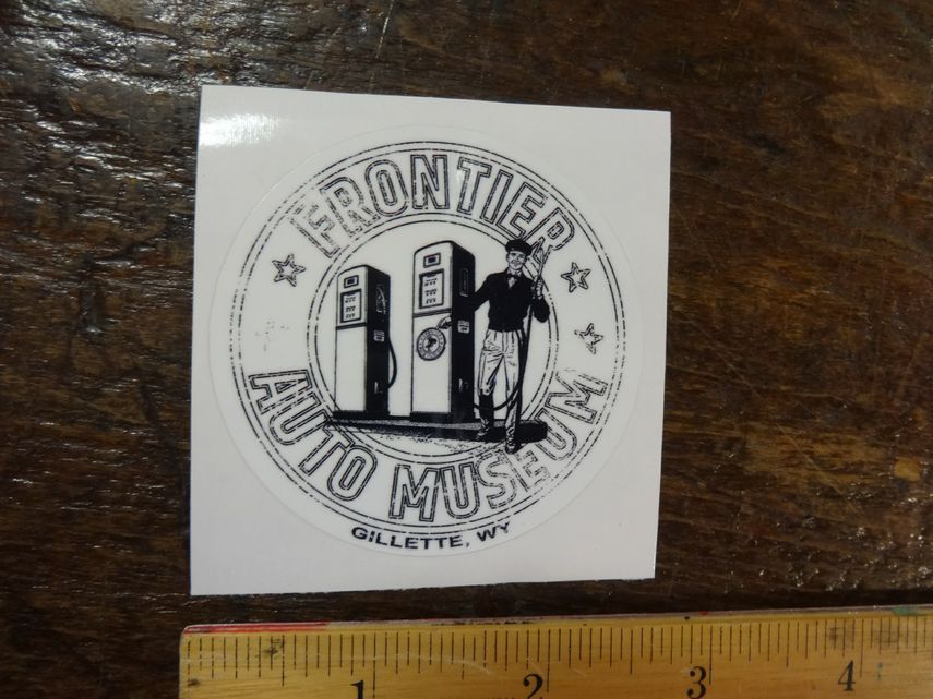 Frontier Auto Museum Gas Pump Guy Decal / Sticker, souvenir of Frontier Auto Museum in Gillette, Wyoming.