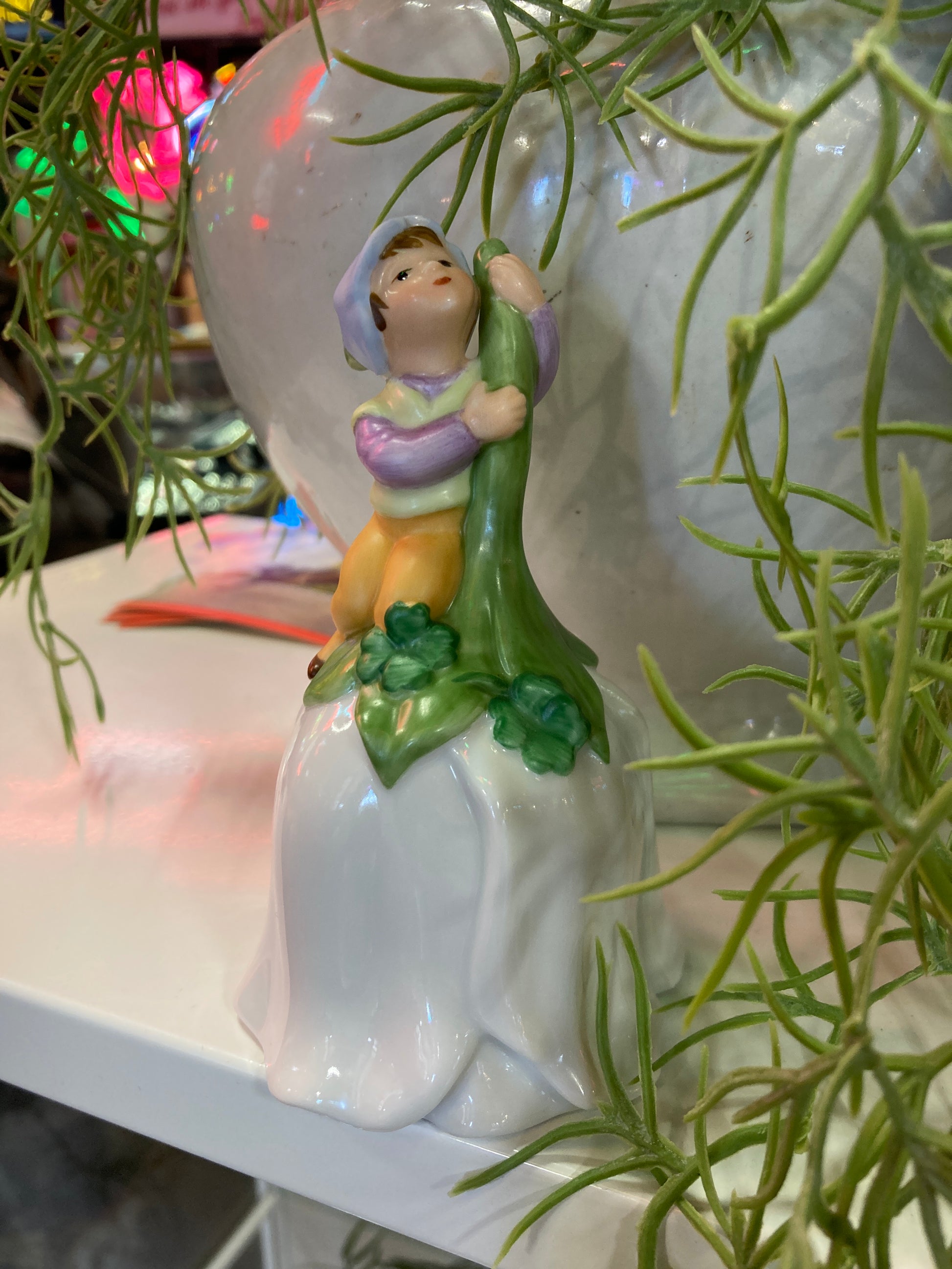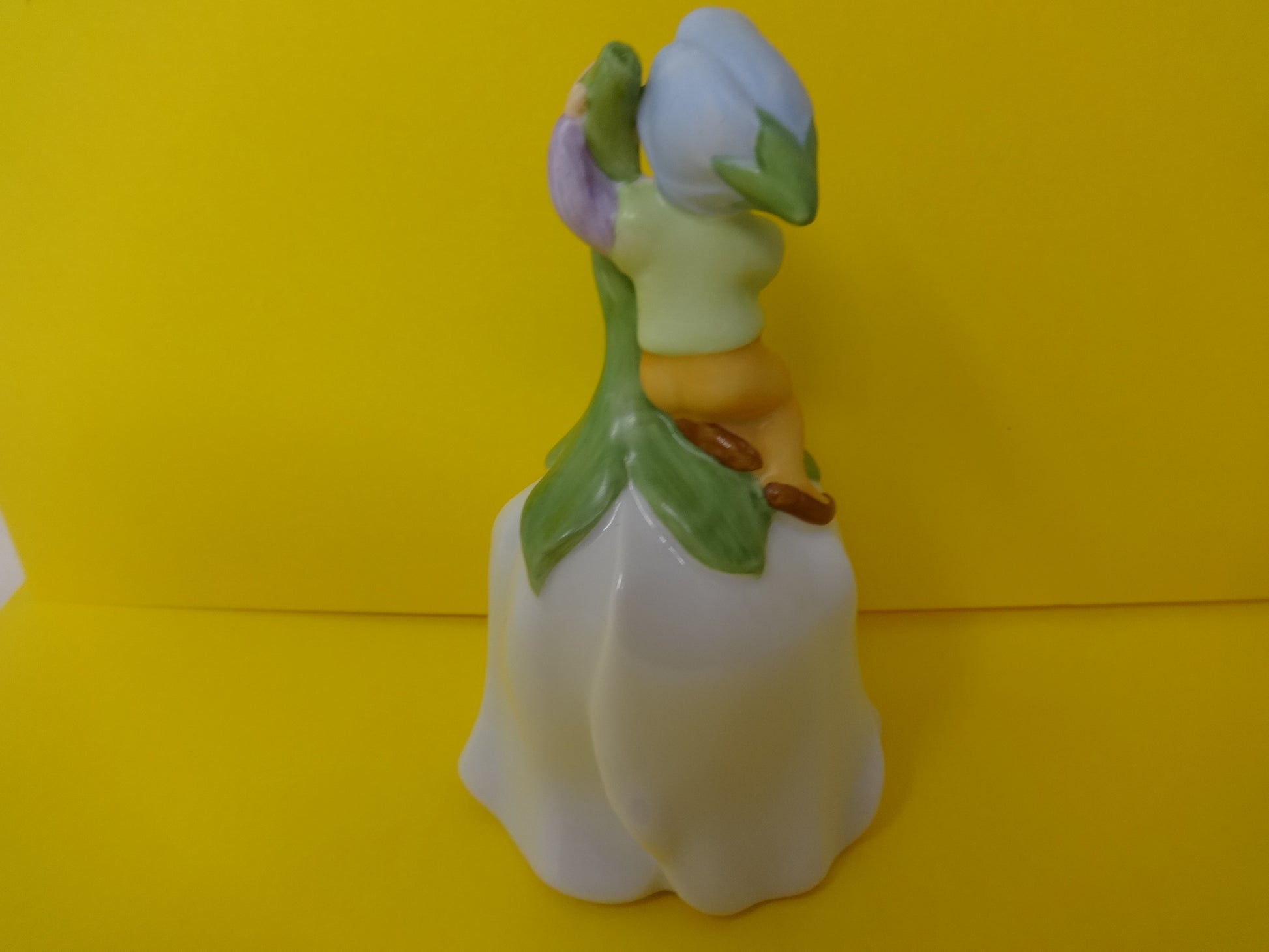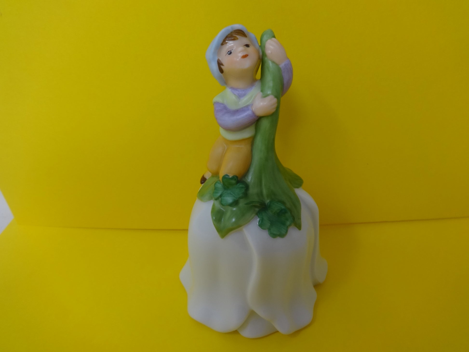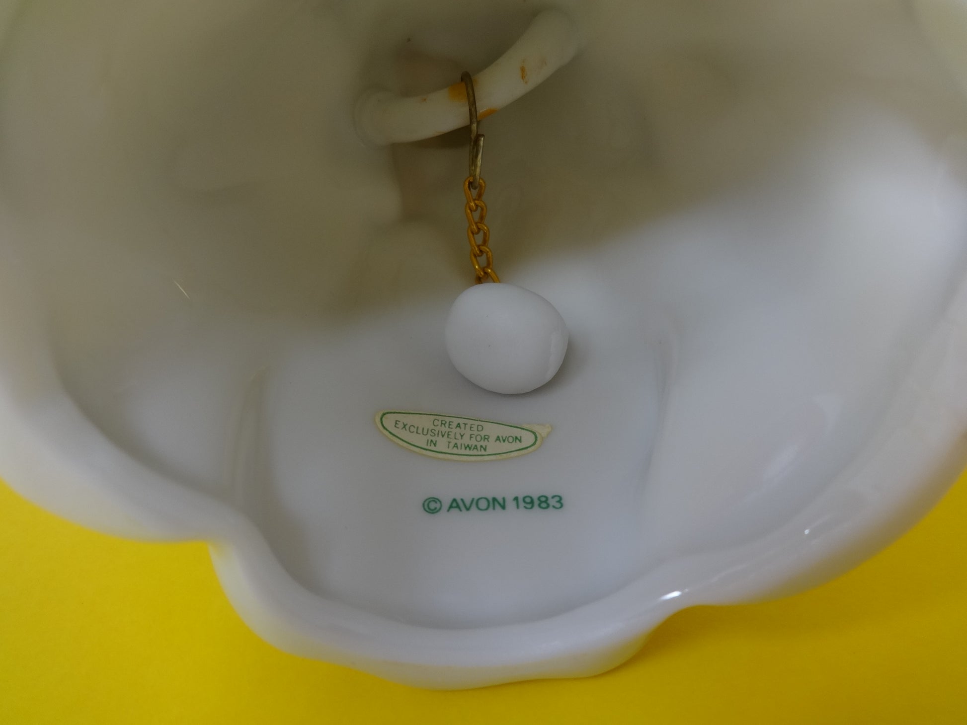 White Porcelain Jack and the Beanstalk bell features a tiny Jack looking skyward, standing on a white upside down rose. (Avon 1983) Fair used condition.