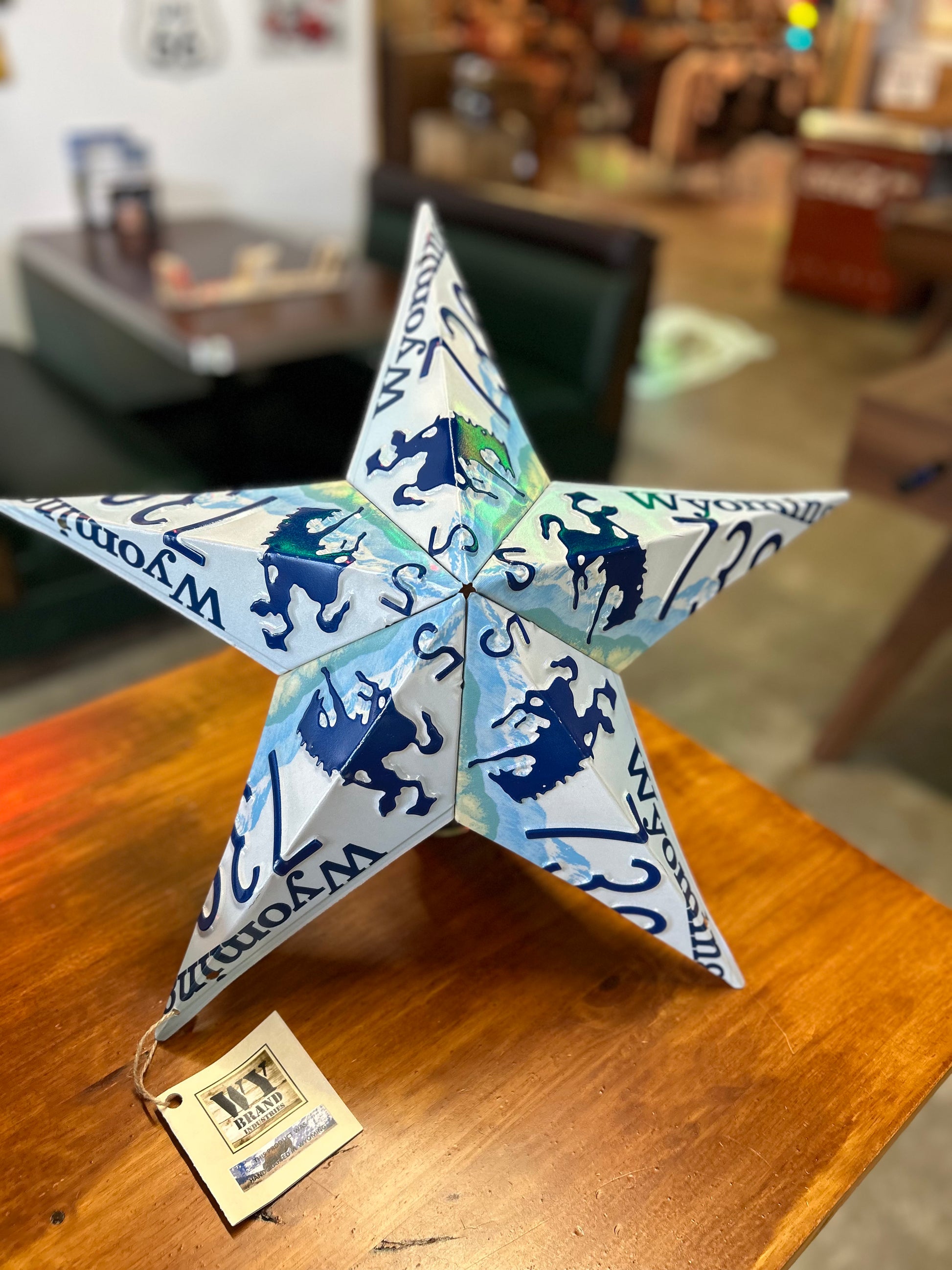 Made in Wyoming by Wyoming Brand Industries, Embossed License Plate Large Barn Star 24in Wide, Made from real Wyoming License Plates. Take home a piece of Wyoming today!
