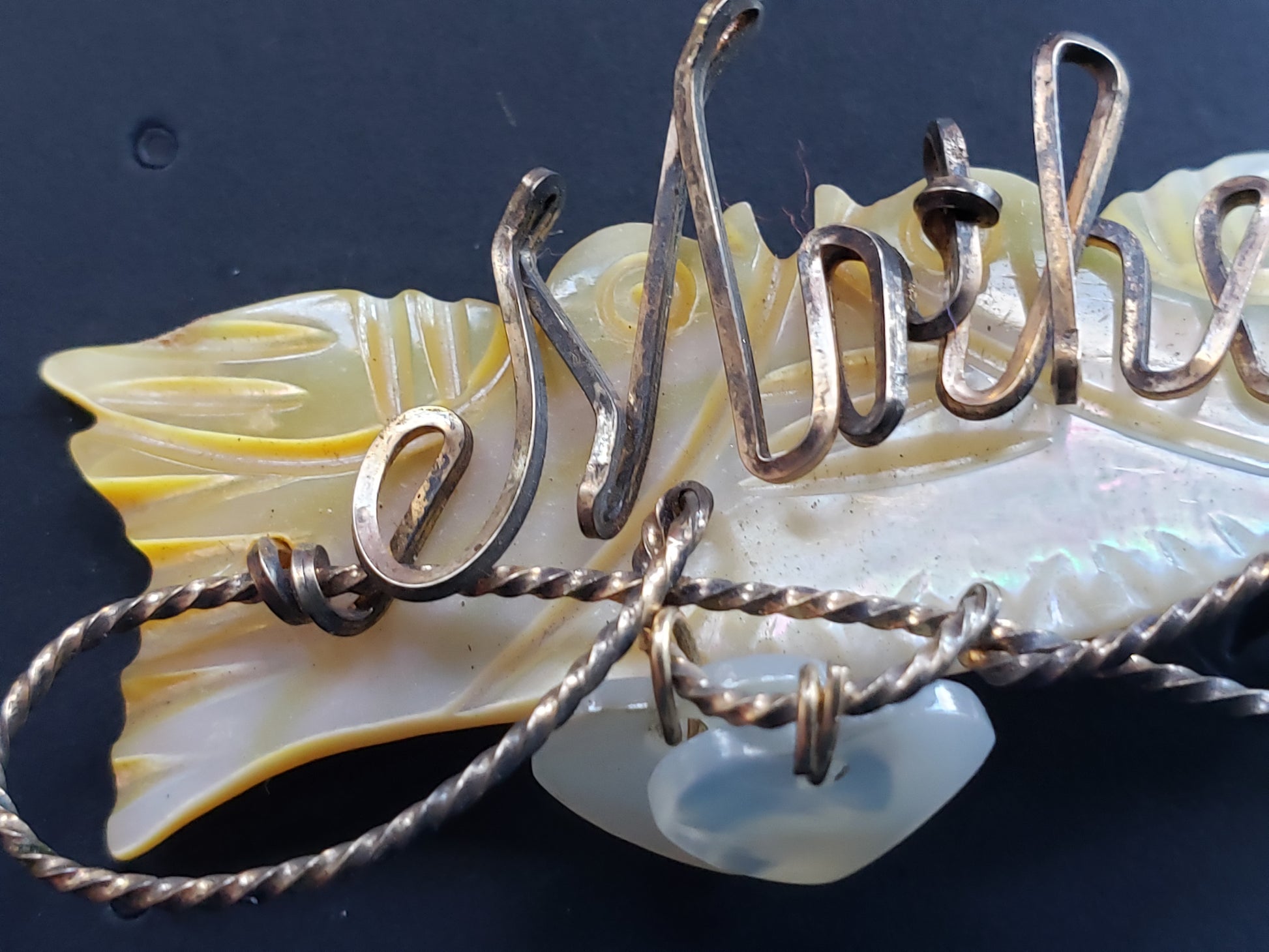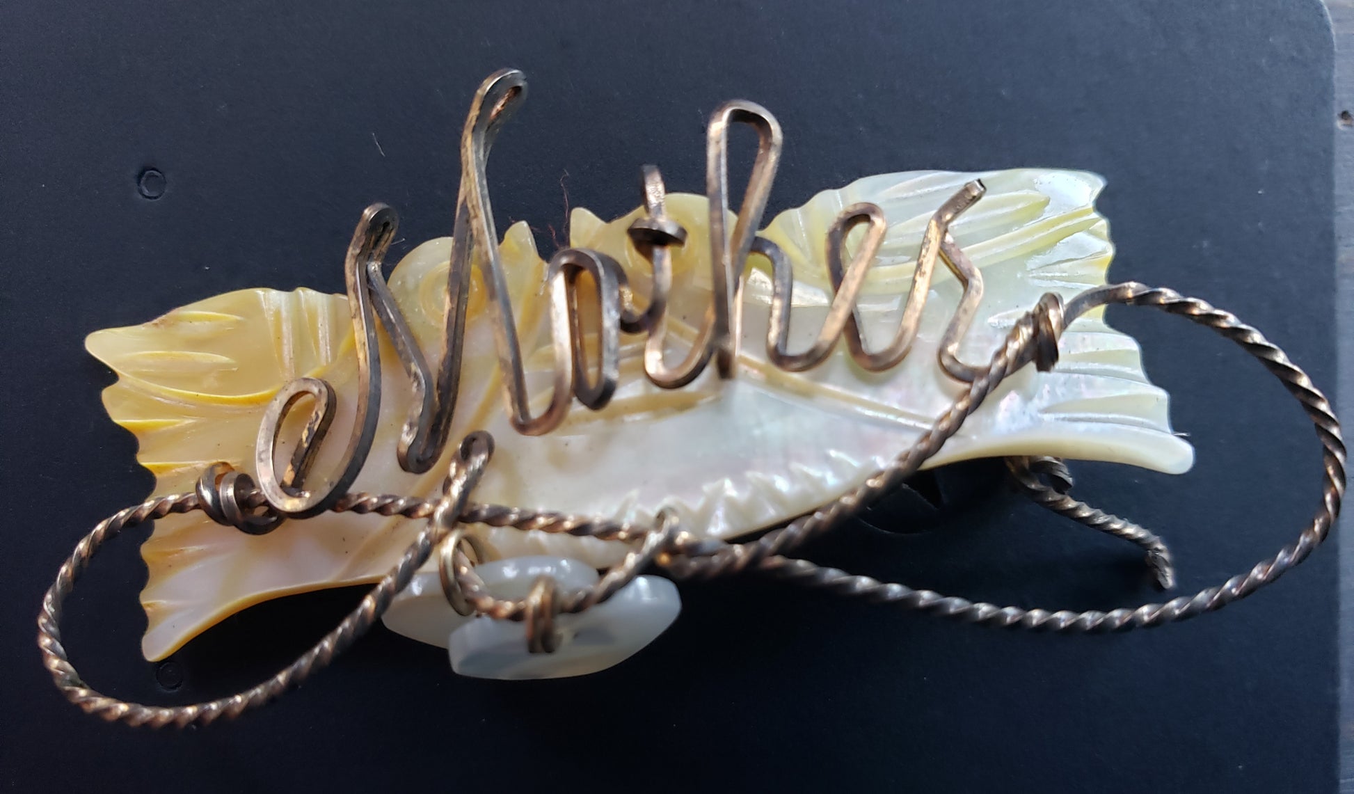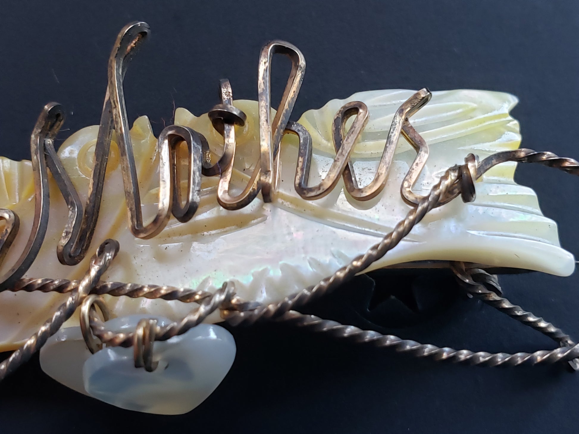This vintage Mother of Pearl MOTHER pin features a charming brass lariat adorned with two delicate mother of pearl hearts. The word "MOTHER" is elegantly displayed on a carved mother of pearl background, making it a timeless keepsake that celebrates the special bond with mom. Its classic design and quality materials ensure it will be treasured for years to come. Perfect as a meaningful gift or a unique addition to your collection. Fair vintage condition.